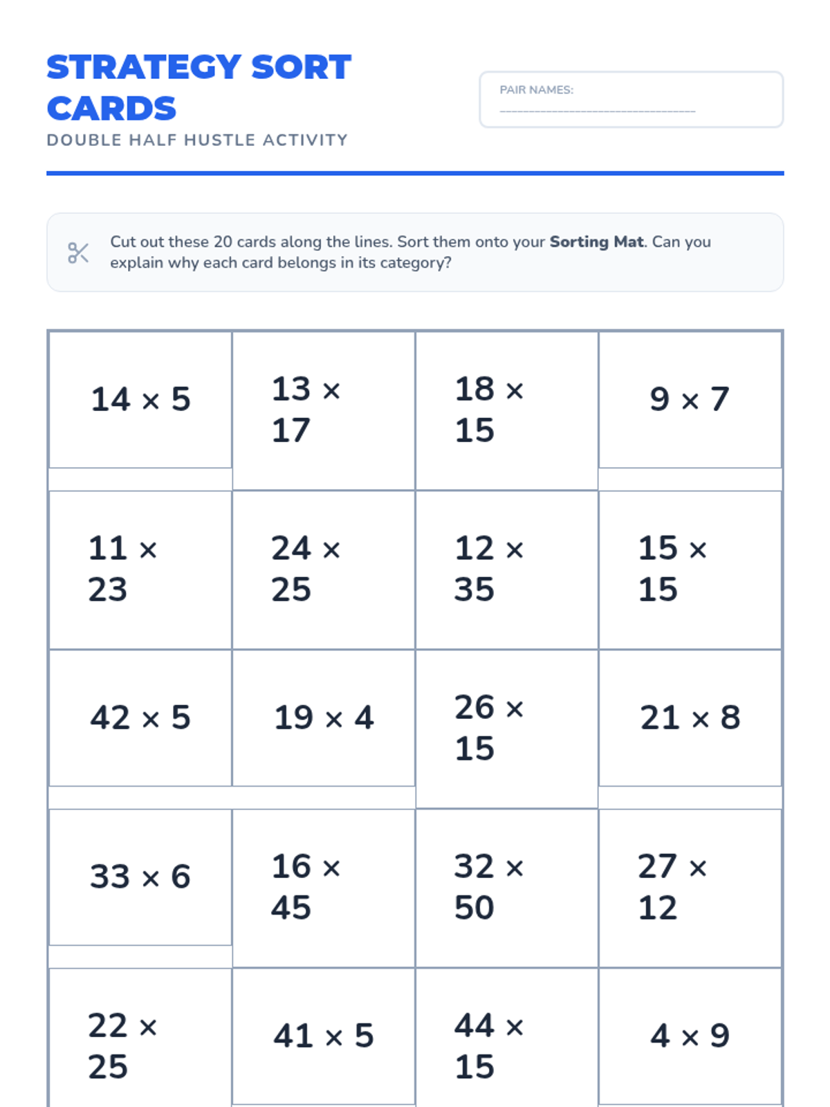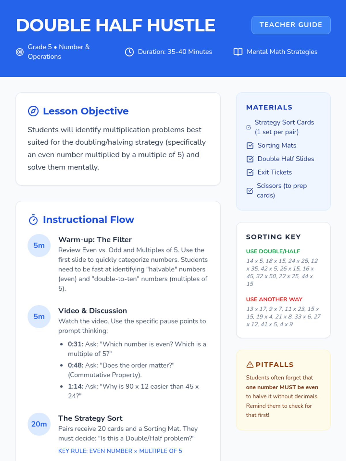 Students will learn and practice the doubling and halving mental math strategy for multiplication, specifically identifying when an even number is multiplied by a multiple of 5. The lesson includes a video-led instruction, a hands-on card sorting activity, and an exit ticket for assessment.