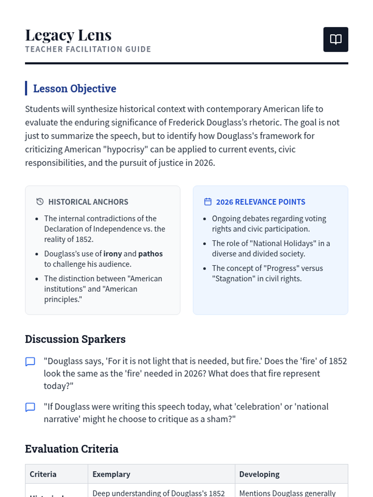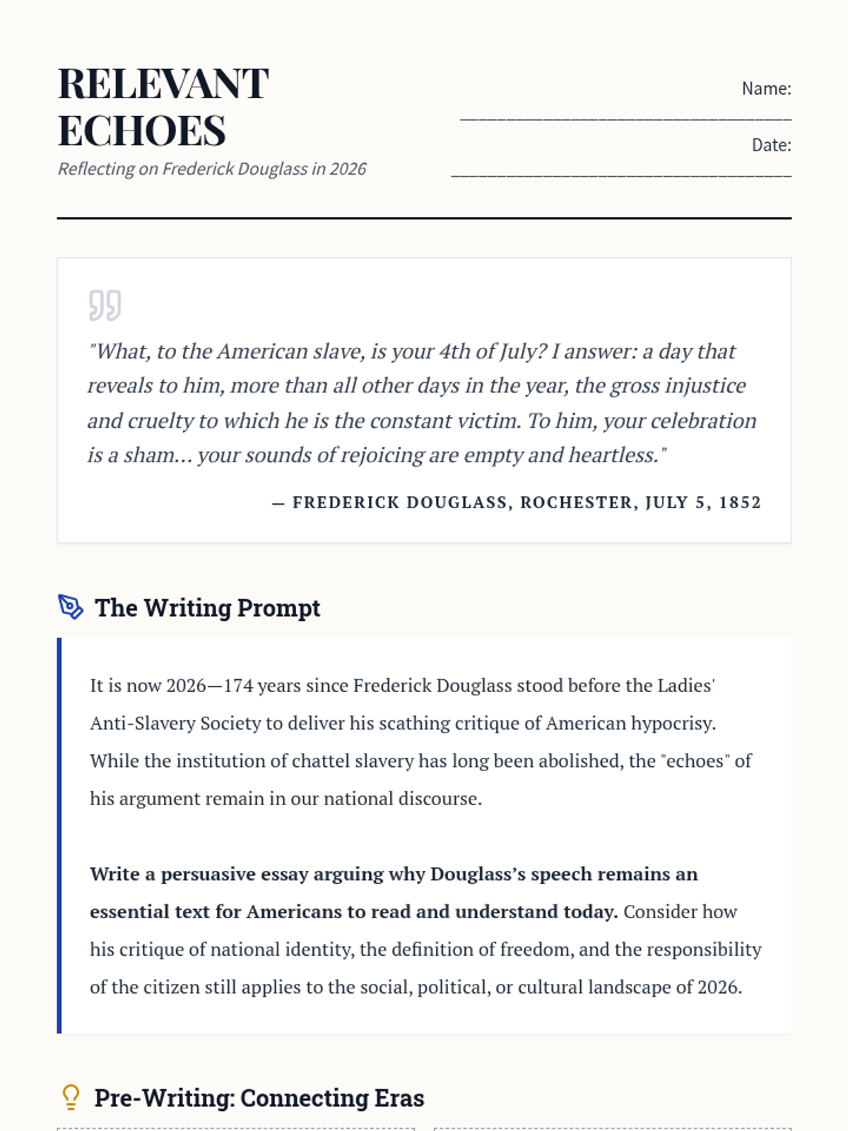 A lesson focused on analyzing Frederick Douglass's 'What to the Slave is the Fourth of July?' through the lens of modern American identity and civil rights in 2026.