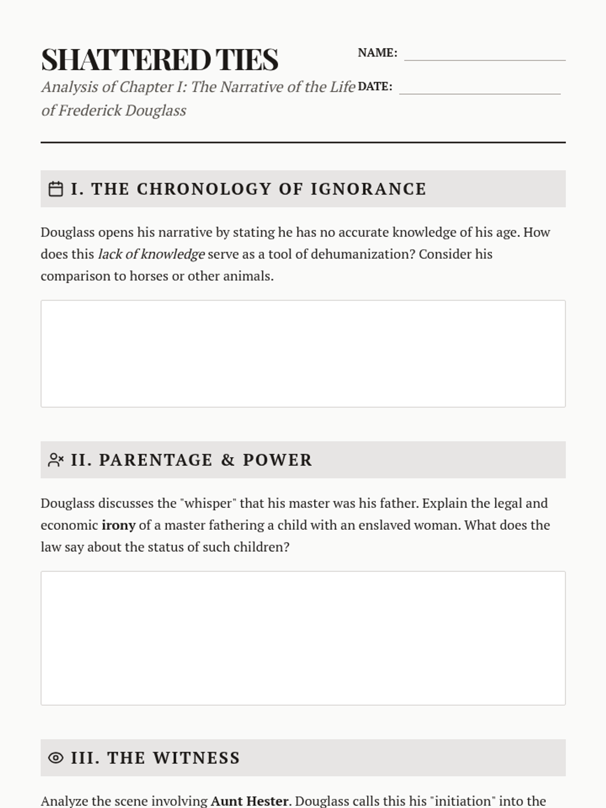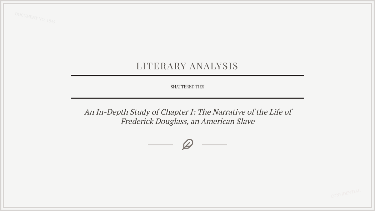 An in-depth exploration of Chapter 1 of Frederick Douglass's narrative, focusing on the erasure of family bonds, the traumatic introduction to violence through Aunt Hester, and the sophisticated use of irony to critique the institution of slavery.