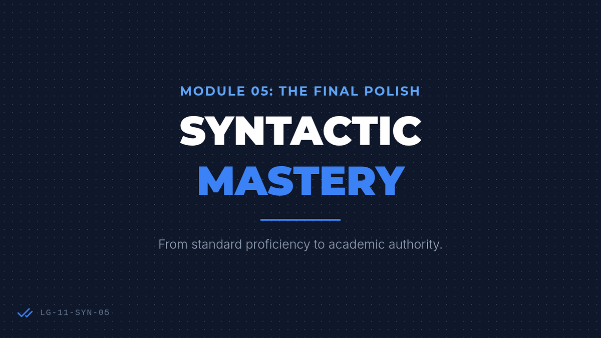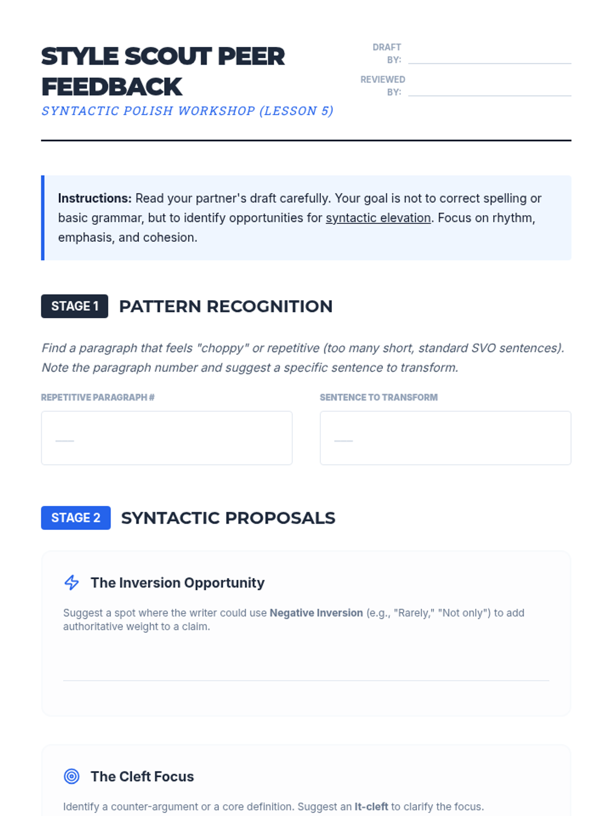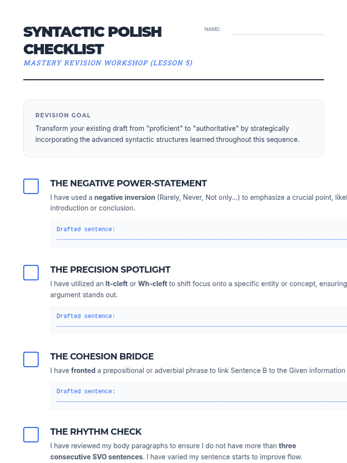 A culminating revision workshop where students apply syntactic techniques to their own drafts to polish their academic voice and authority.