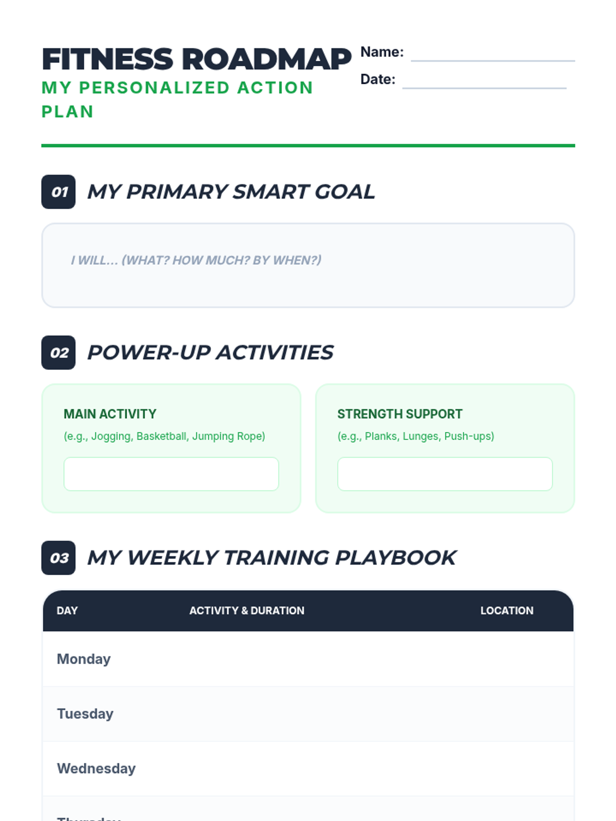 A planning workshop where students select activities and schedule their fitness routines based on their unique baseline data.