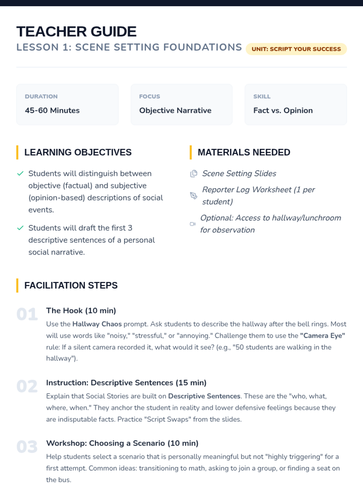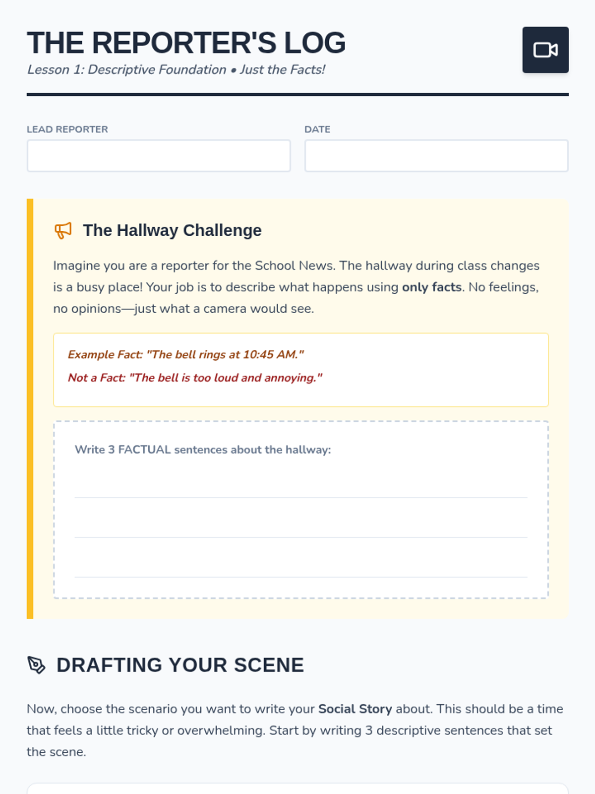 Students learn to lay the groundwork for their social narratives by focusing on objective, factual descriptions of a social situation. They practice distinguishing between facts and opinions to create a non-judgmental foundation for their stories.