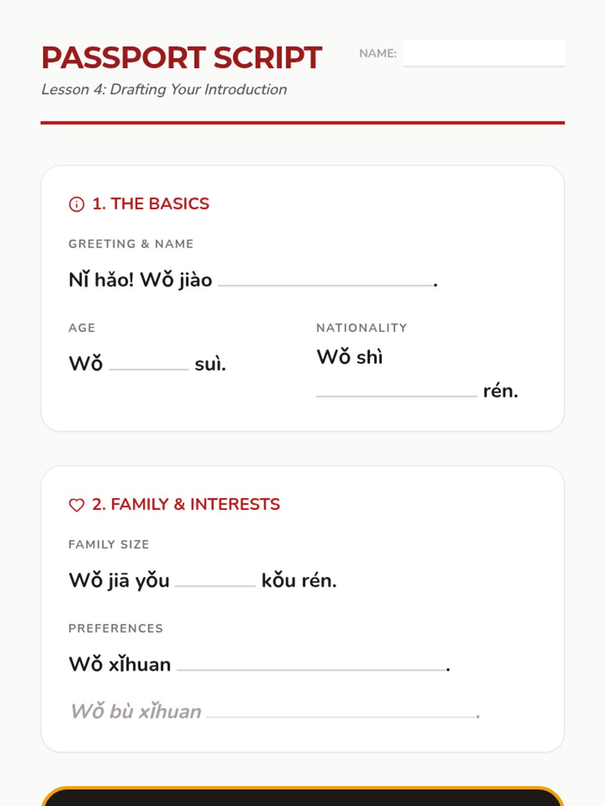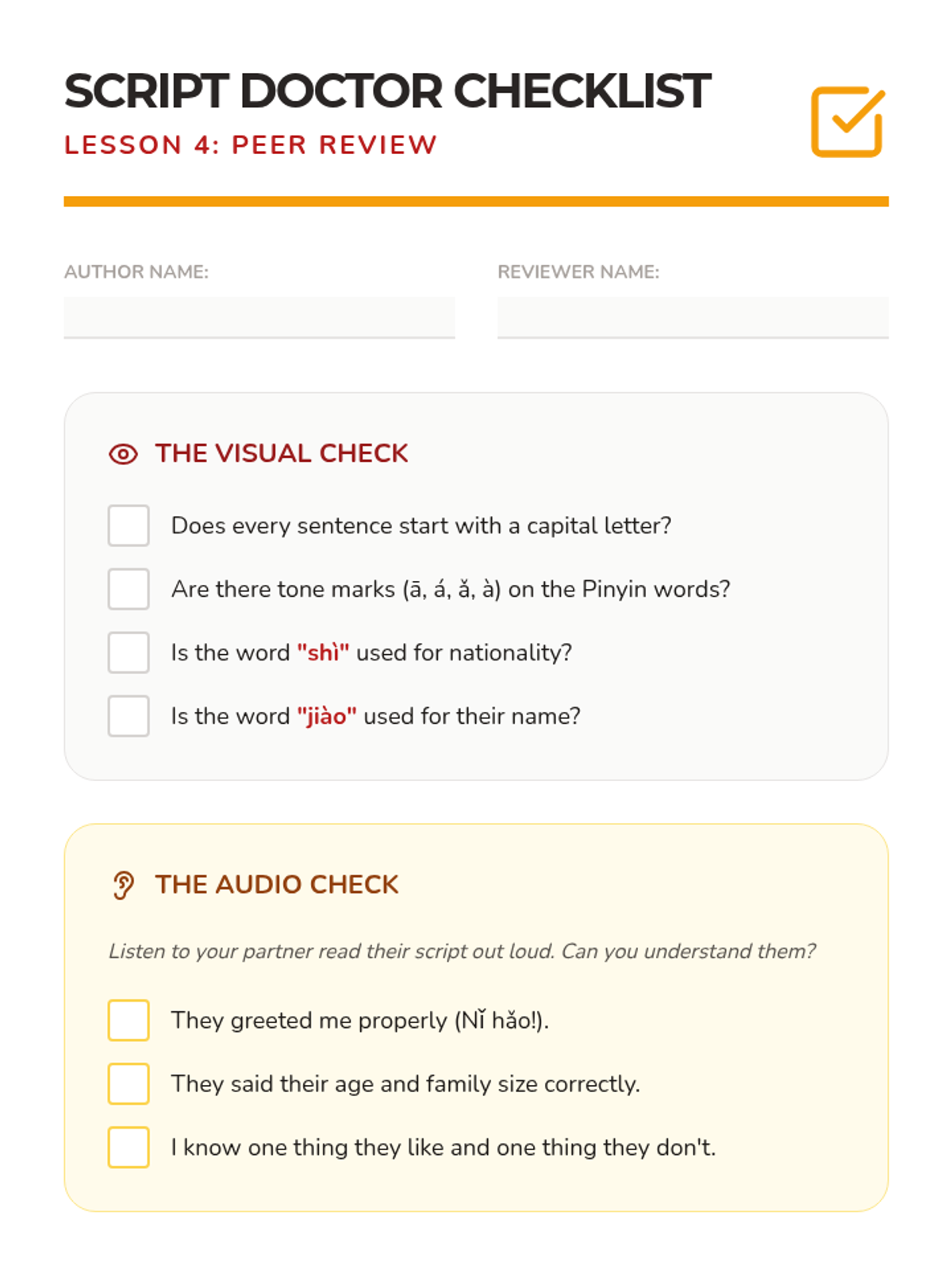 Students write a script combining their name, age, birthday, nationality, family size, and one hobby. Peer editing focuses on word order and tone marks.