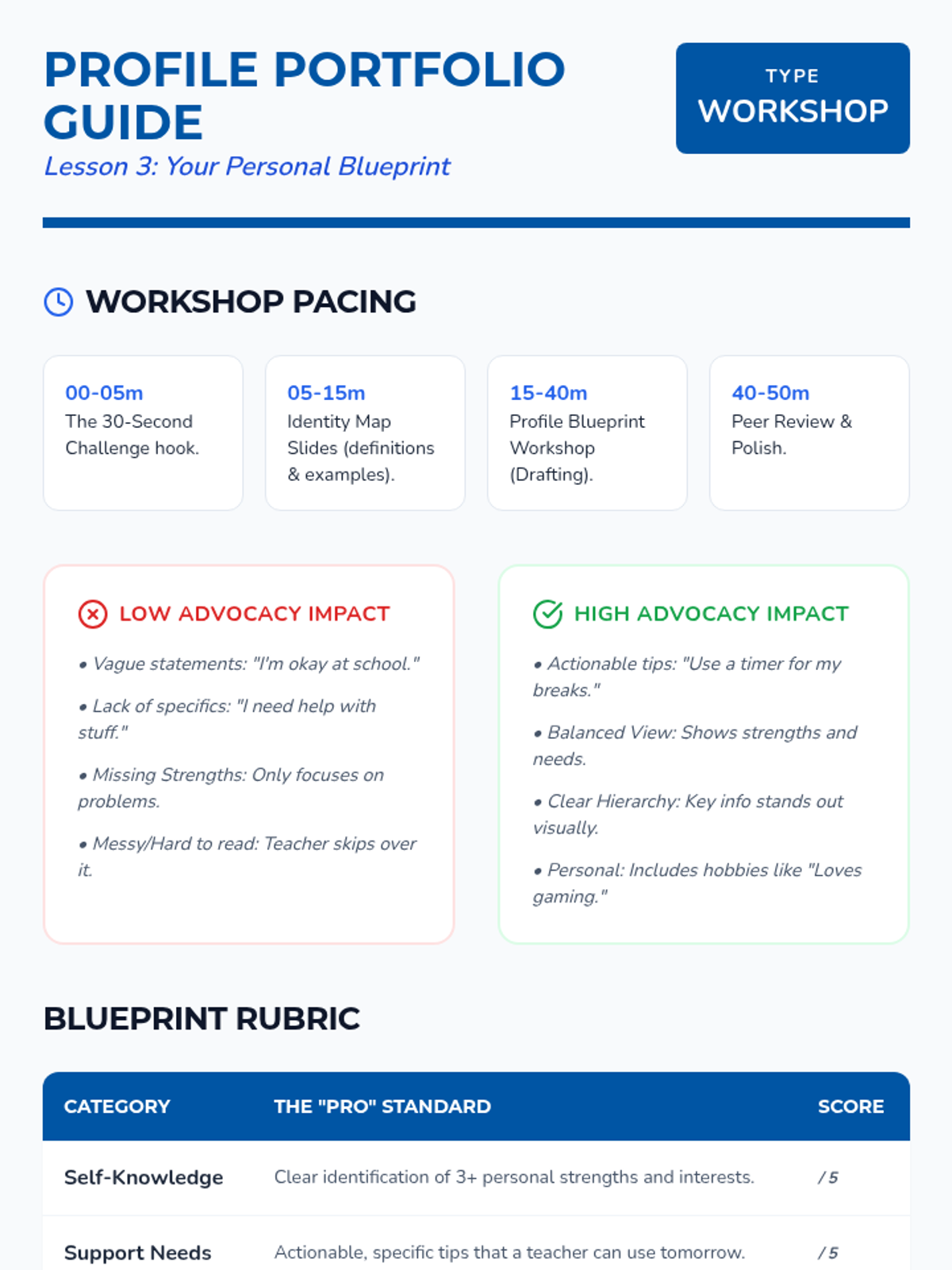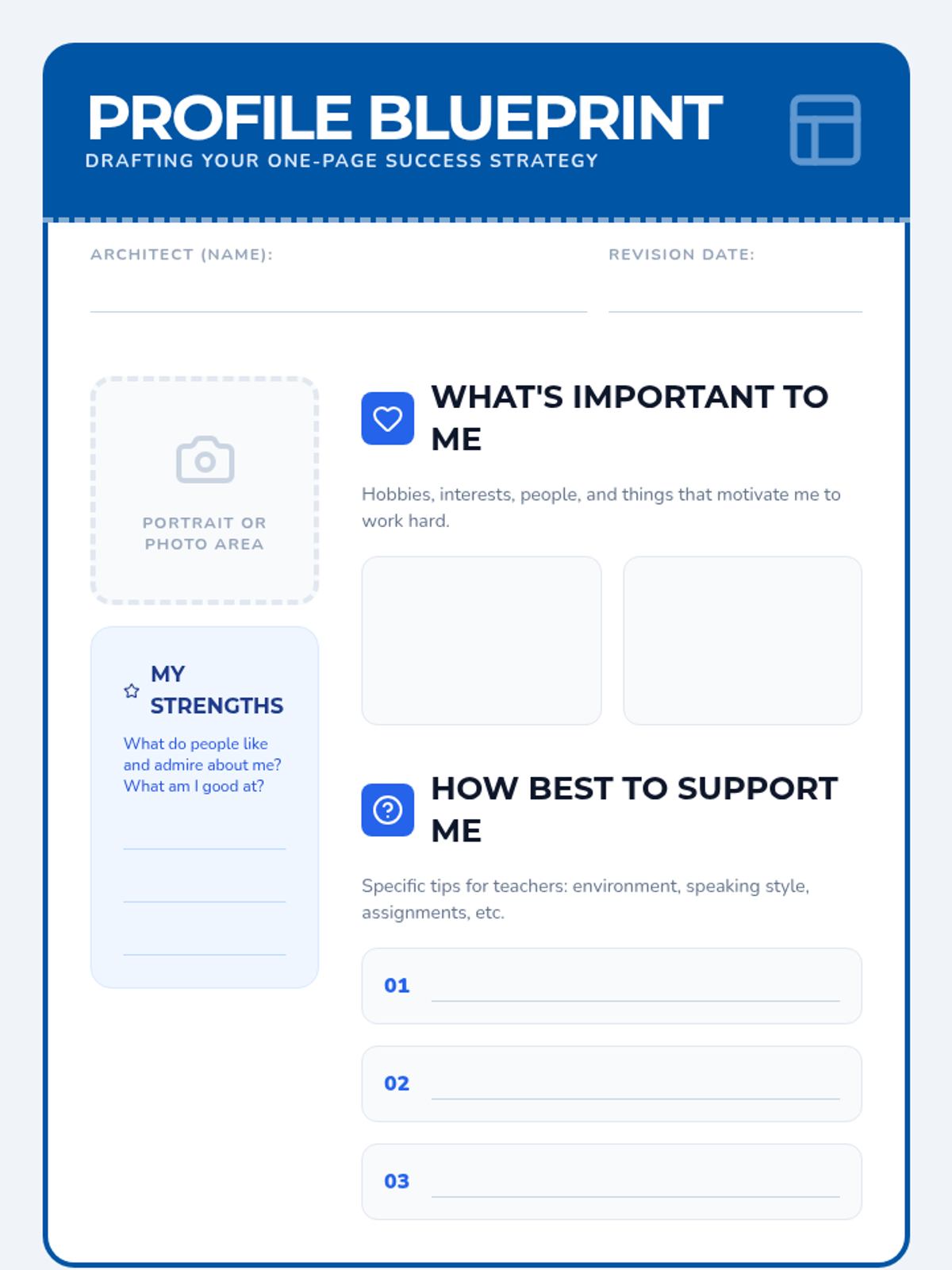 Students design a visual one-page profile that summarizes their strengths, needs, and learning style to share with their IEP team.