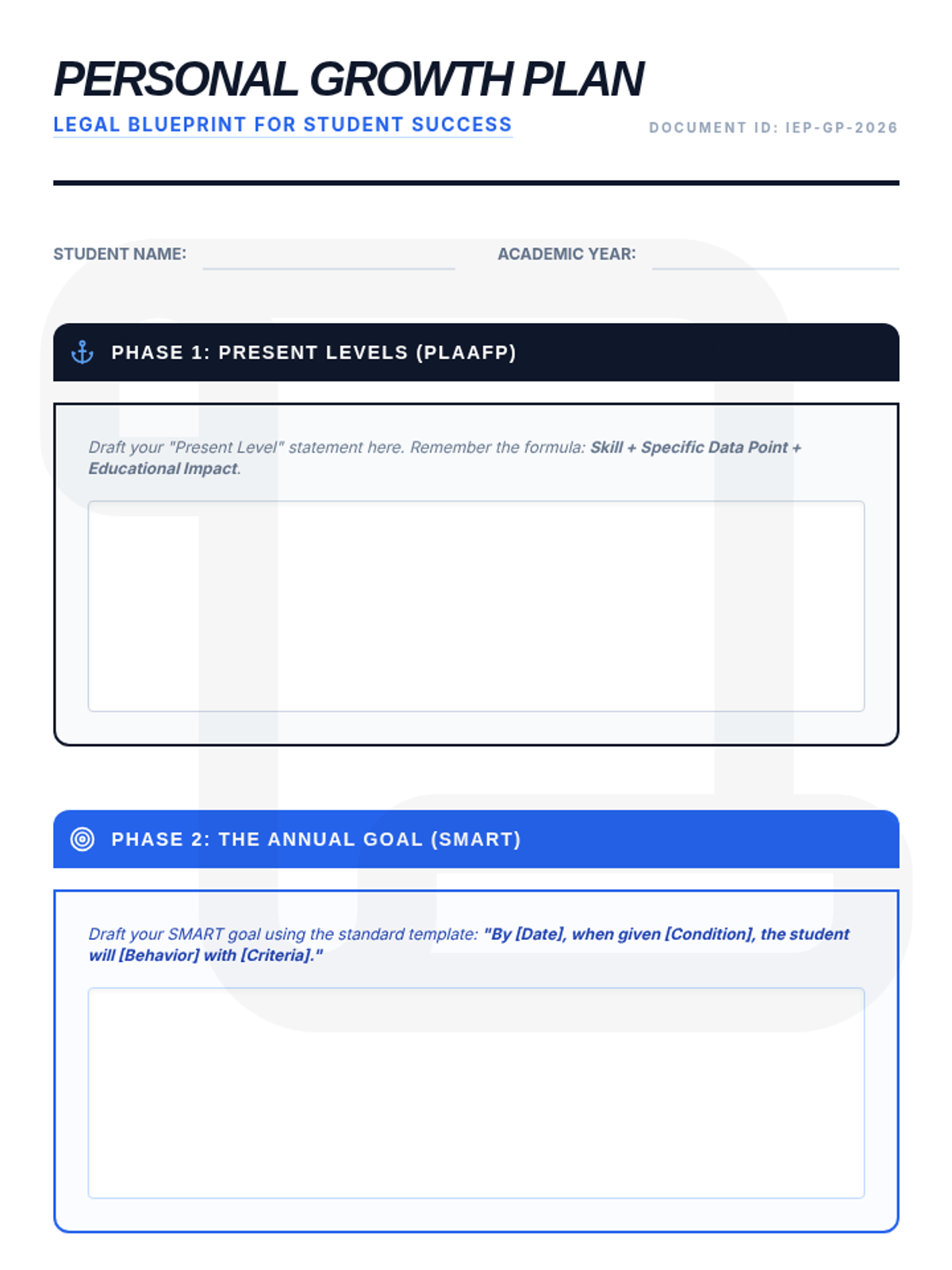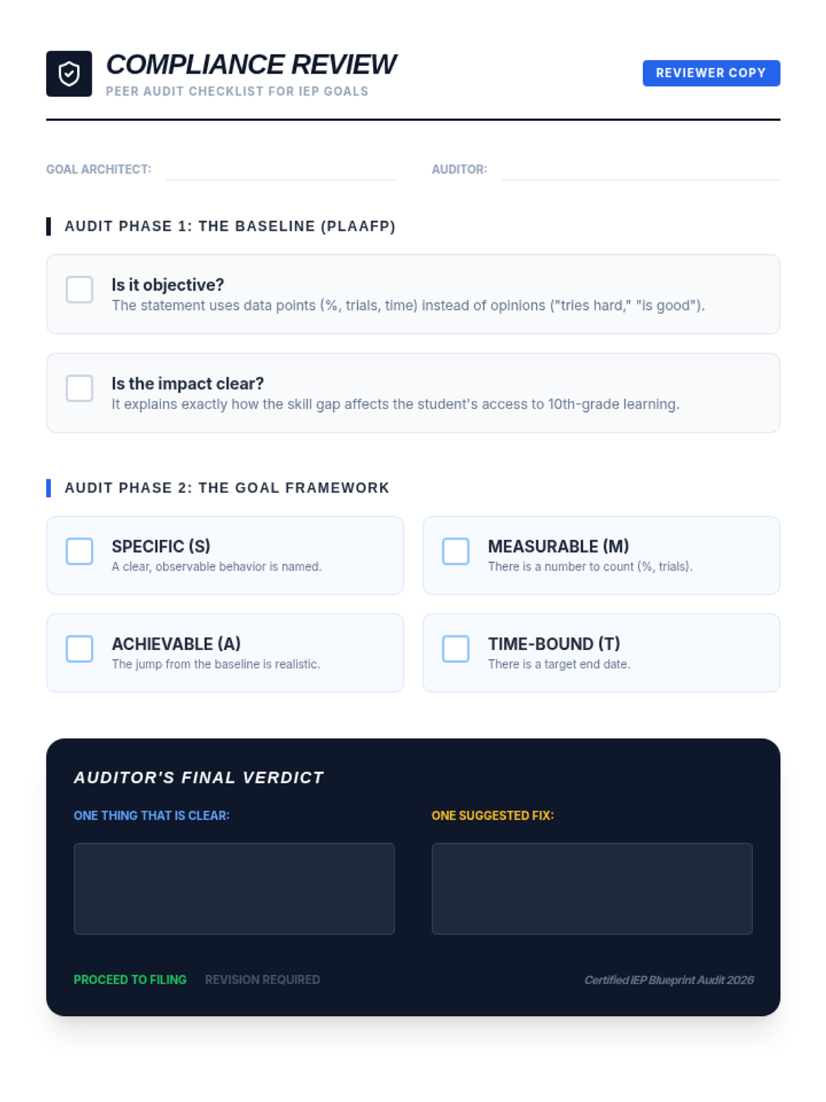 Synthesizing their learning, students draft their own personal learning goals using standard IEP syntax. The lesson concludes with a peer review process to ensure goals are compliant and meaningful.