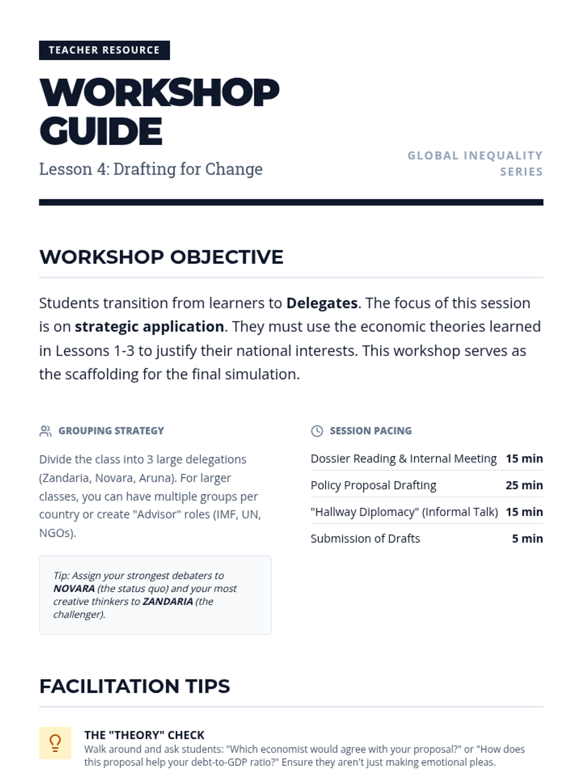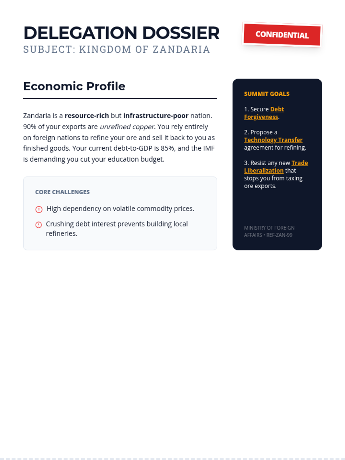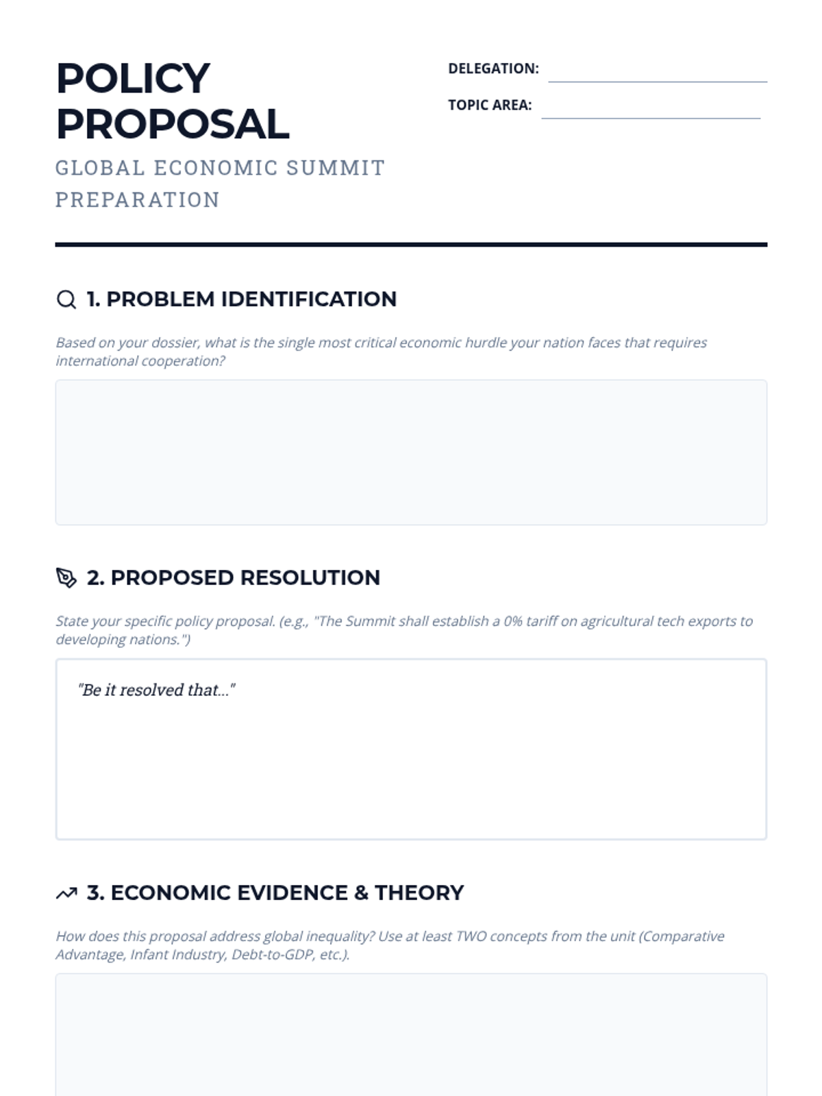 Students work in delegations to draft specific economic policy proposals based on confidential country briefings, preparing for the summit.