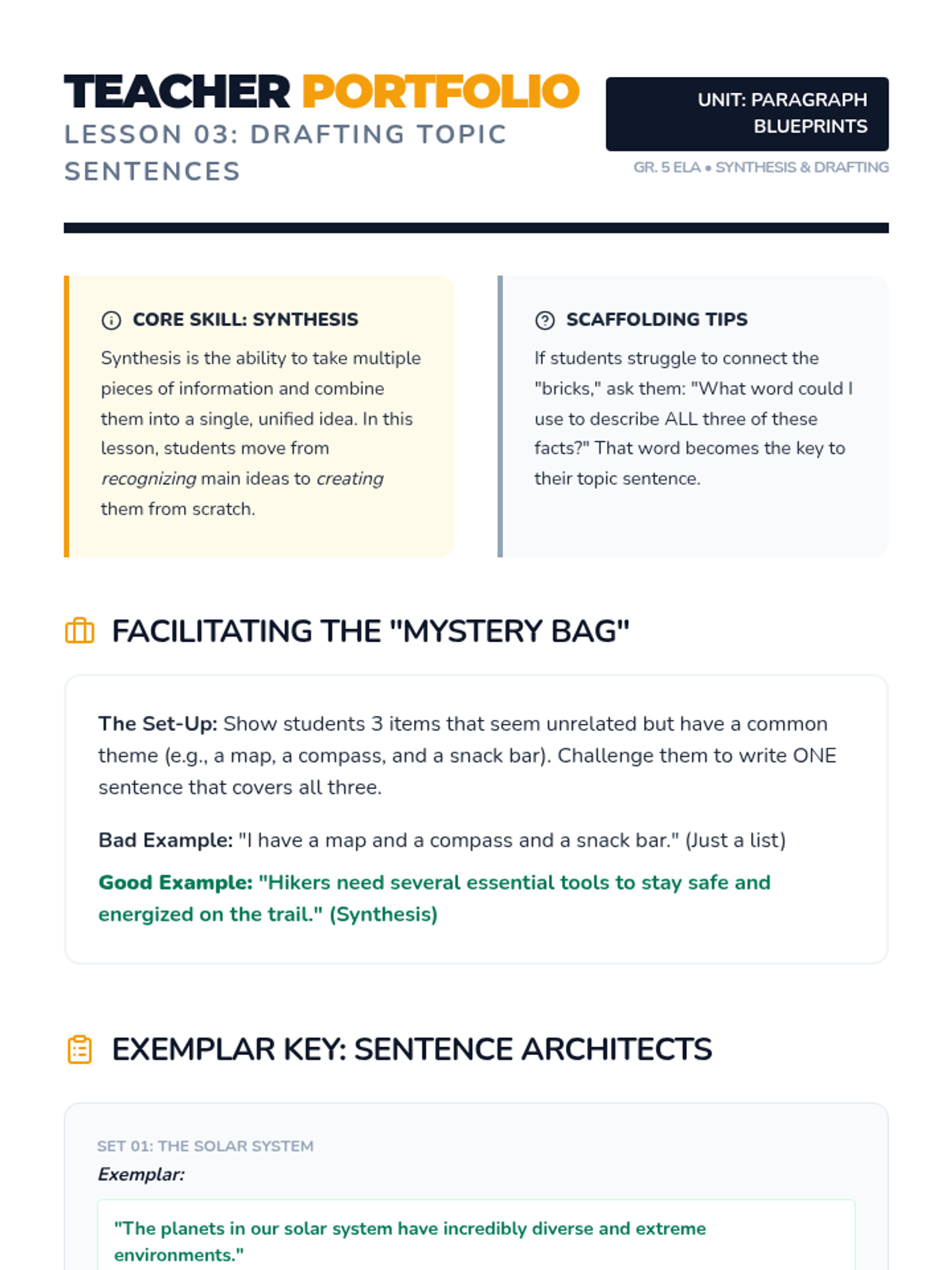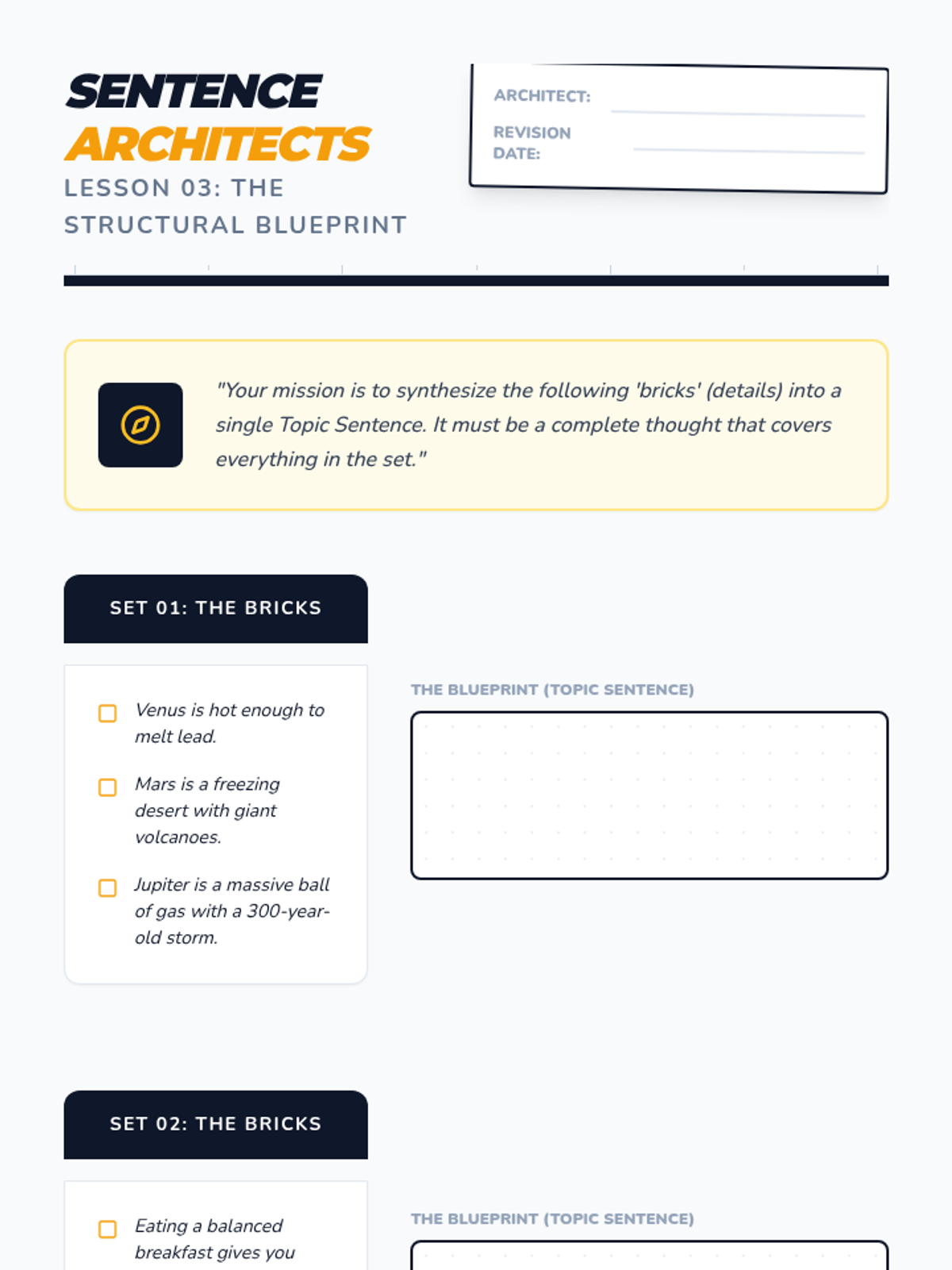 Students are given lists of related facts and must write original topic sentences that encompass those specific details. The focus shifts to writing clear, declarative sentences that make a claim.