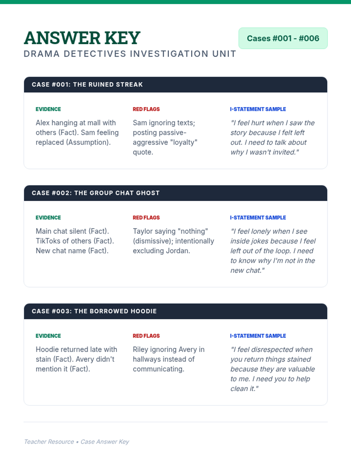 A 45-minute social-emotional learning lesson for middle schoolers focused on identifying the roots of friendship conflict and practicing constructive resolution strategies through a 'detective' lens.