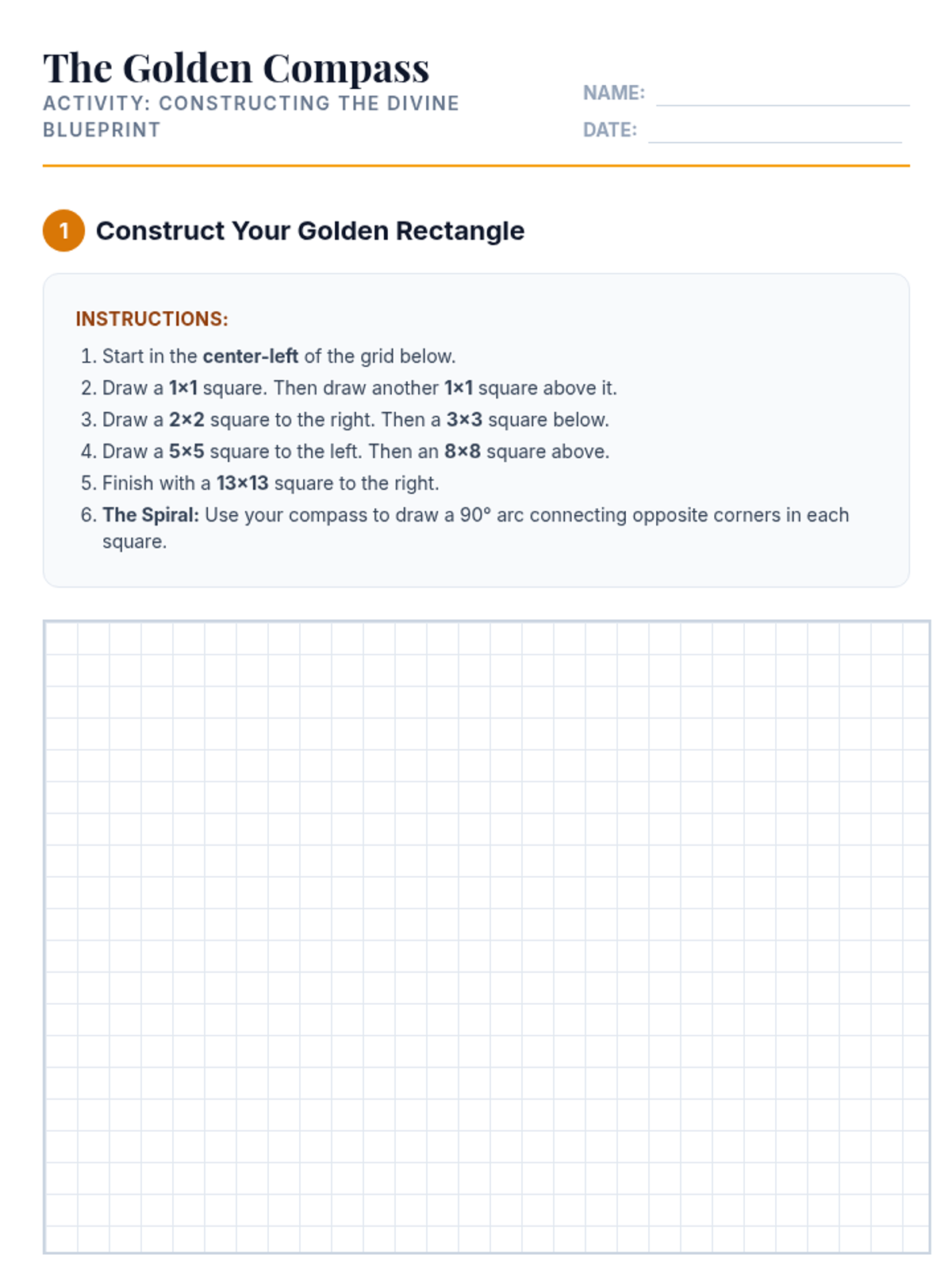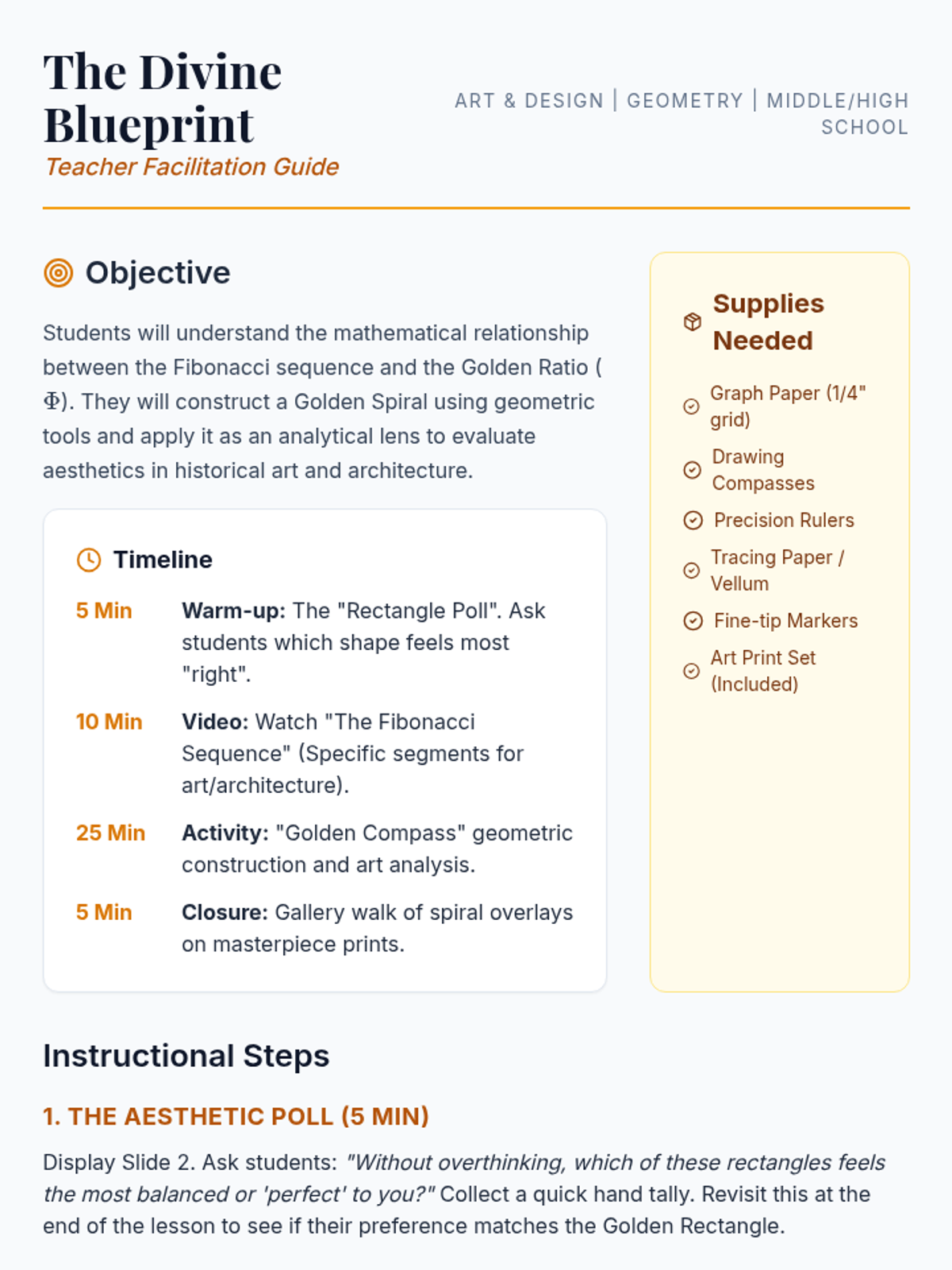 A cross-curricular Art and Geometry lesson where middle/high school students explore the Fibonacci sequence and Golden Ratio to construct a Golden Spiral and analyze classical masterpieces.