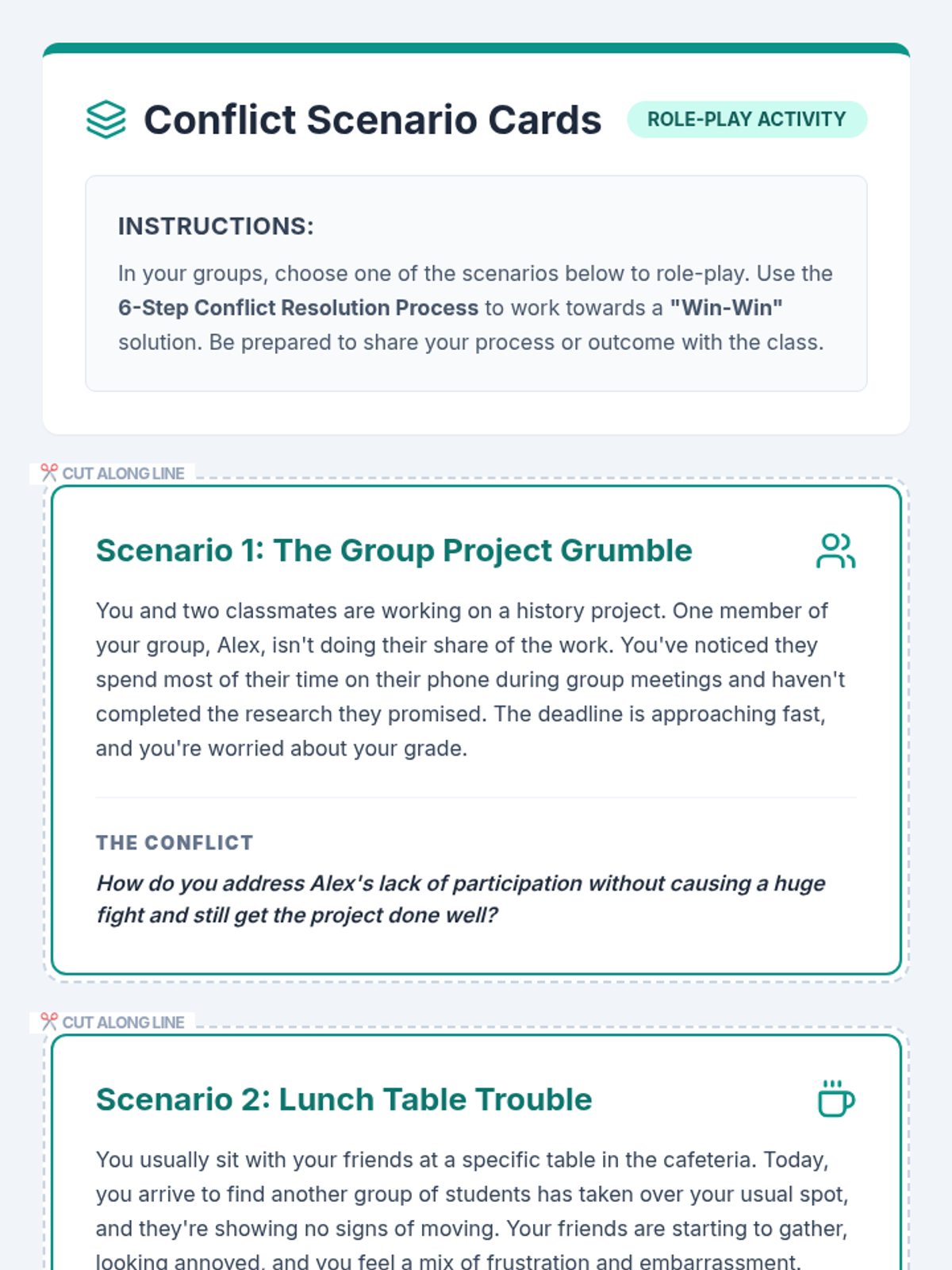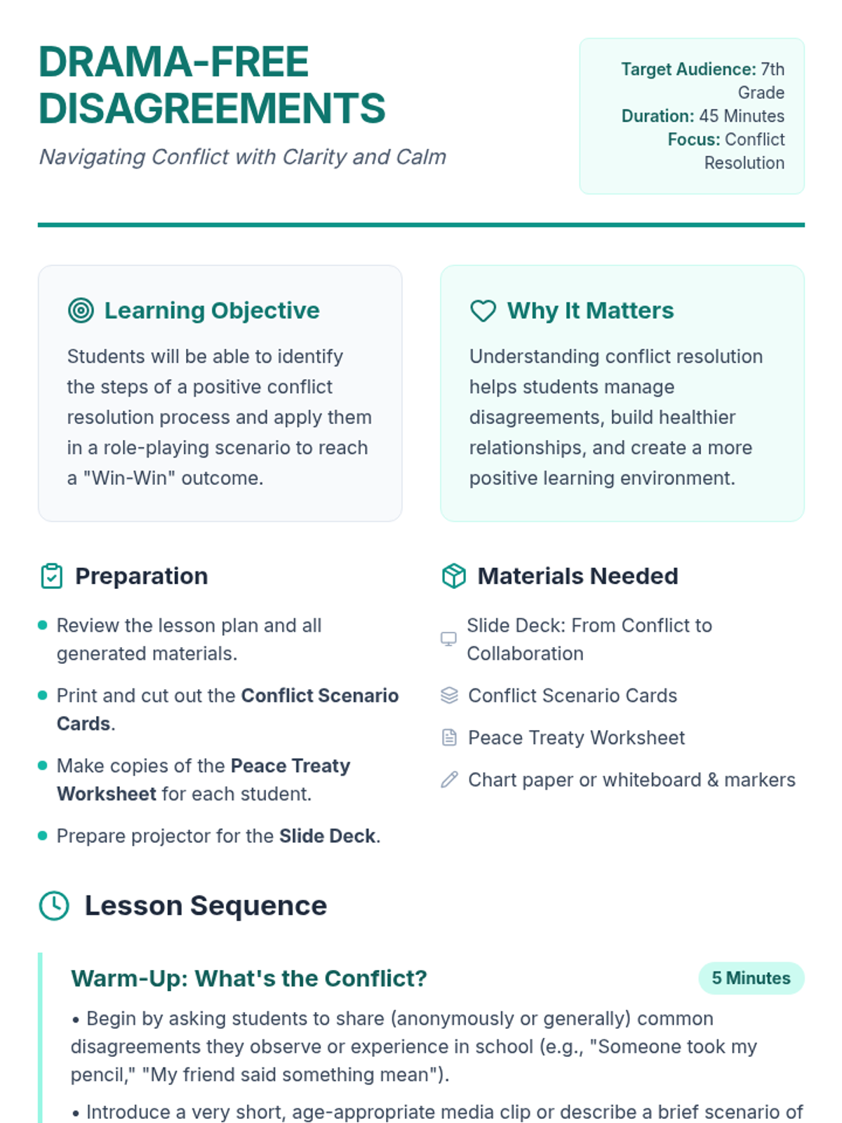 A 45-minute social-emotional learning lesson for 7th graders on navigating conflicts using 'Win-Win' strategies, active listening, and I-statements.
