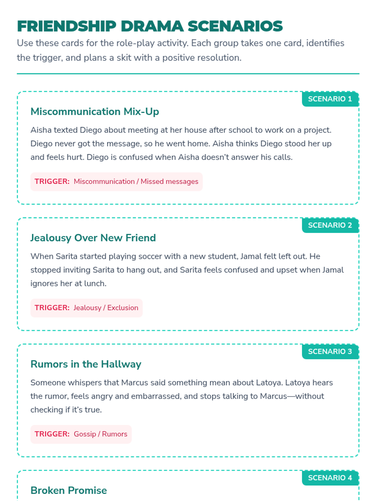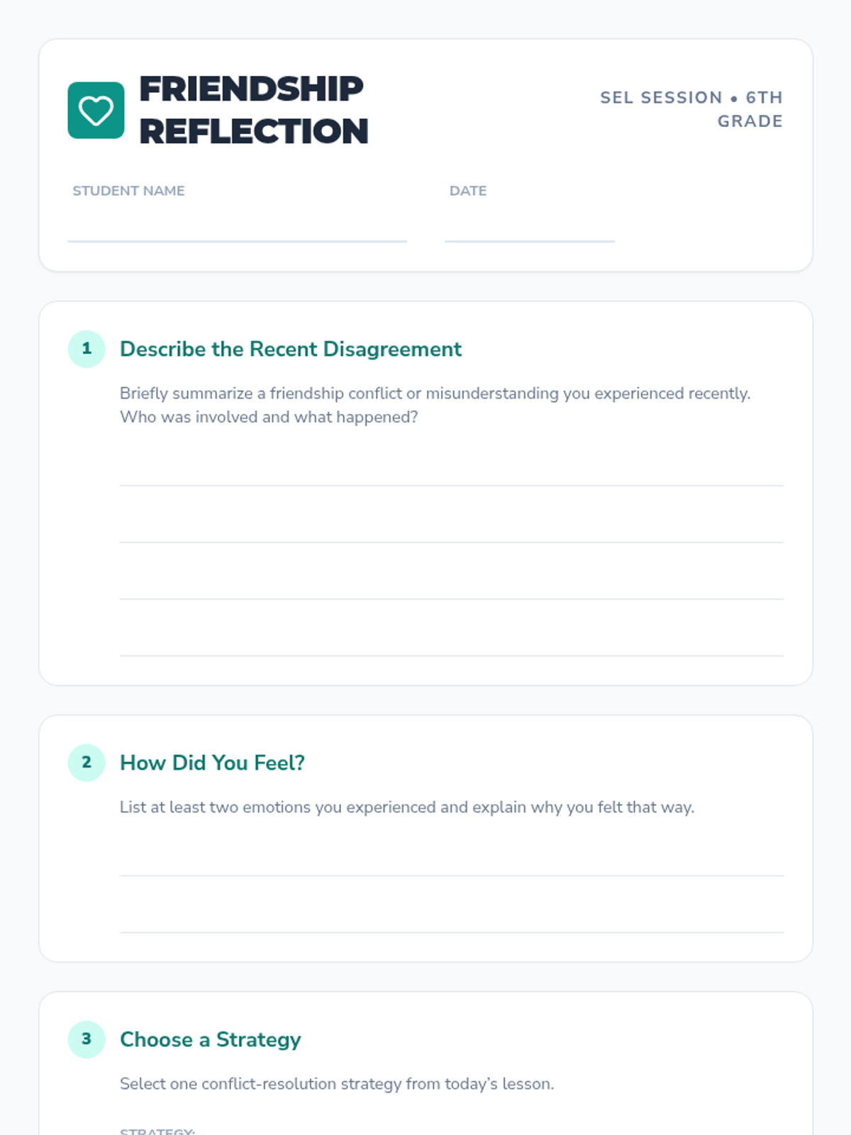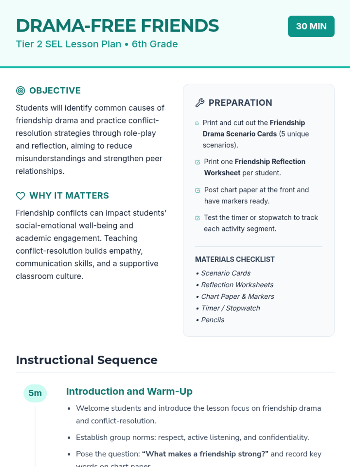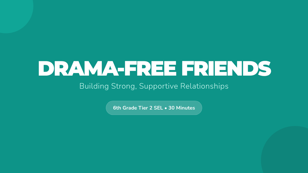 A 30-minute Tier 2 SEL lesson for 6th graders focused on identifying causes of friendship drama and practicing conflict-resolution strategies through role-play and reflection.