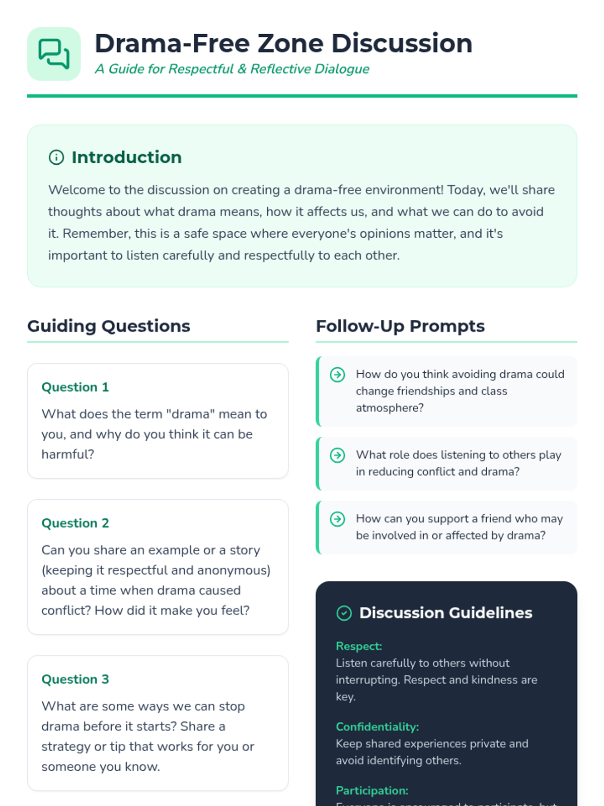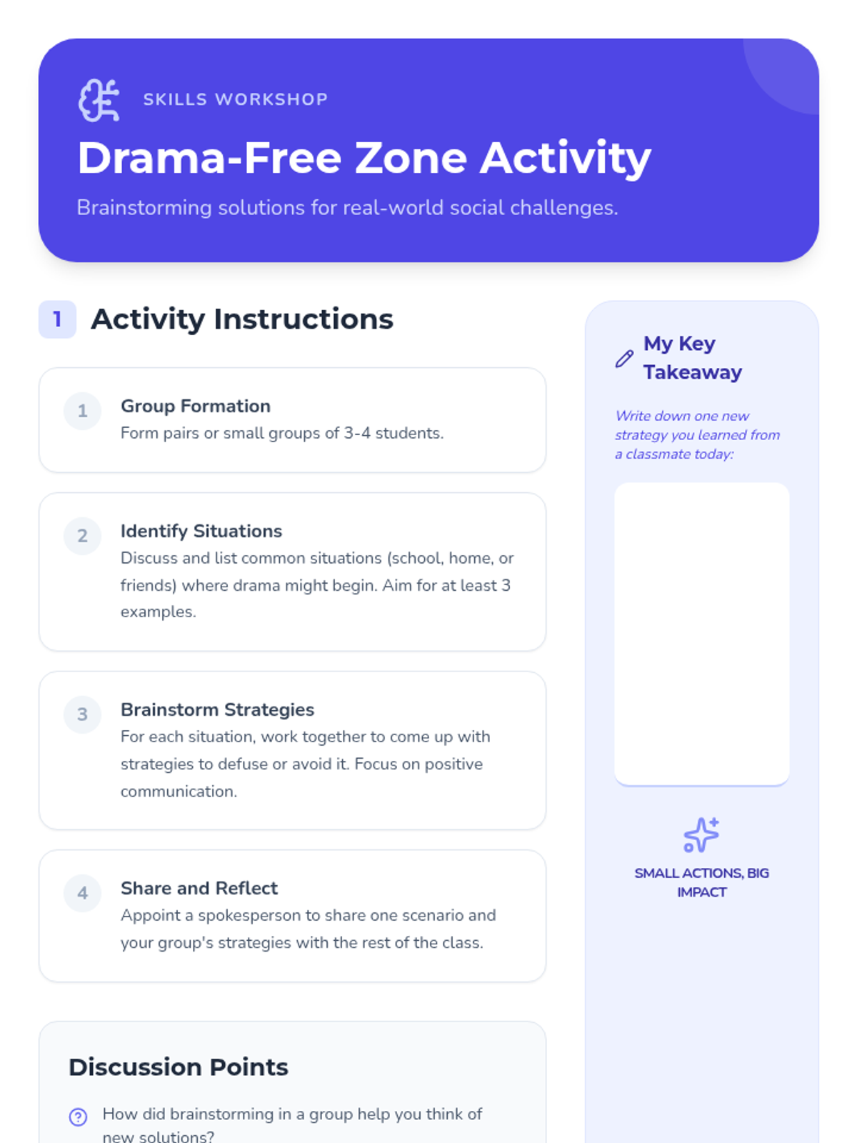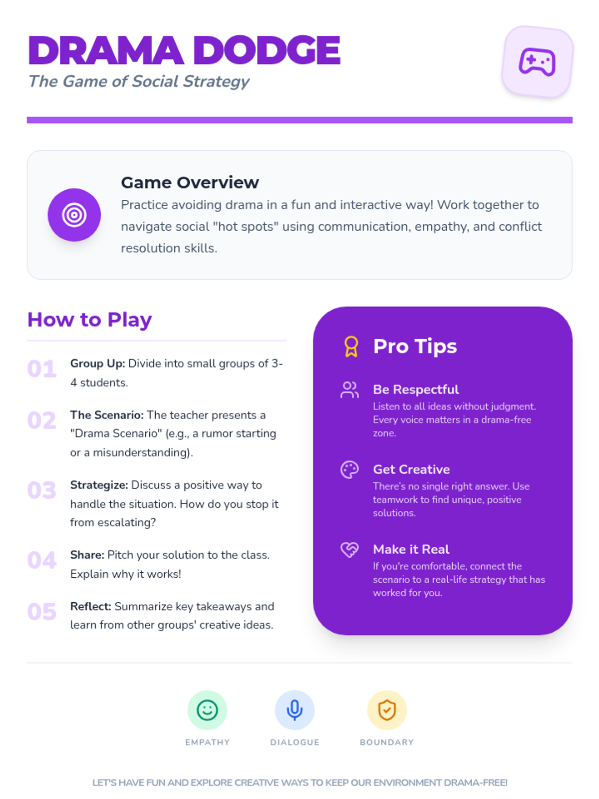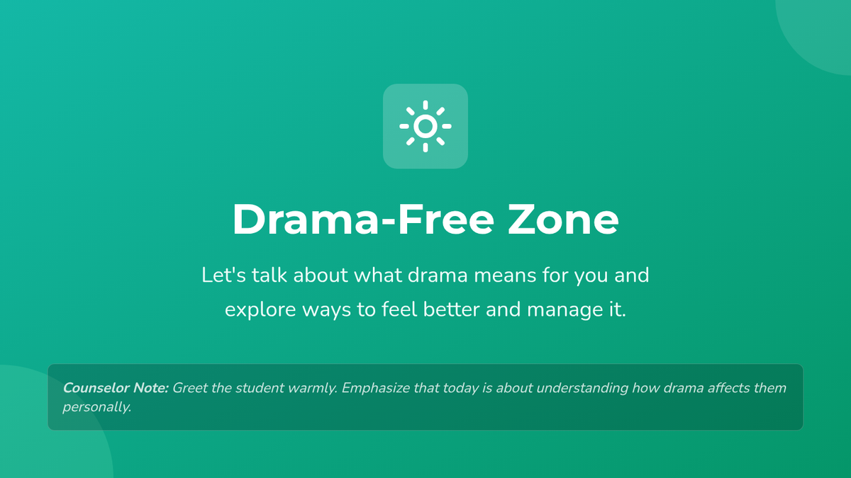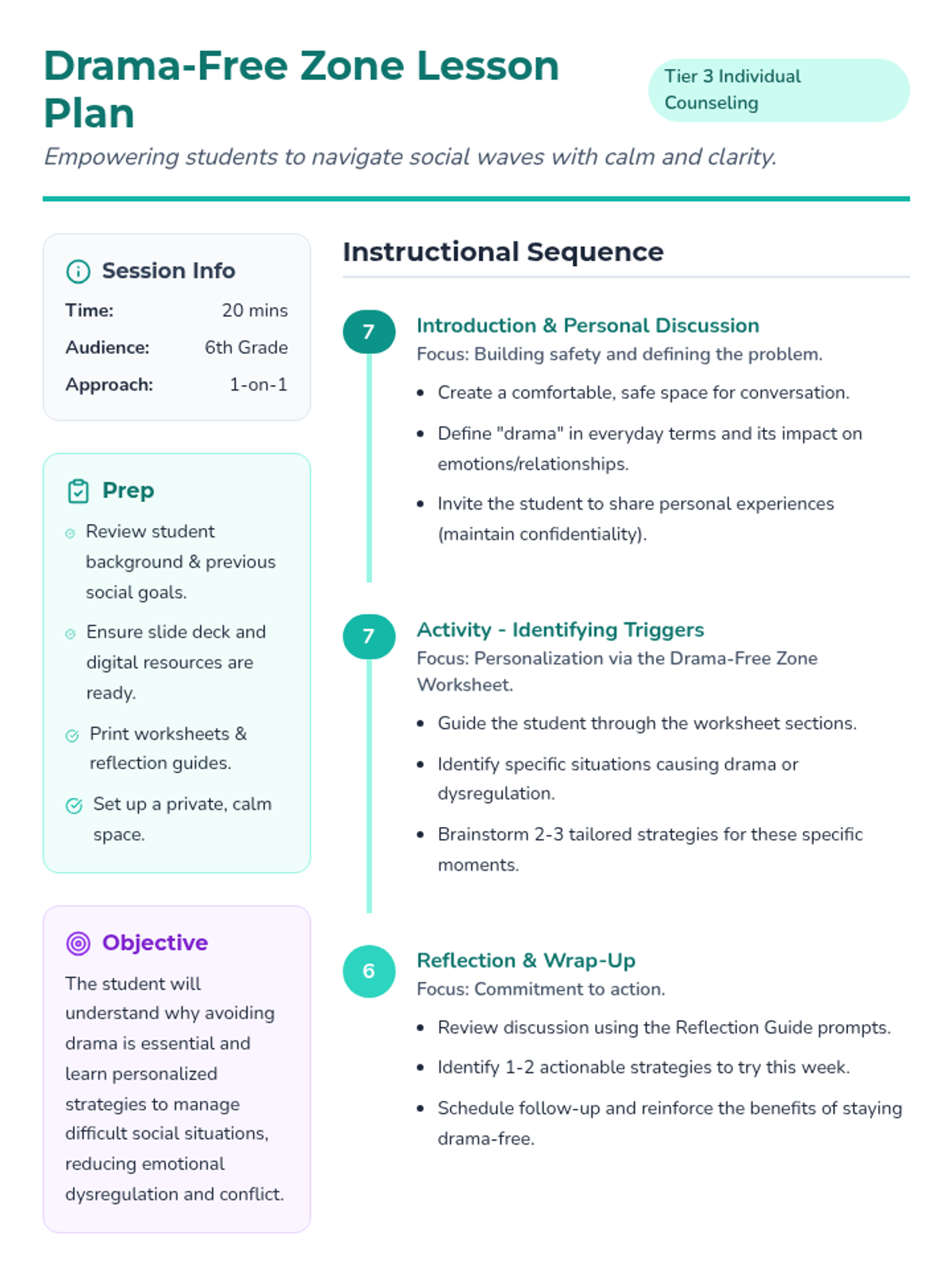 A 20-minute Tier 3 individual counseling lesson for 6th graders to help them identify drama triggers, understand emotional impacts, and develop personalized strategies for social harmony.