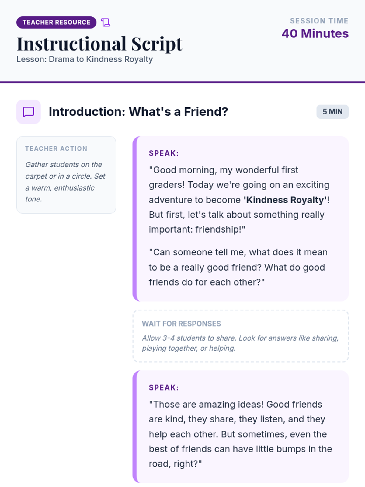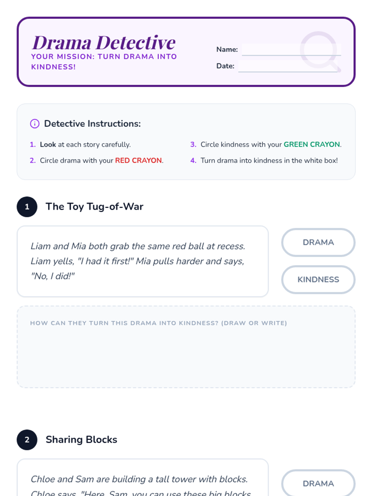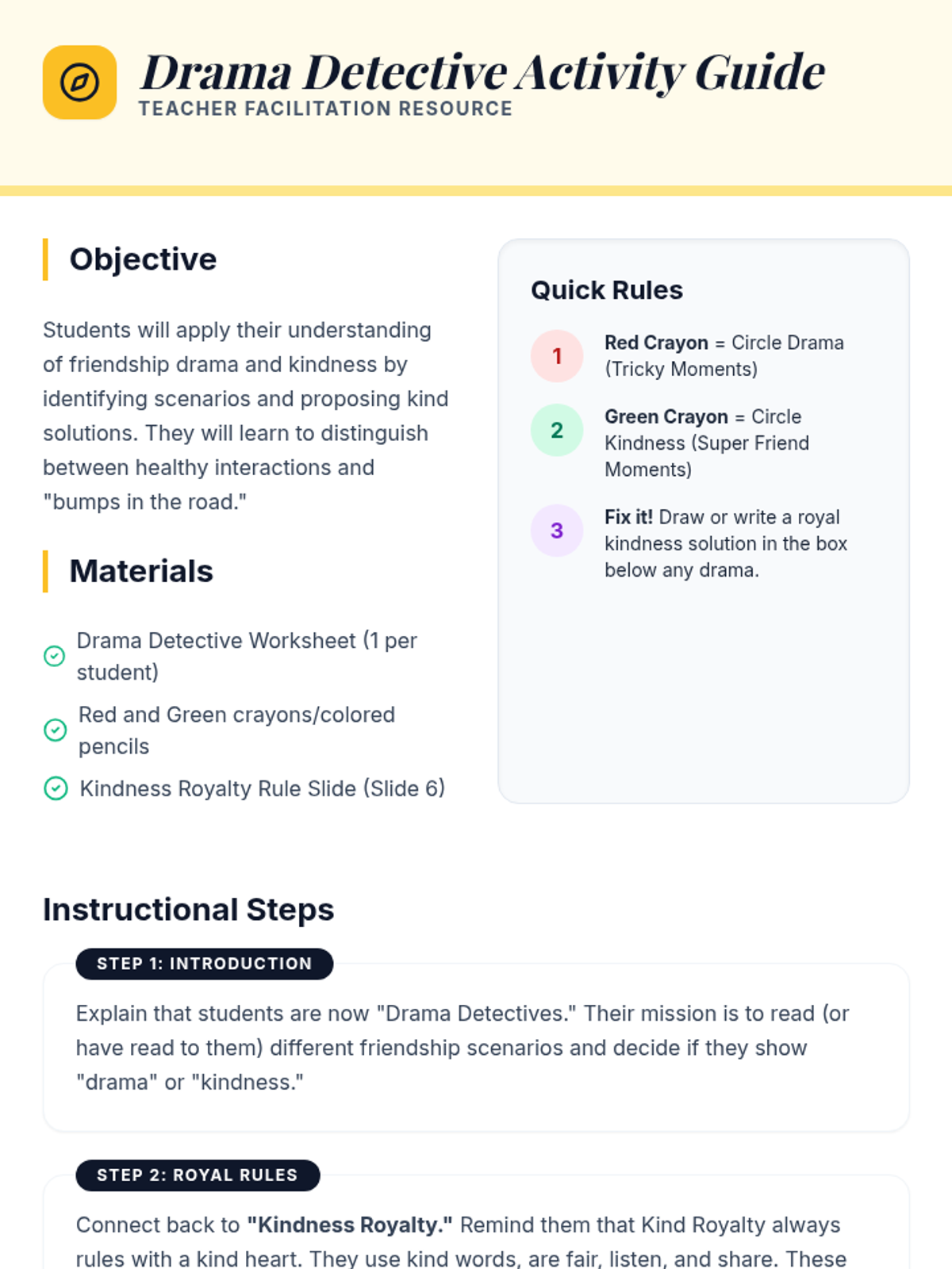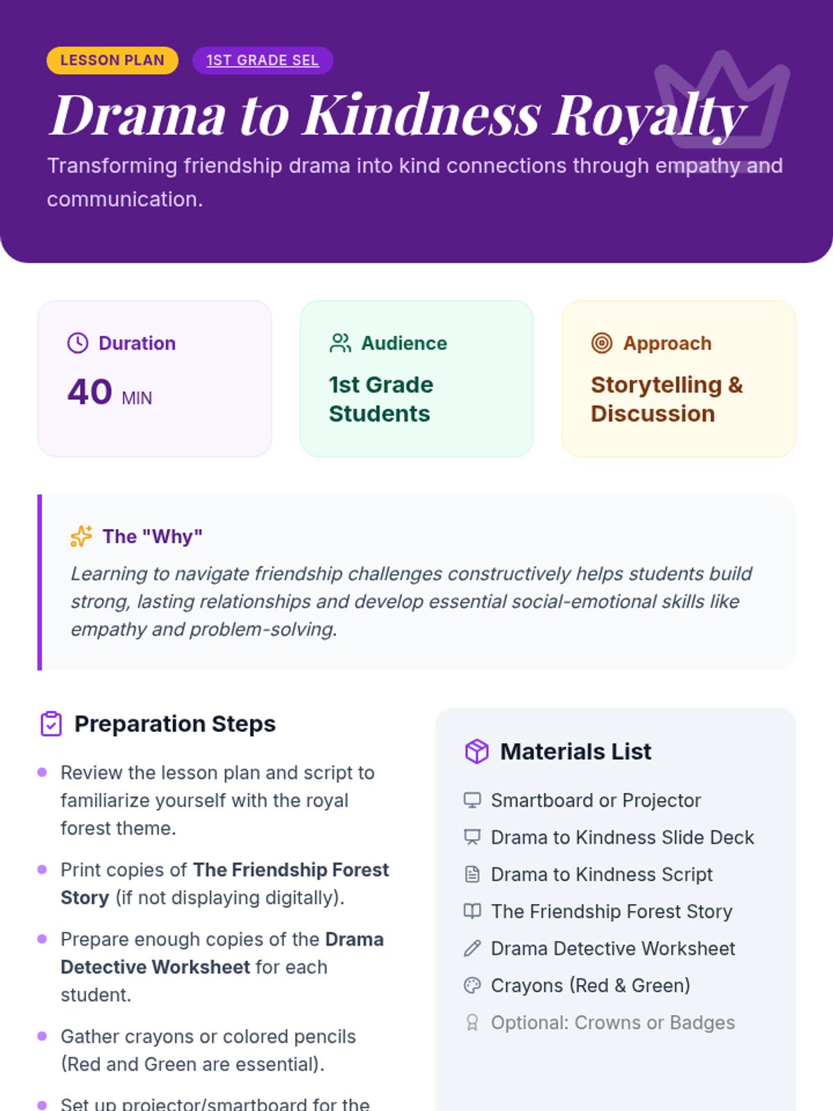A social-emotional learning lesson for 1st graders focused on identifying friendship drama and transforming it into kindness through empathy and positive communication.