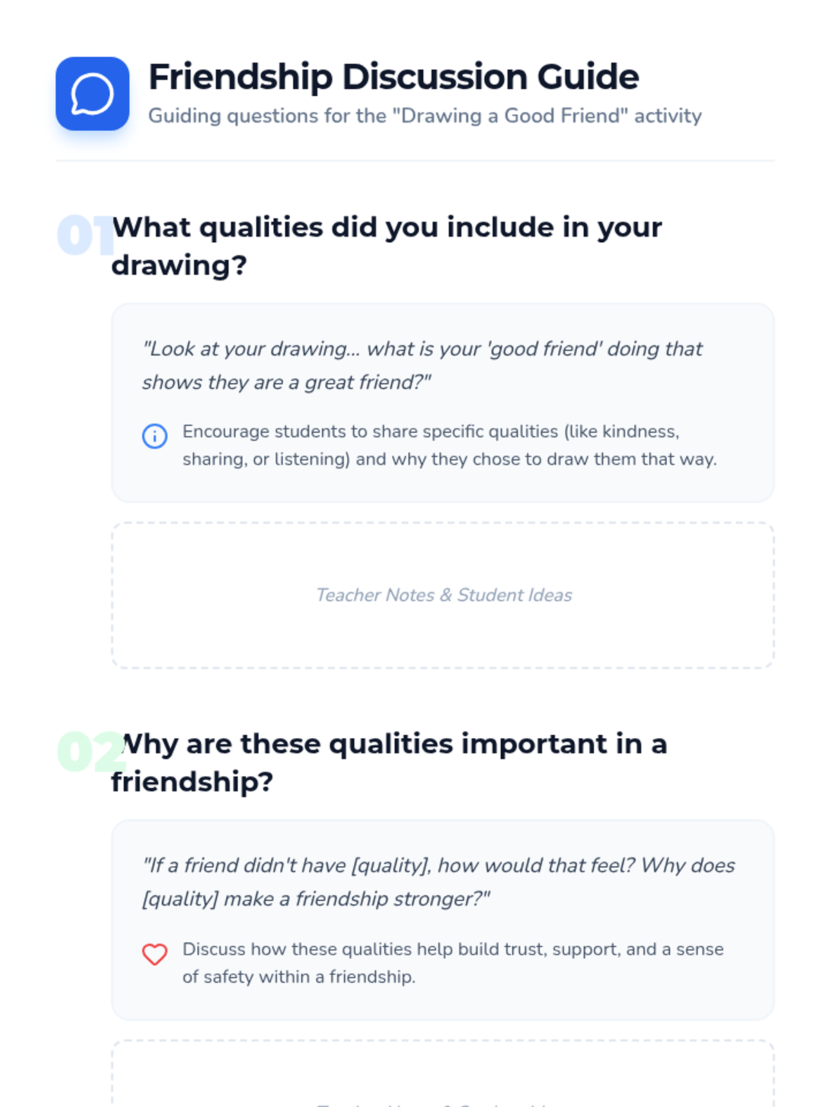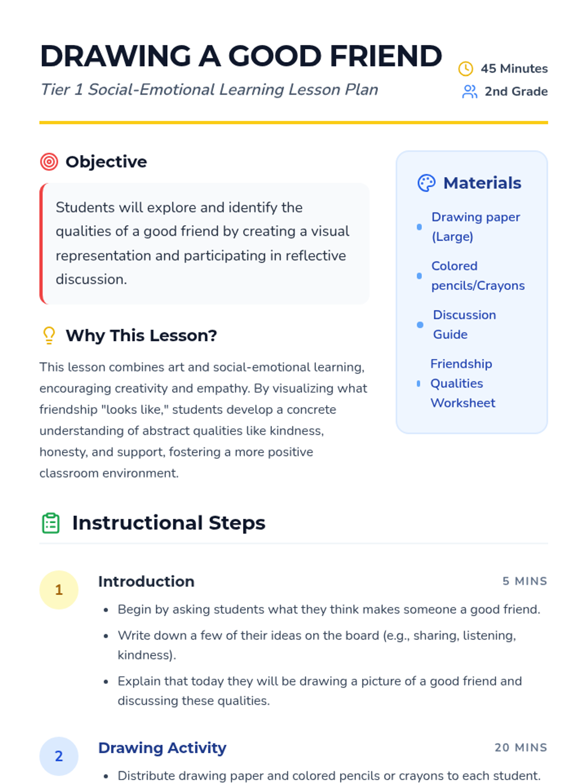 Students explore the qualities of a good friend through a creative drawing activity and reflective discussion, fostering empathy and classroom community.