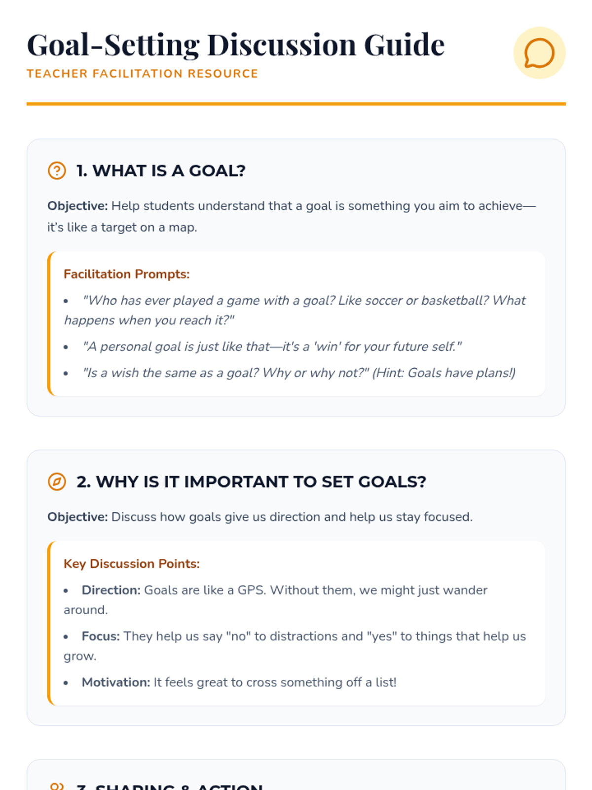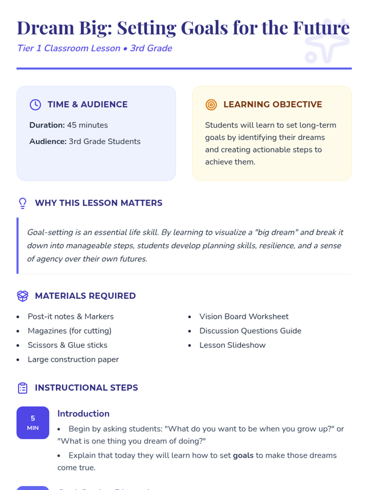 A comprehensive lesson for 3rd graders on setting long-term goals and creating actionable steps through a creative vision board activity.