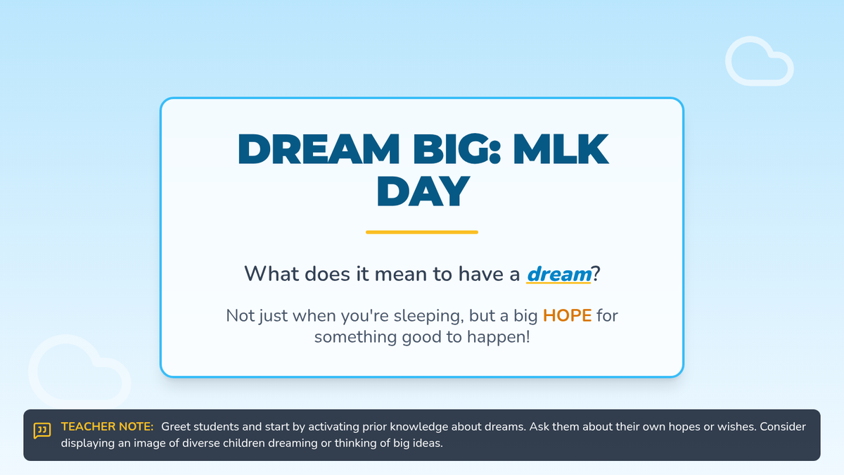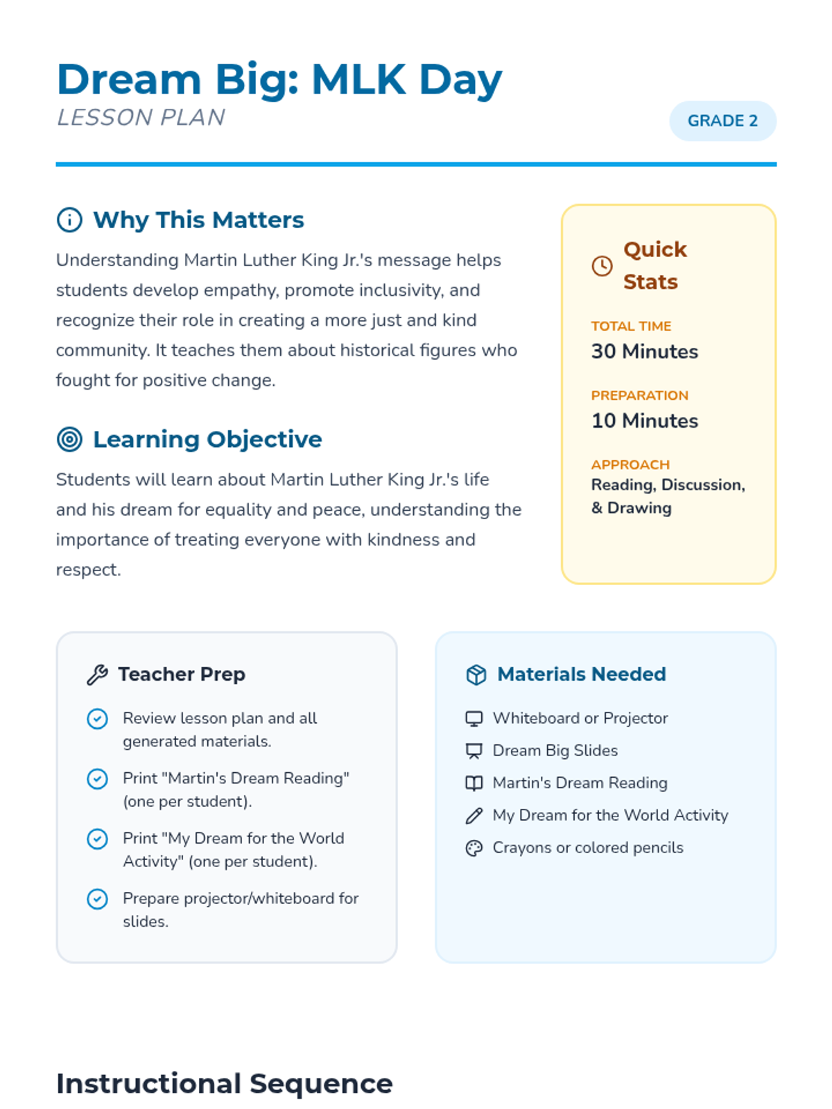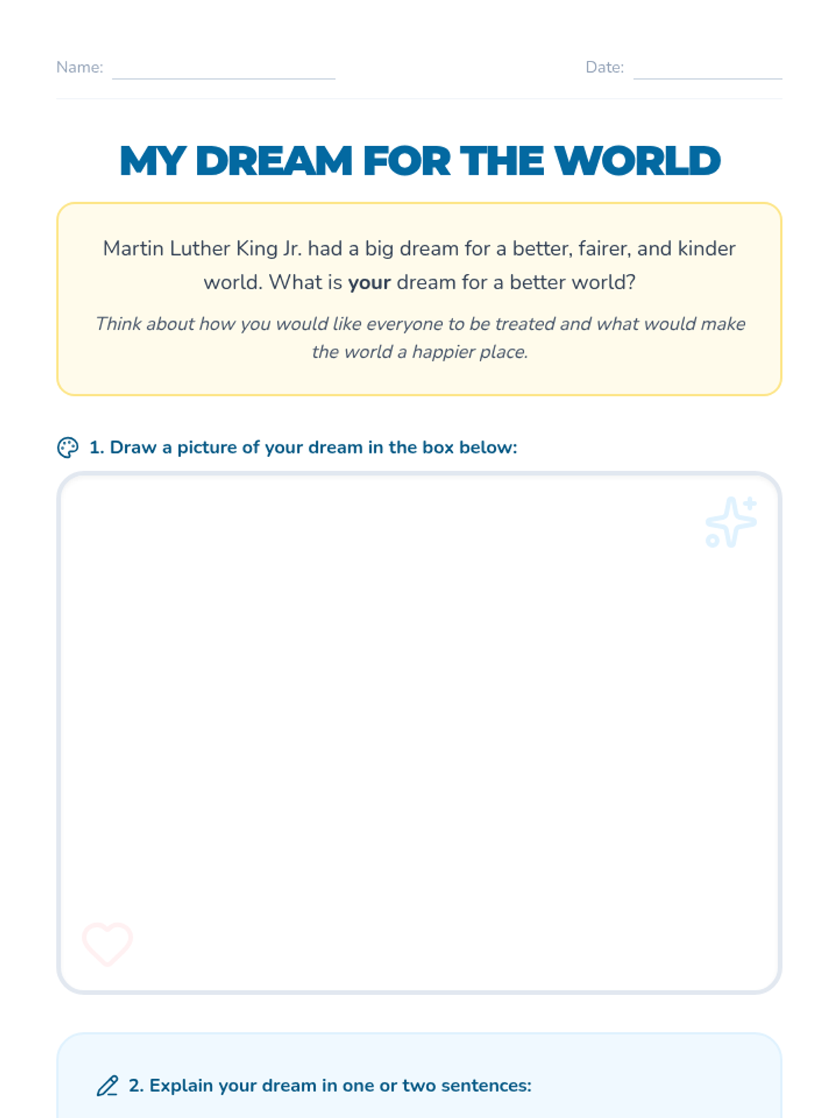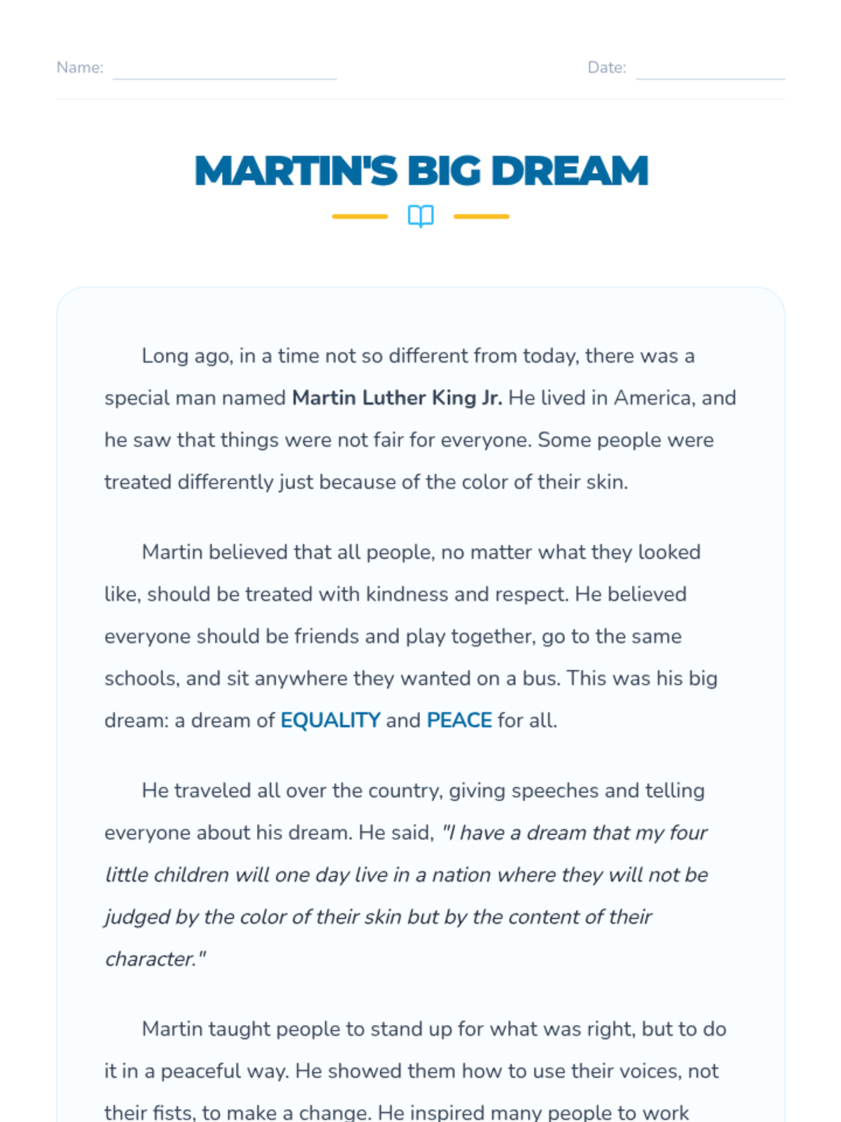 This lesson introduces 2nd-grade students to the life and message of Martin Luther King Jr. and the importance of equality and kindness through reading, discussion, and a creative activity.