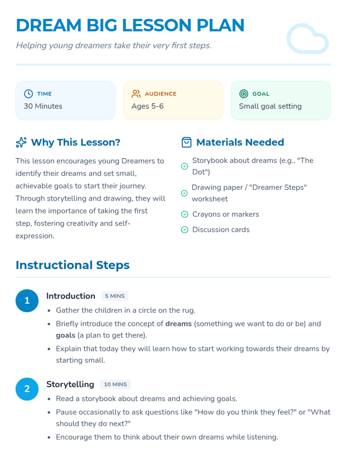 A whimsical lesson for young children (ages 5-6) that teaches the power of setting small, manageable goals to reach big dreams through storytelling and creative drawing.
