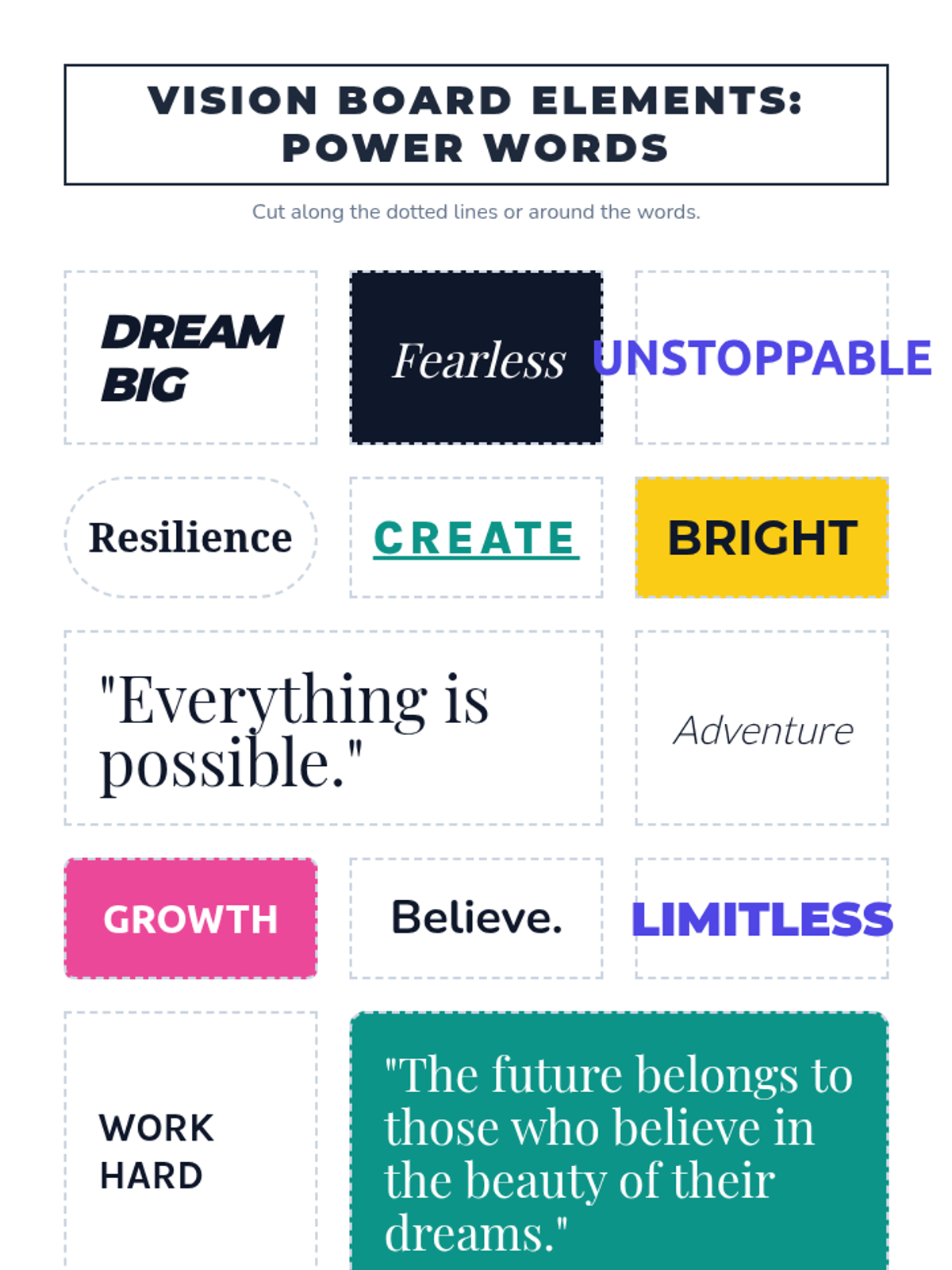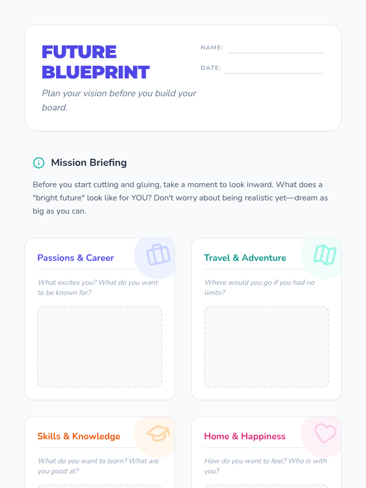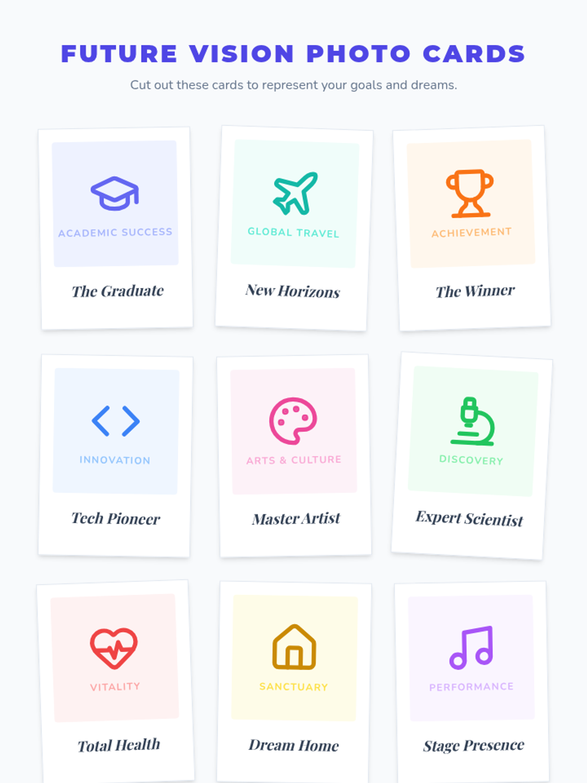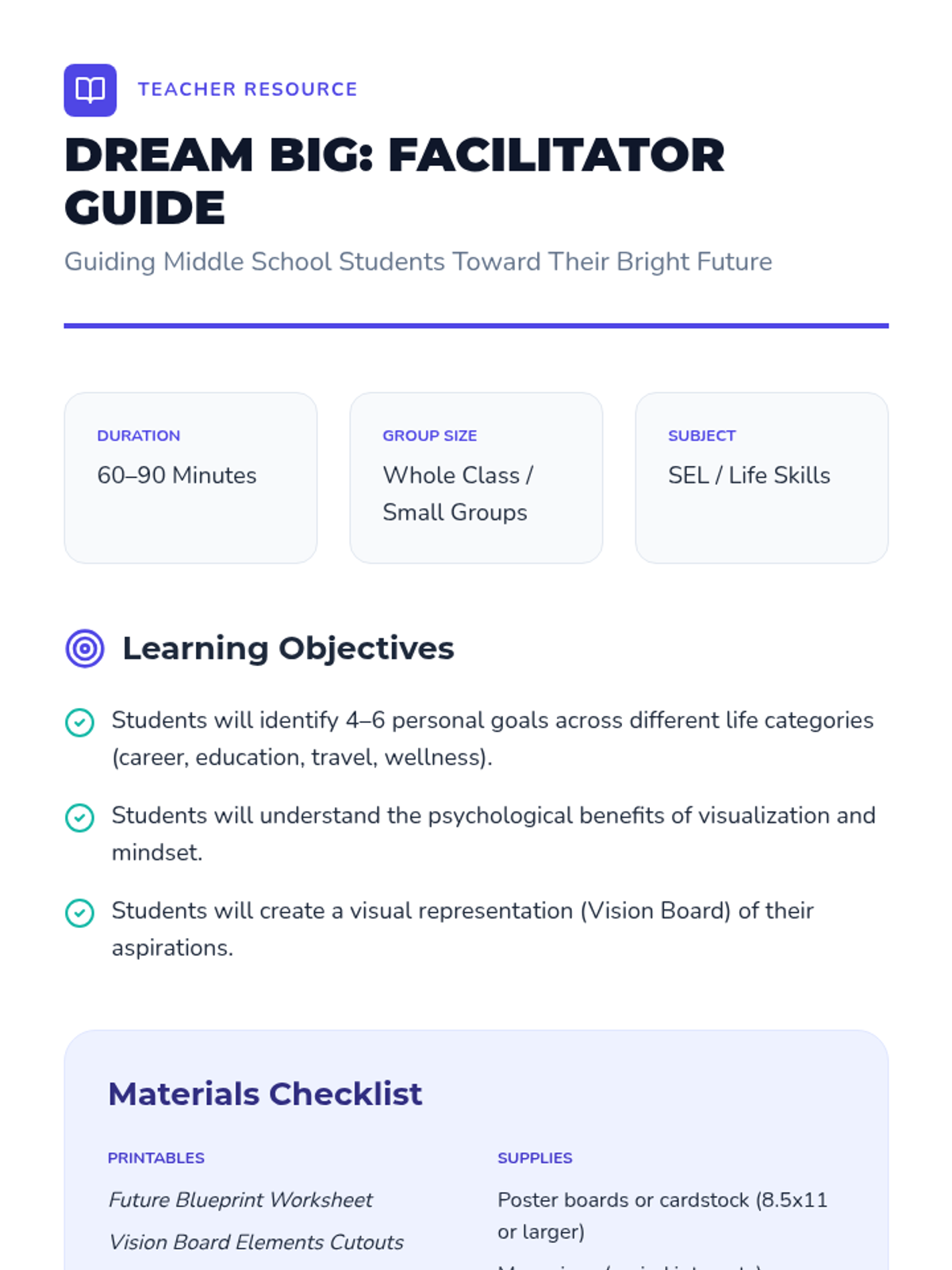 A comprehensive lesson designed to help middle school students visualize their future goals and aspirations through the creation of a vision board. The lesson includes a presentation, a pre-planning worksheet, printable collage elements, and a facilitator guide.