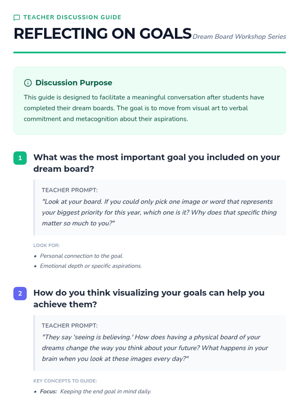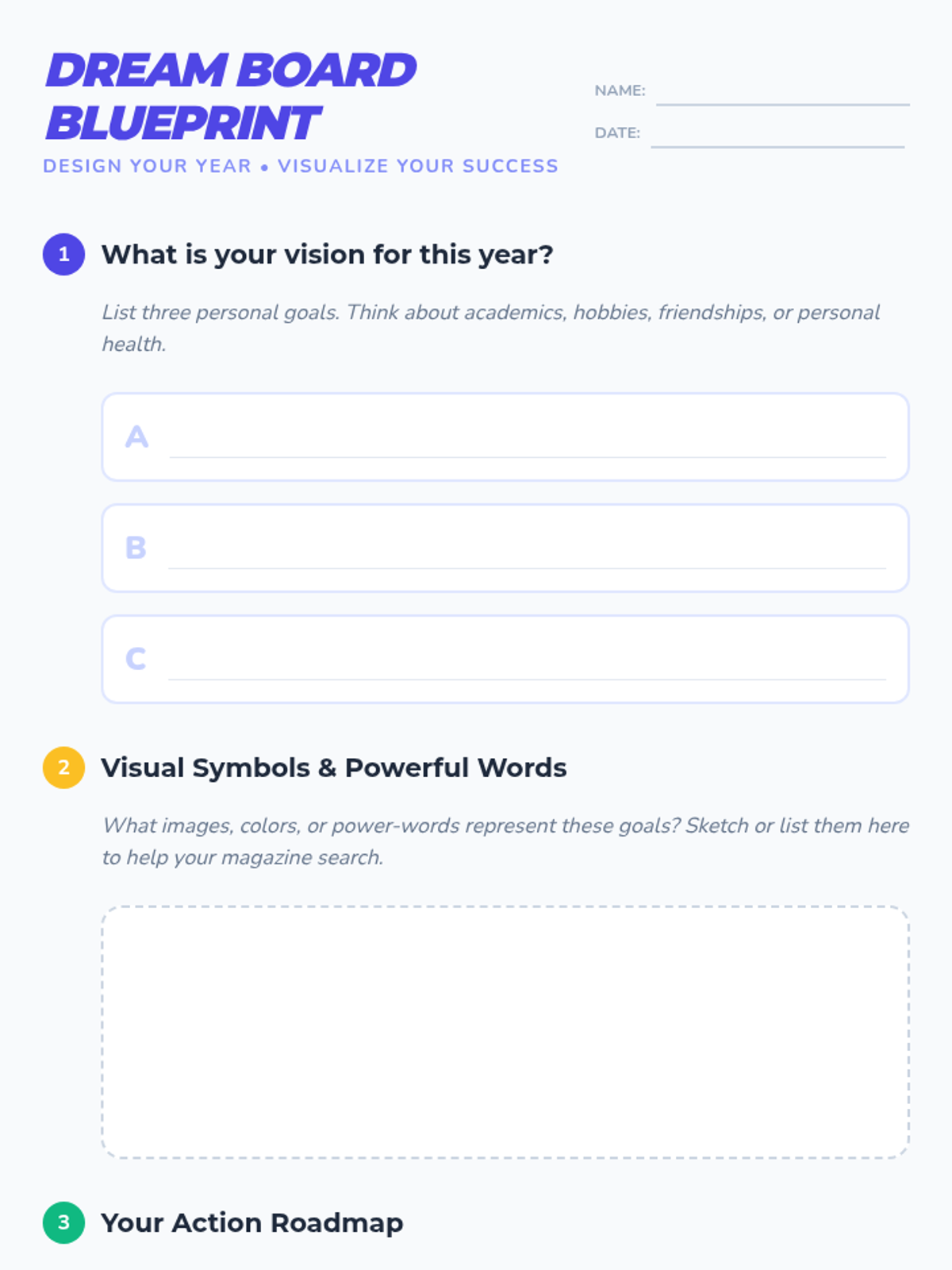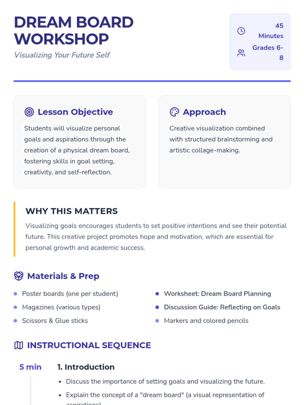 A creative goal-setting lesson where students brainstorm, visualize, and create physical dream boards to represent their aspirations for the coming year. Students develop self-reflection and planning skills through art and discussion.