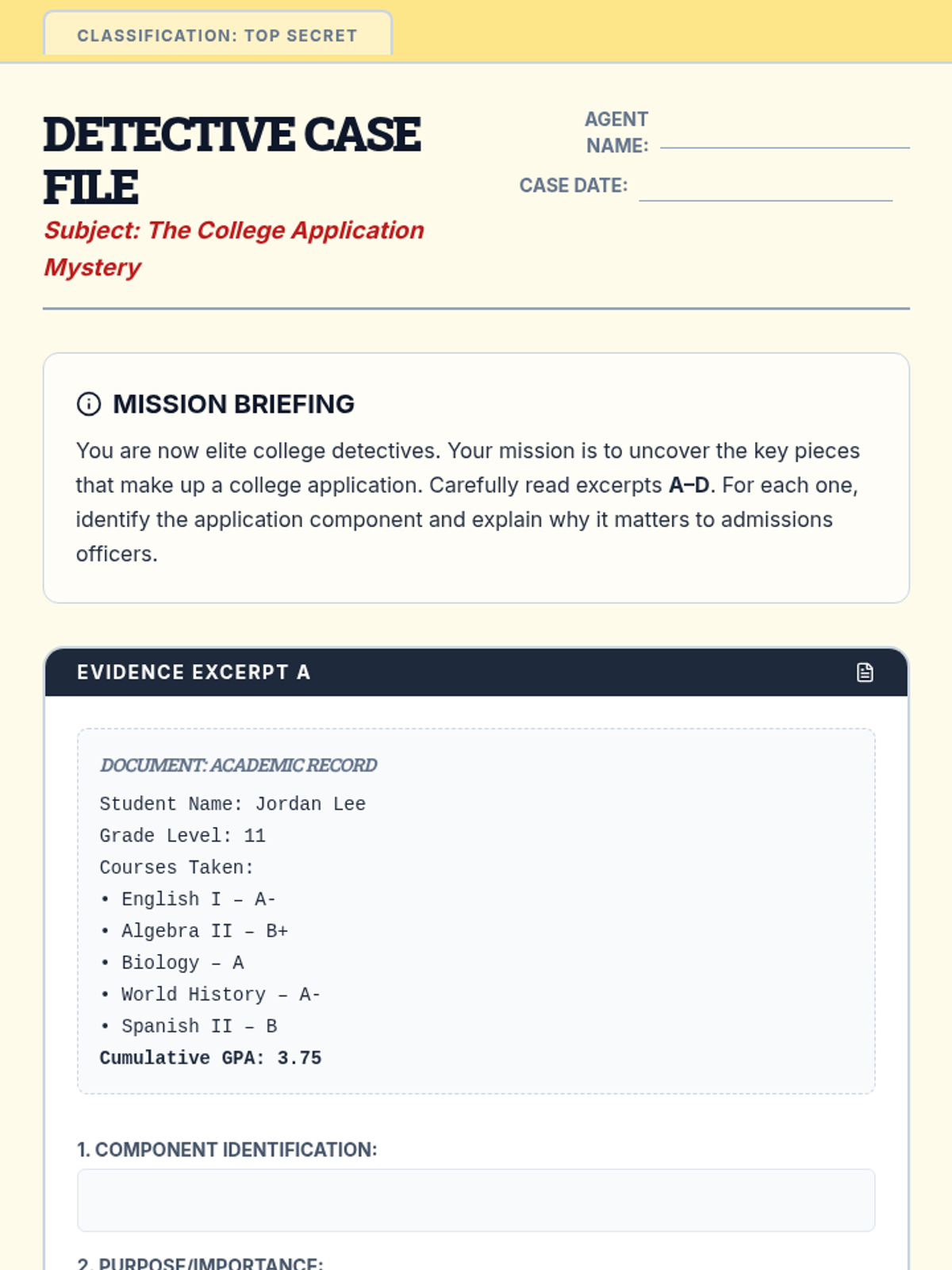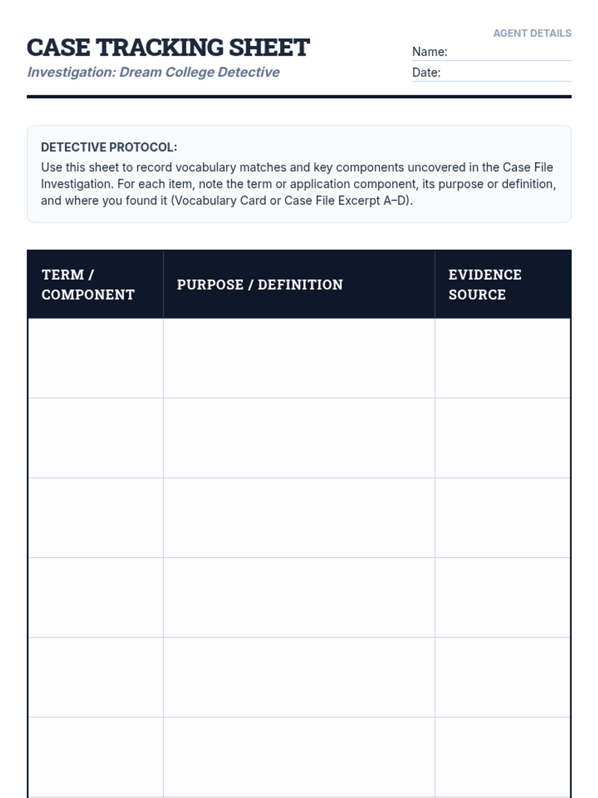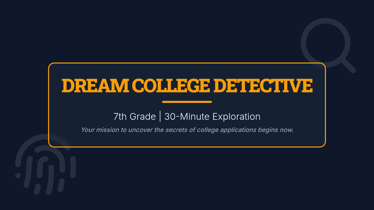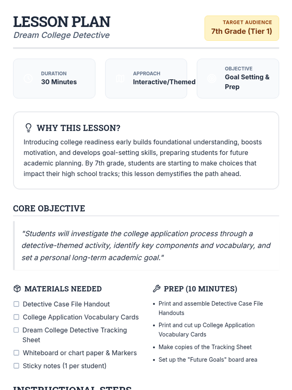 A detective-themed 30-minute lesson for 7th graders to explore the college application process, vocabulary, and goal setting. Students act as 'college detectives' to uncover the components of a college application and set long-term academic goals.