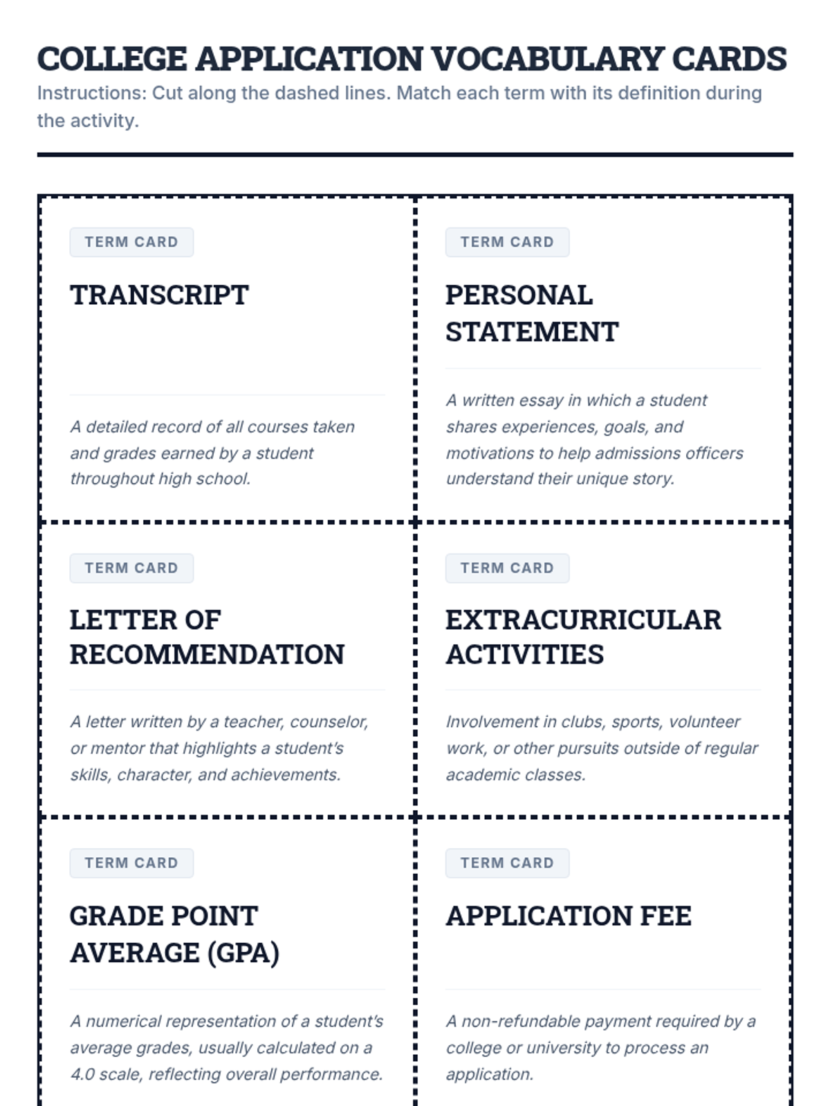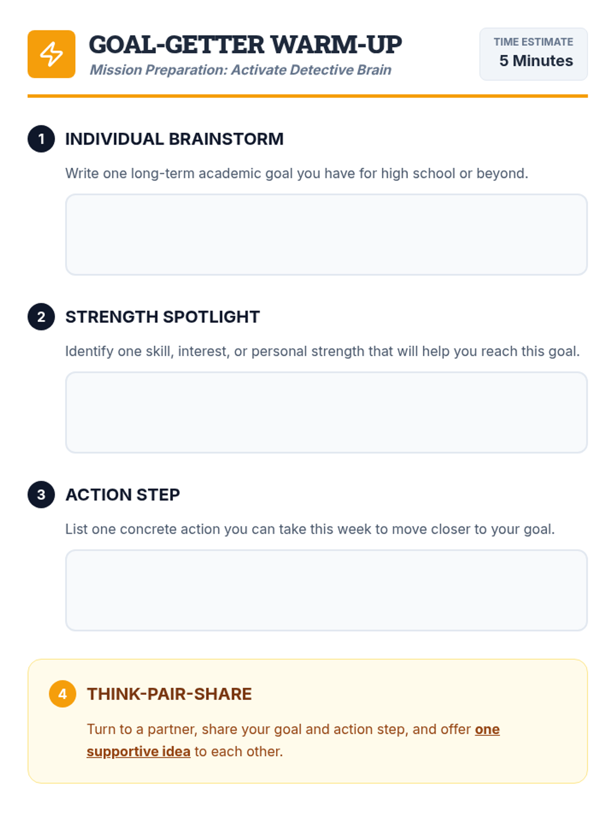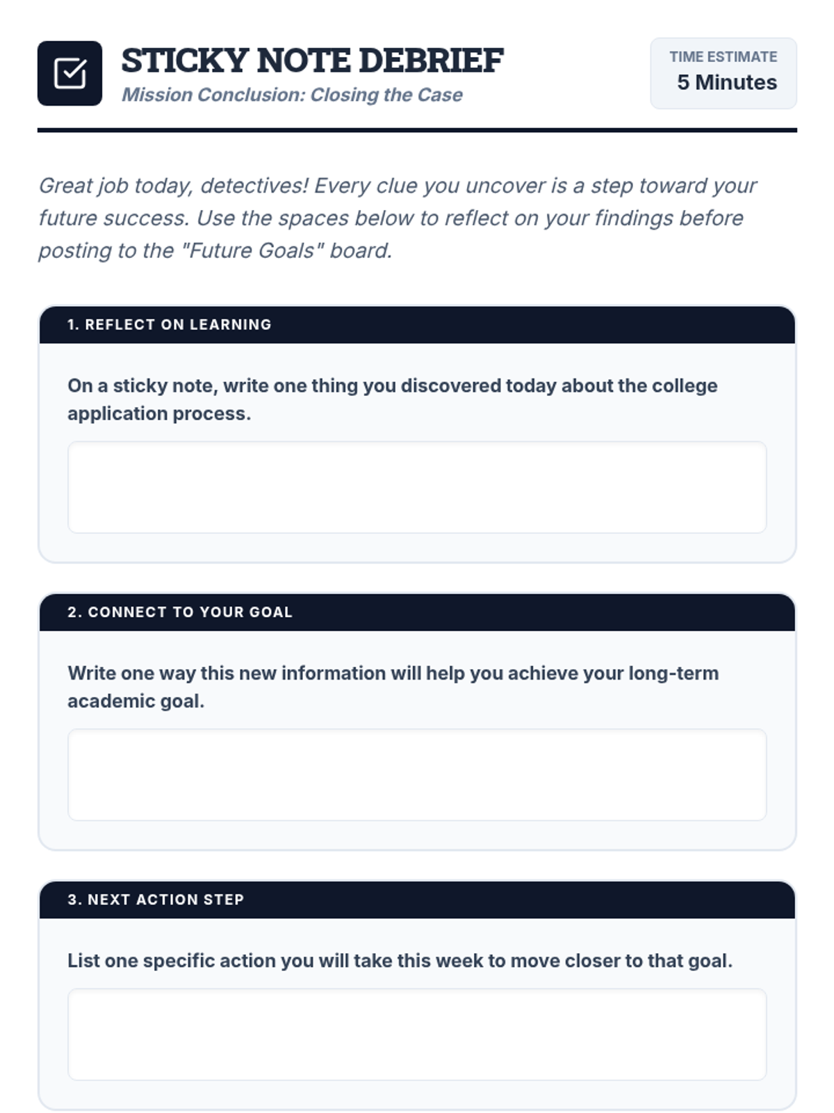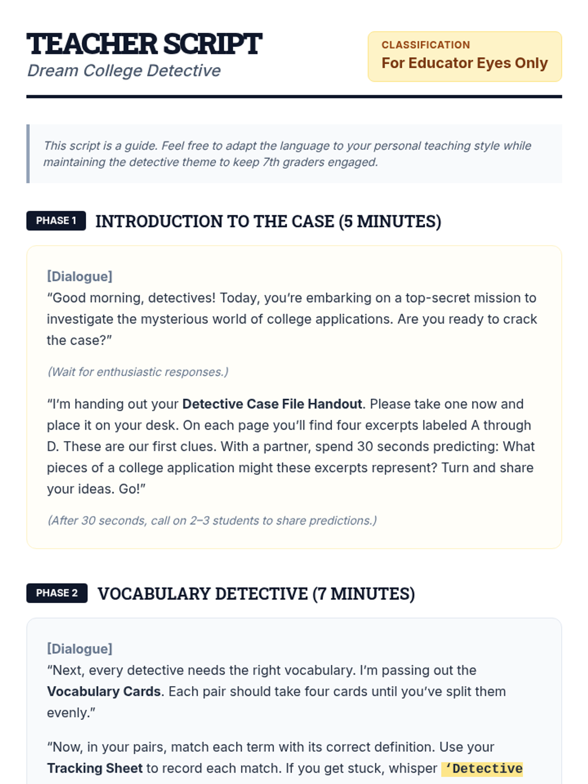 A detective-themed 30-minute lesson for 7th graders to explore the college application process, vocabulary, and goal setting. Students act as 'college detectives' to uncover the components of a college application and set long-term academic goals.