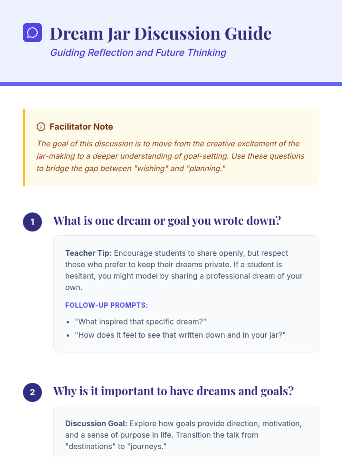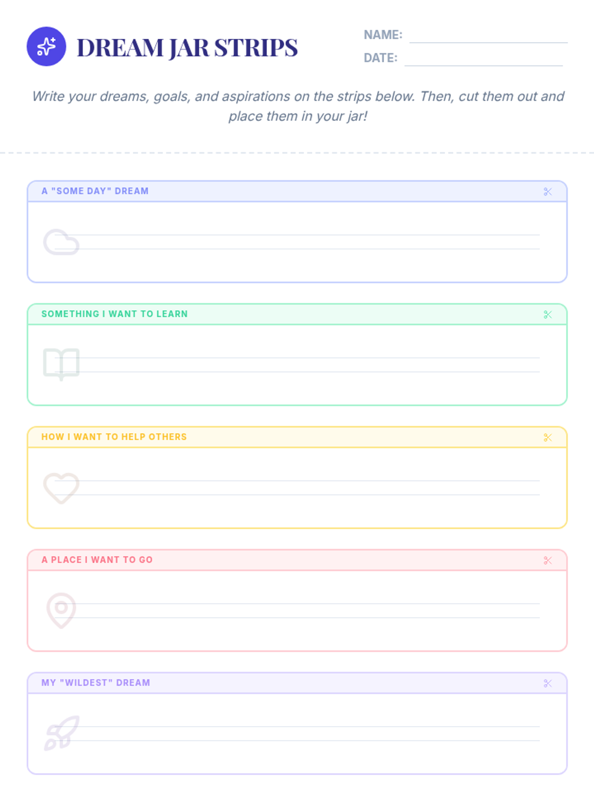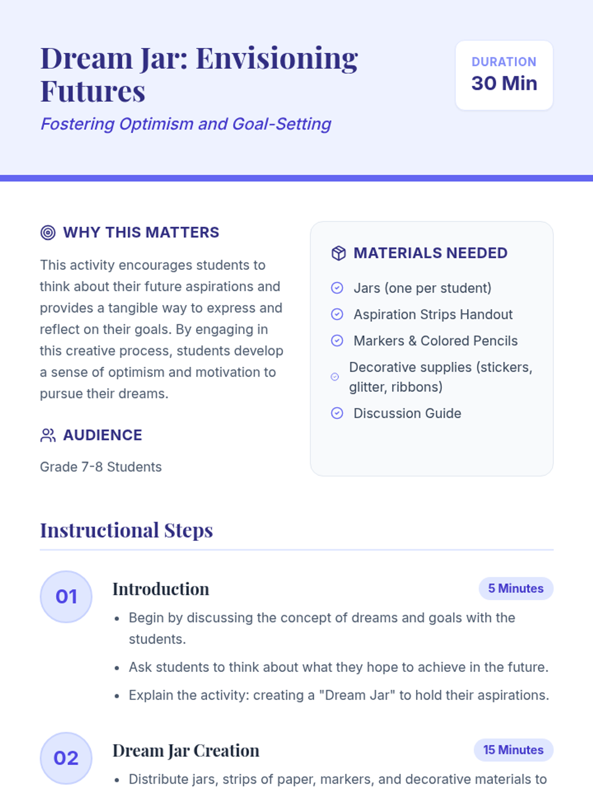 Students create 'Dream Jars' to hold strips of paper inscribed with their personal dreams or goals, fostering optimism and motivation through creative reflection.