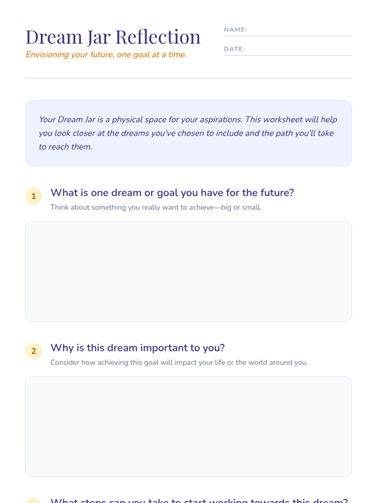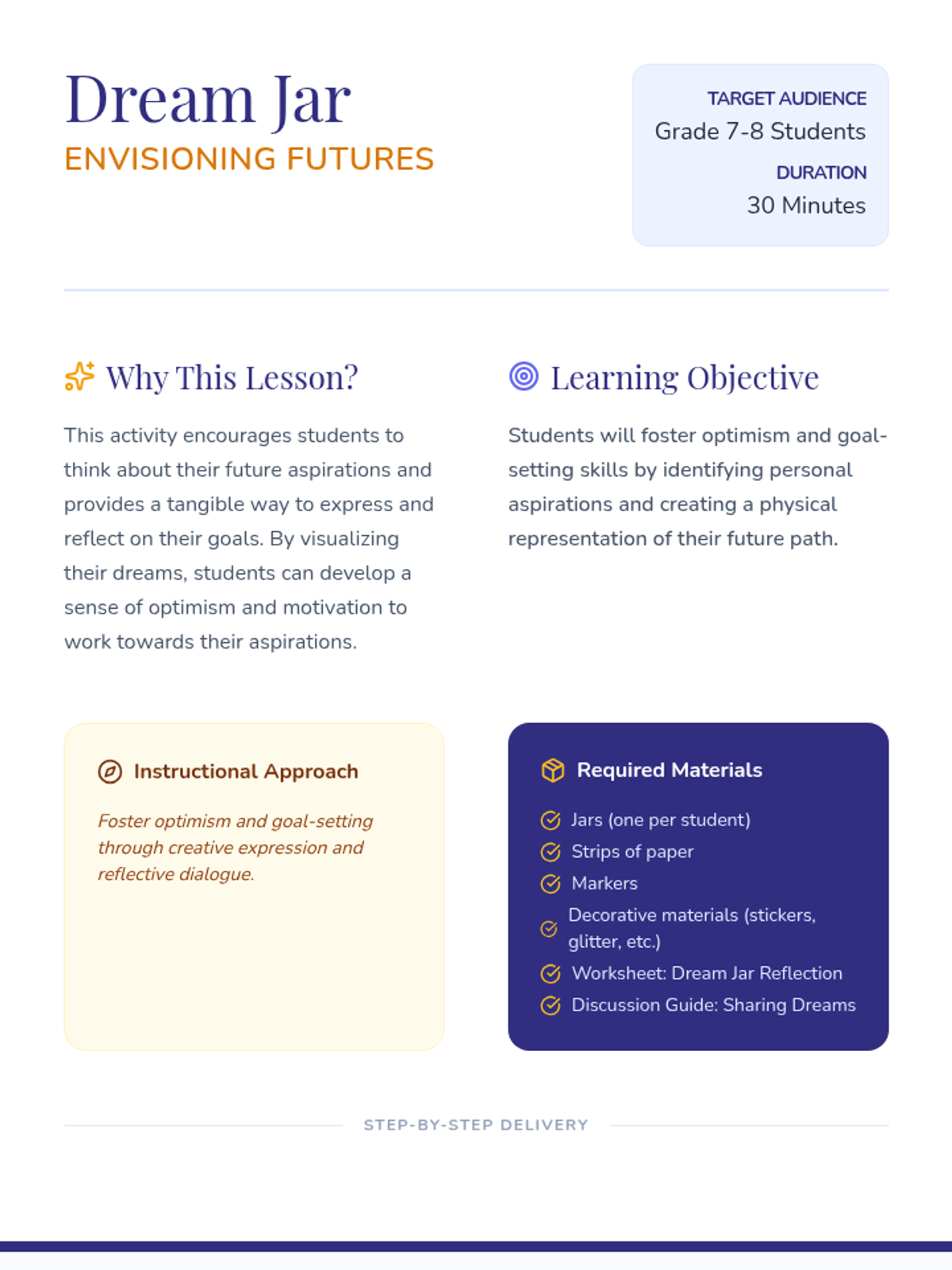 Students will create 'Dream Jars' to hold strips of paper inscribed with their personal dreams or goals, fostering optimism and a sense of purpose through visualization and reflection.