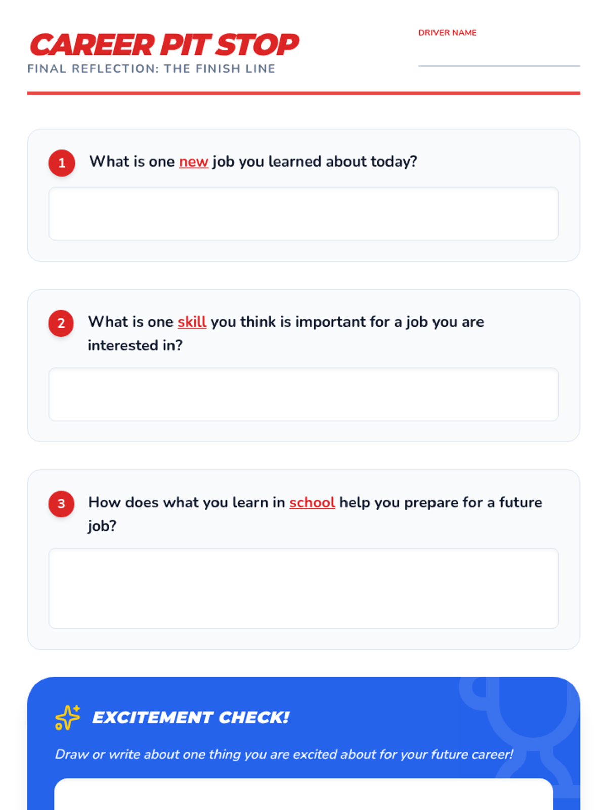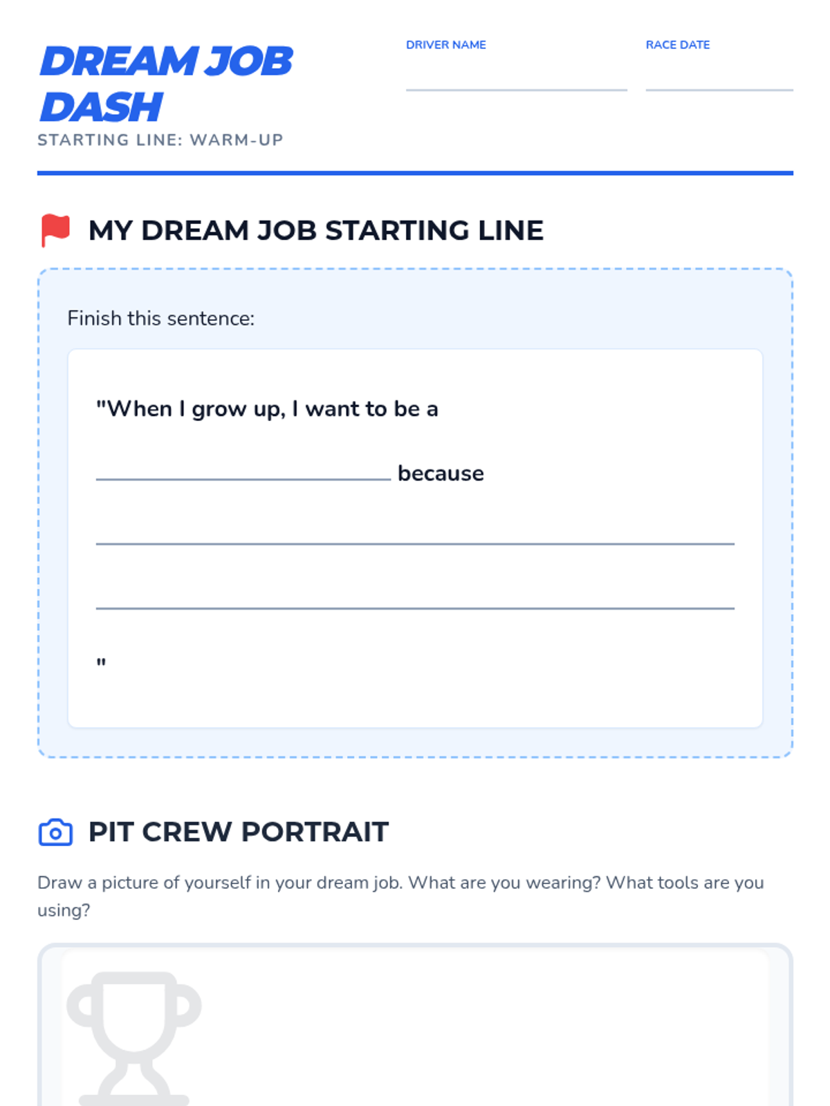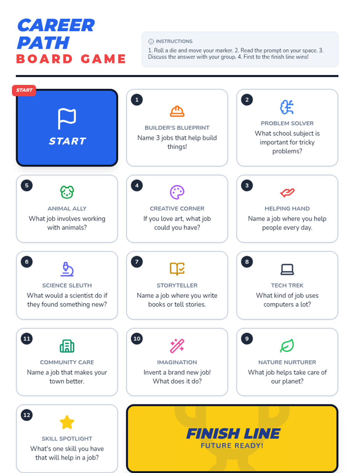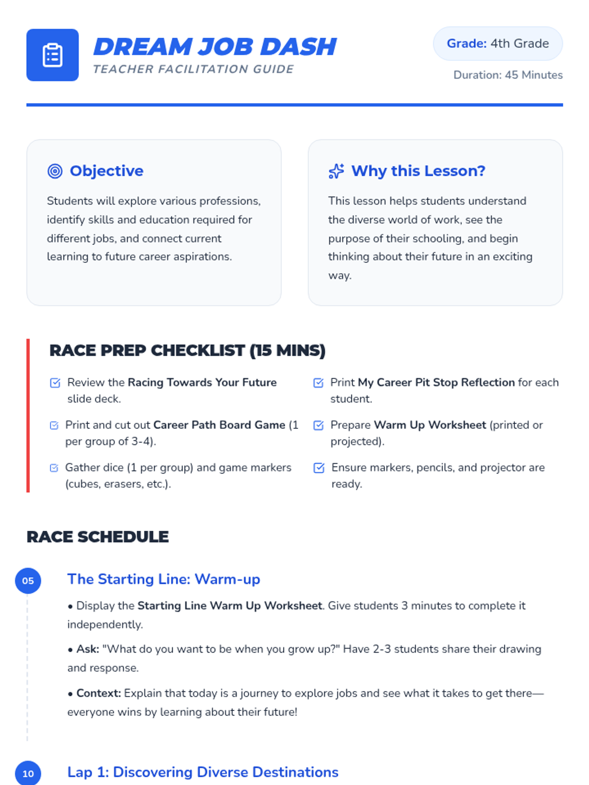 Students will embark on a fun 'Dream Job Dash' to learn about various professions and the paths to achieve them, building foundational college and career readiness. This 45-minute lesson for 4th graders uses a racing theme to connect school subjects to future aspirations through interactive play and reflection.