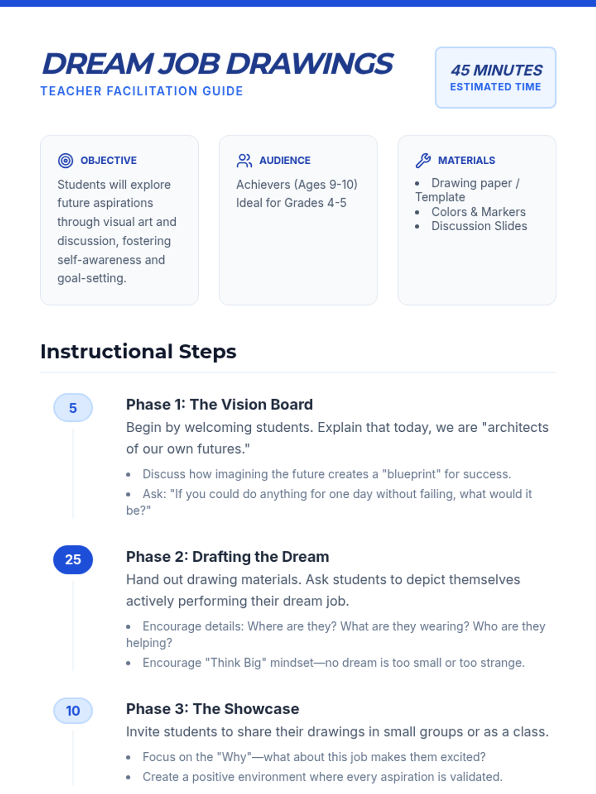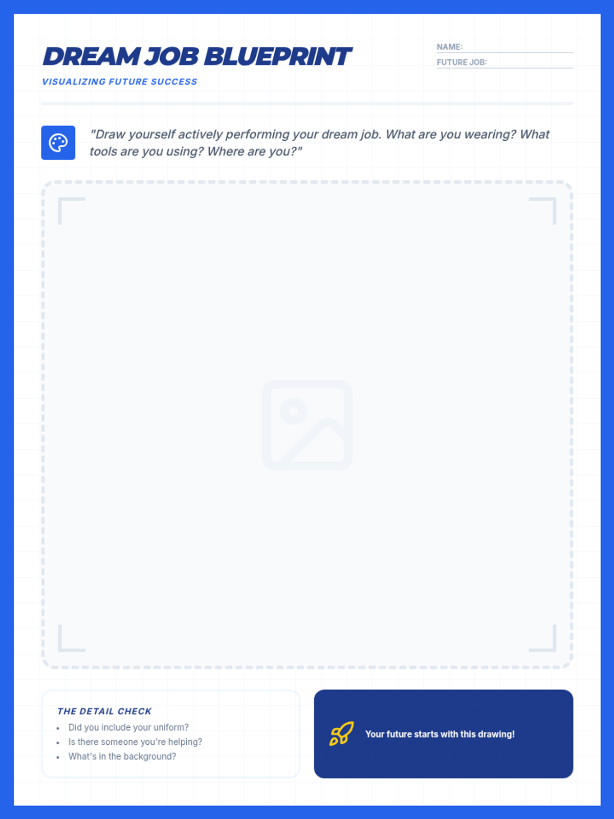A lesson where students explore future aspirations by drawing themselves in their dream jobs and identifying steps to achieve their goals.