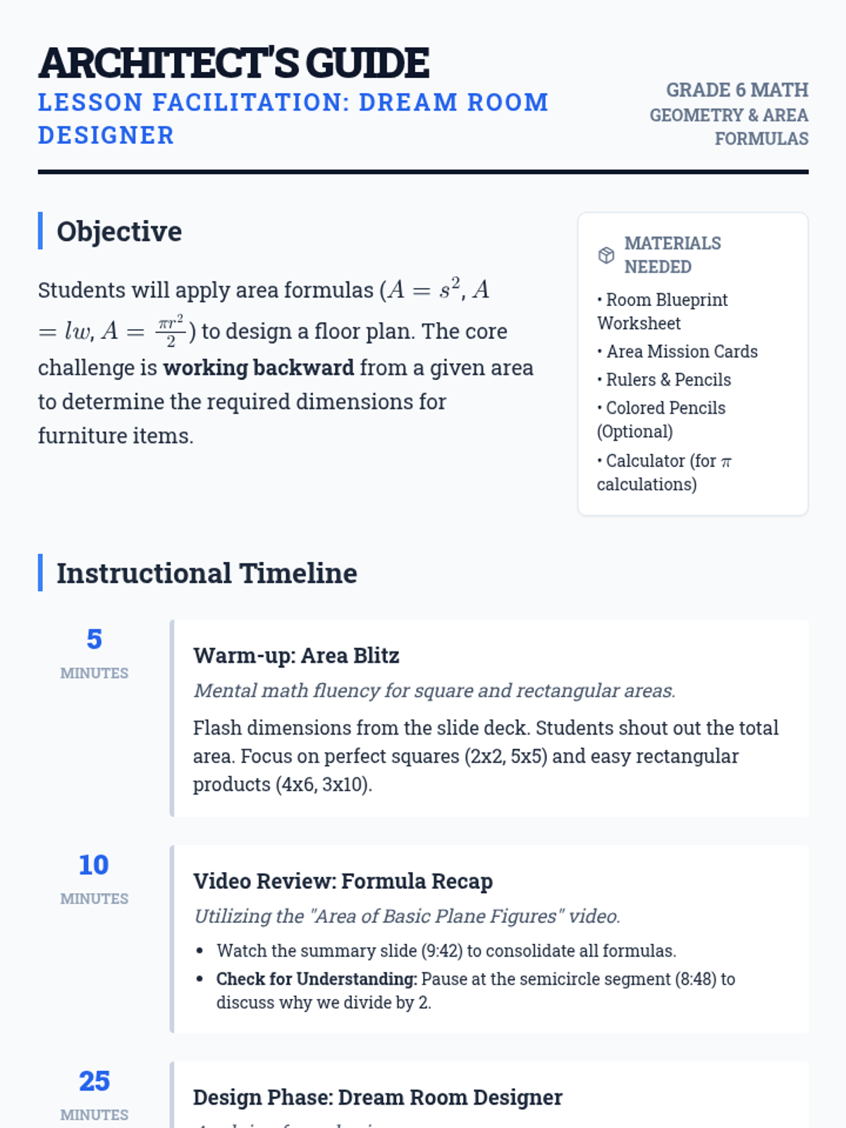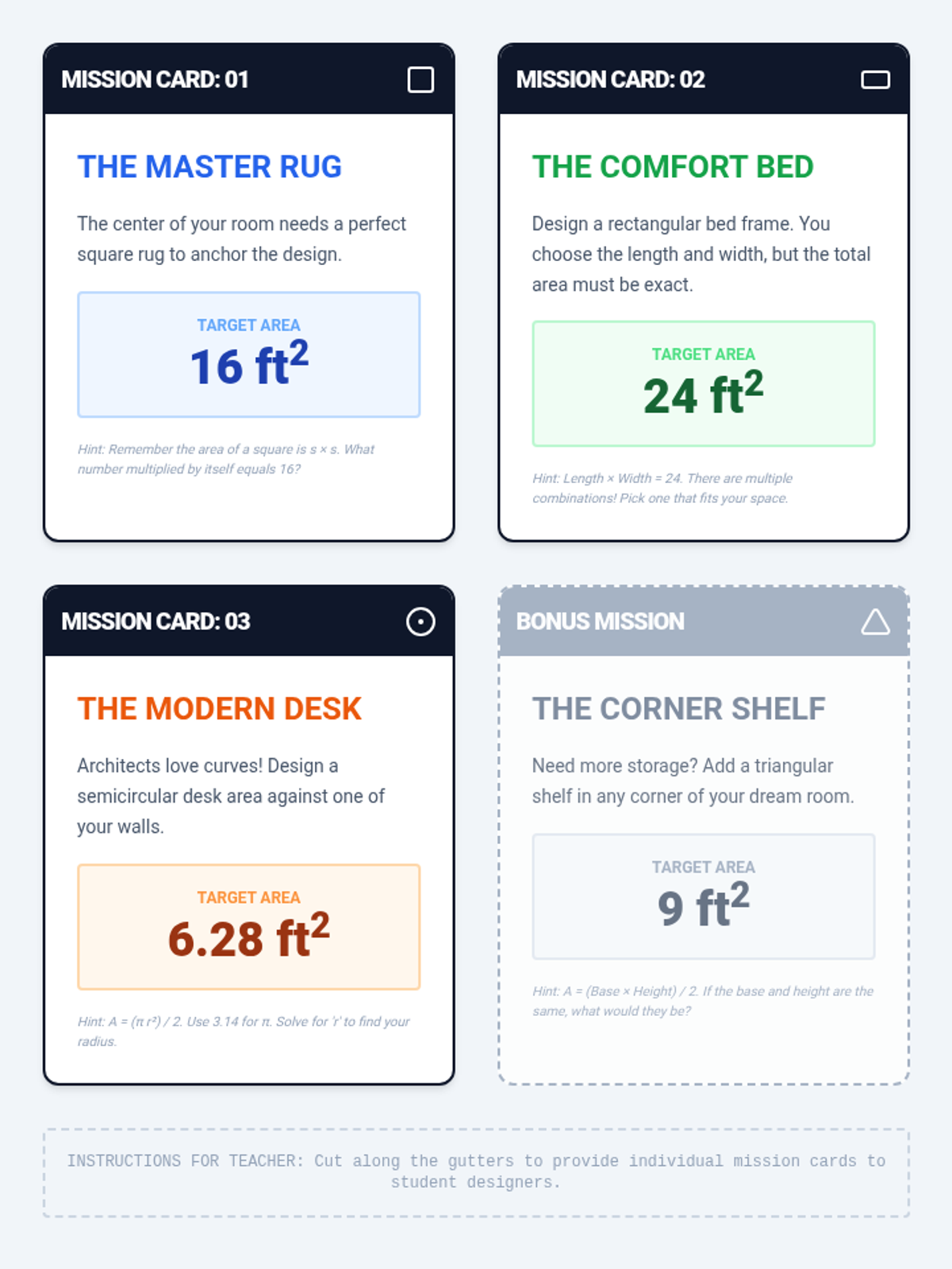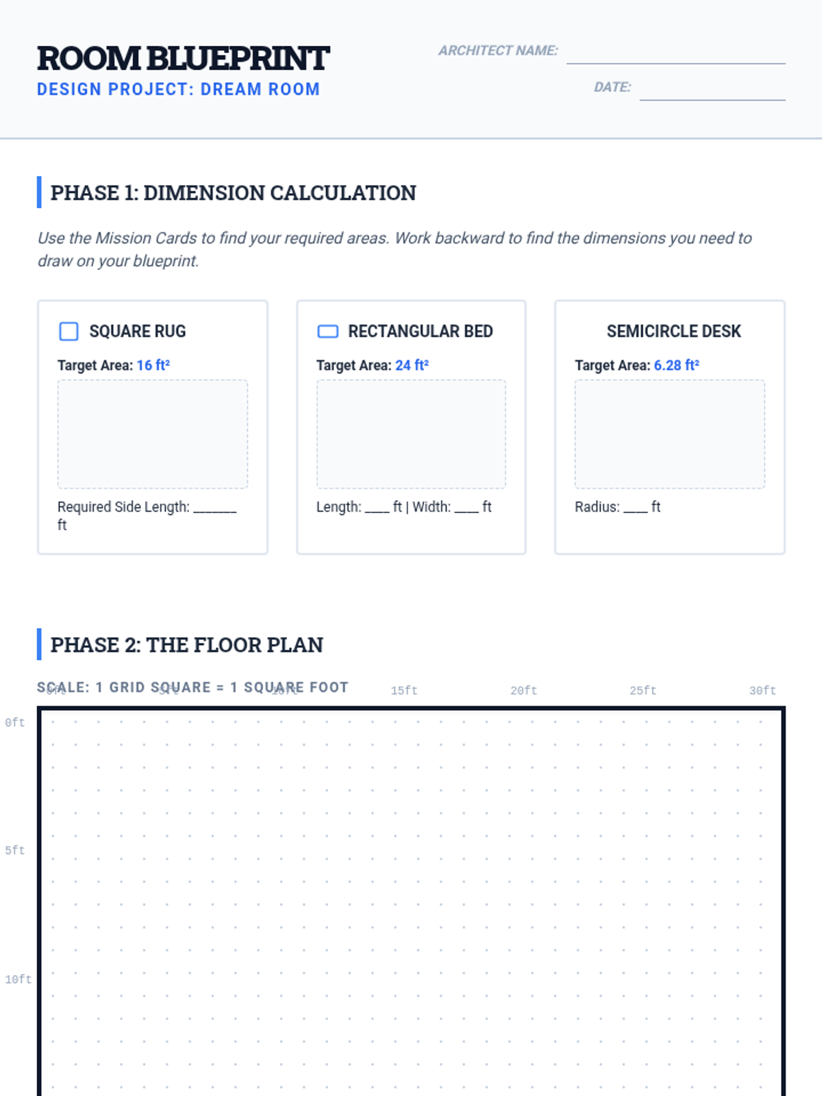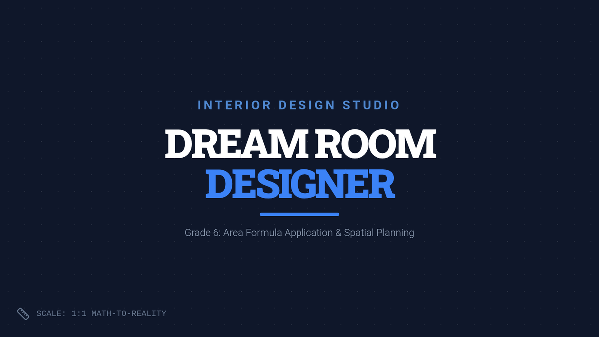 Students step into the role of interior designers to create a 'Dream Room' floor plan. They must work backward from specific area requirements to determine dimensions for furniture including a square rug, a rectangular bed, and a semicircular desk, applying area formulas for squares, rectangles, and circles.