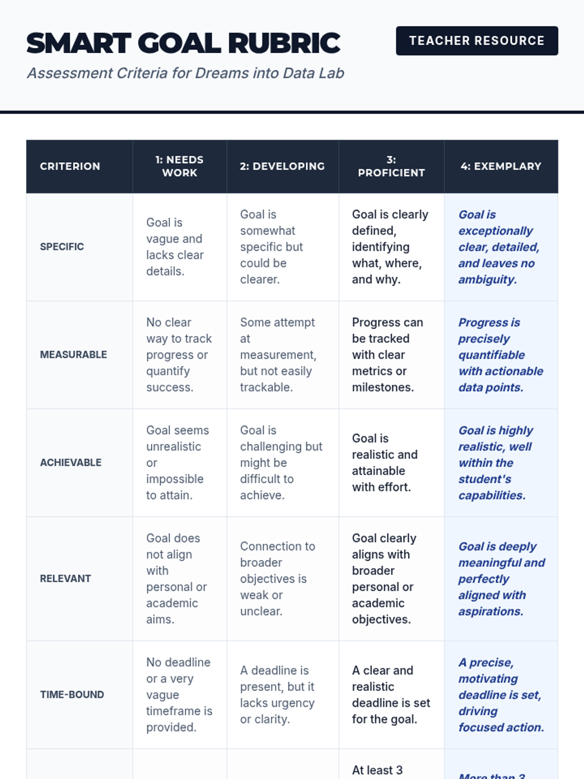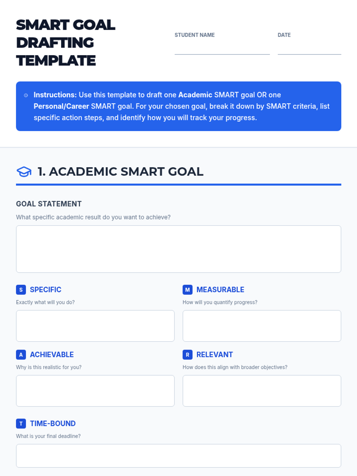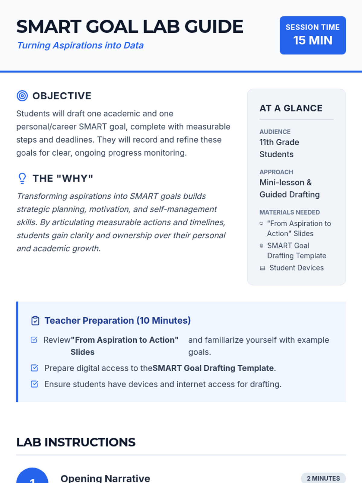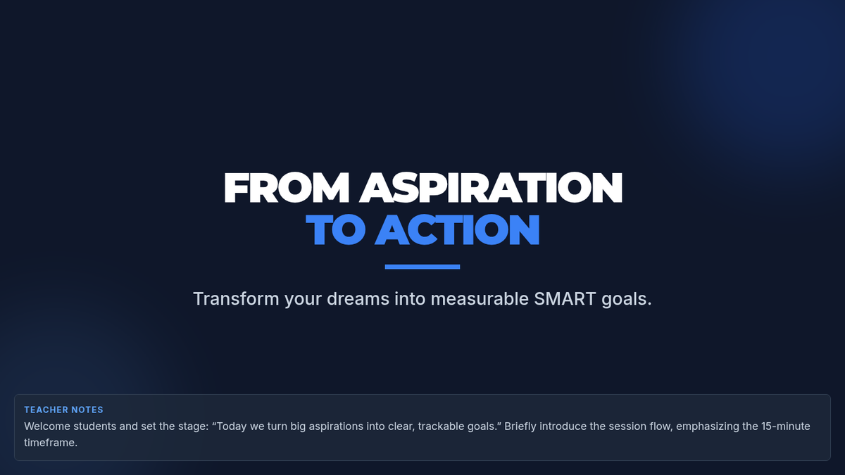 In this high-impact lab, students transform vague aspirations into rigorous SMART goals. By drafting concrete targets with measurable steps, learners build the strategic planning and self-monitoring skills essential for post-secondary success.