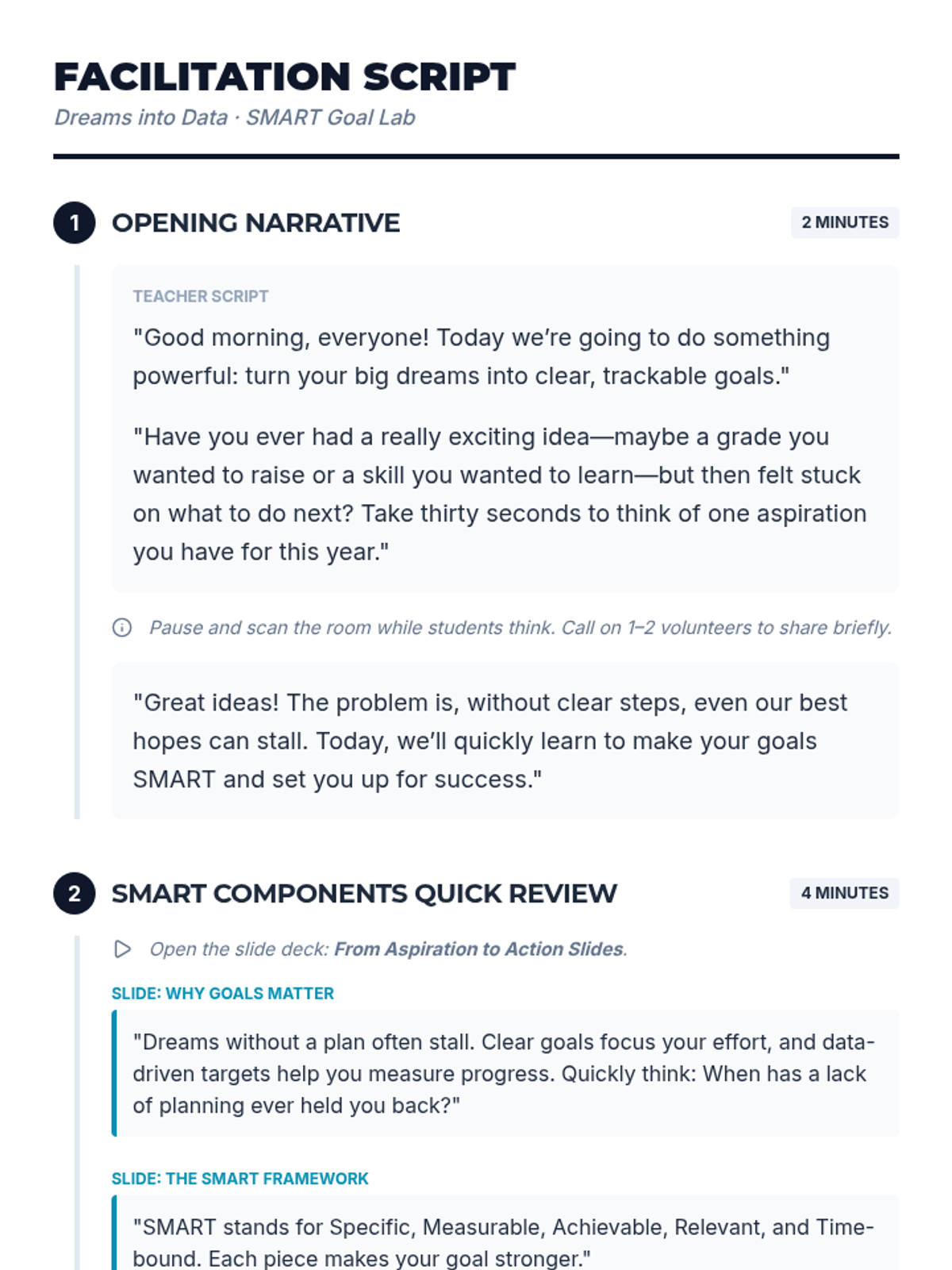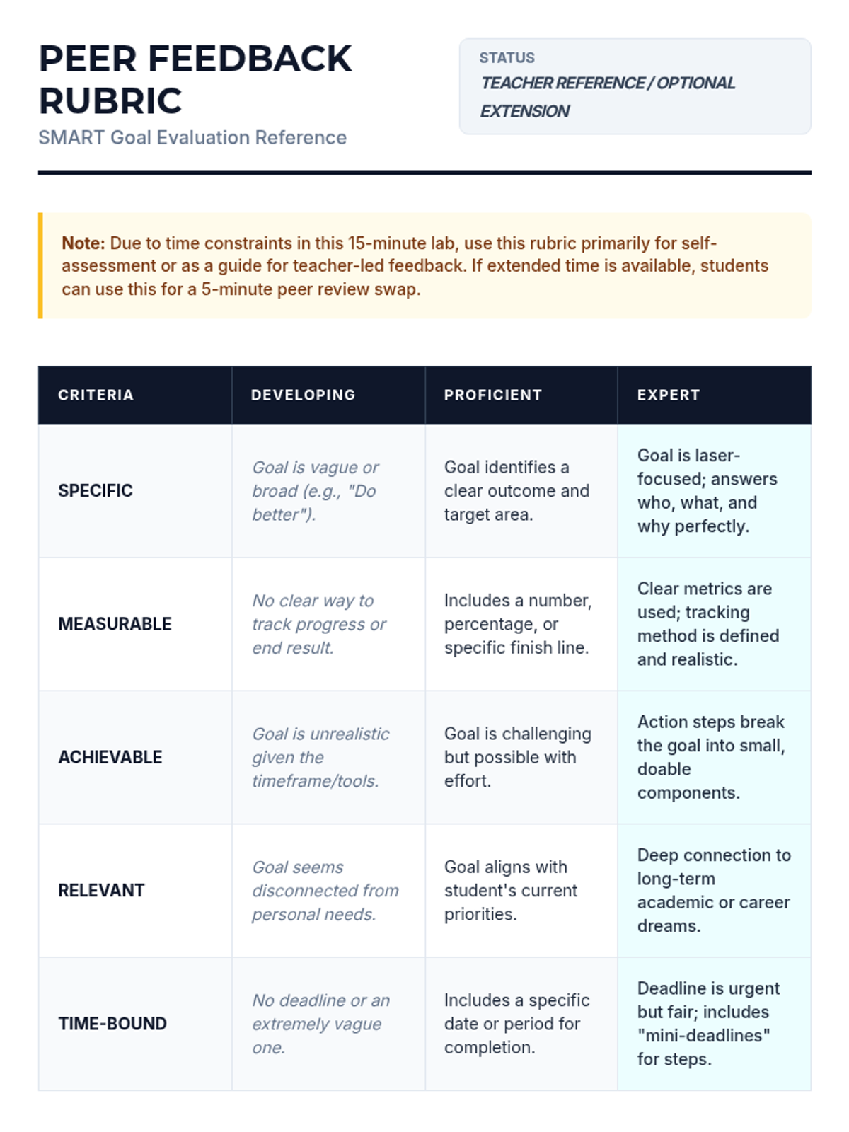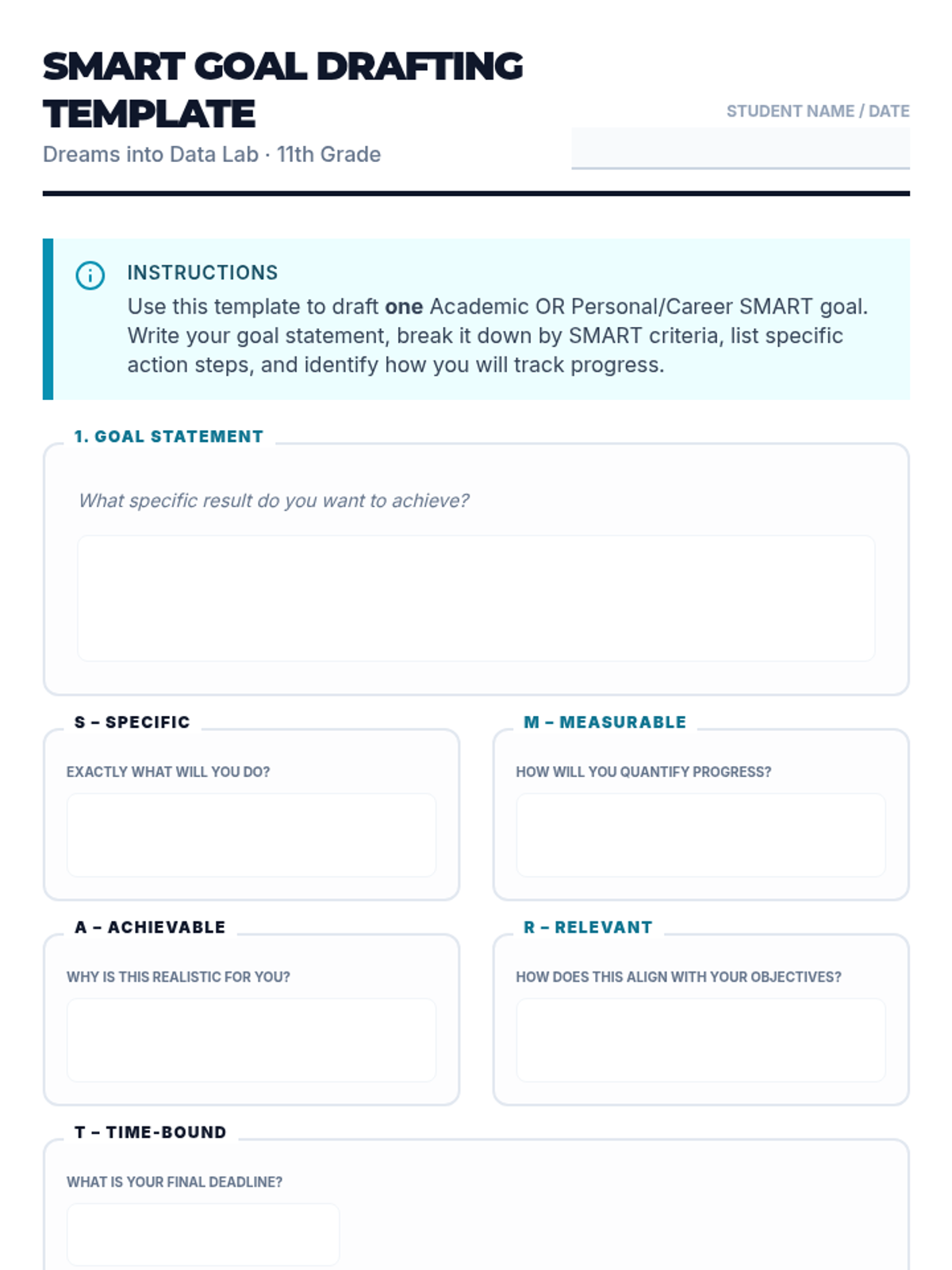 In this single-session lab, 11th graders transform personal and academic aspirations into SMART goals by drafting one academic and one personal/career target with measurable steps and deadlines. This practical exercise strengthens strategic planning, motivation, and progress monitoring skills—empowering students to track their own growth.