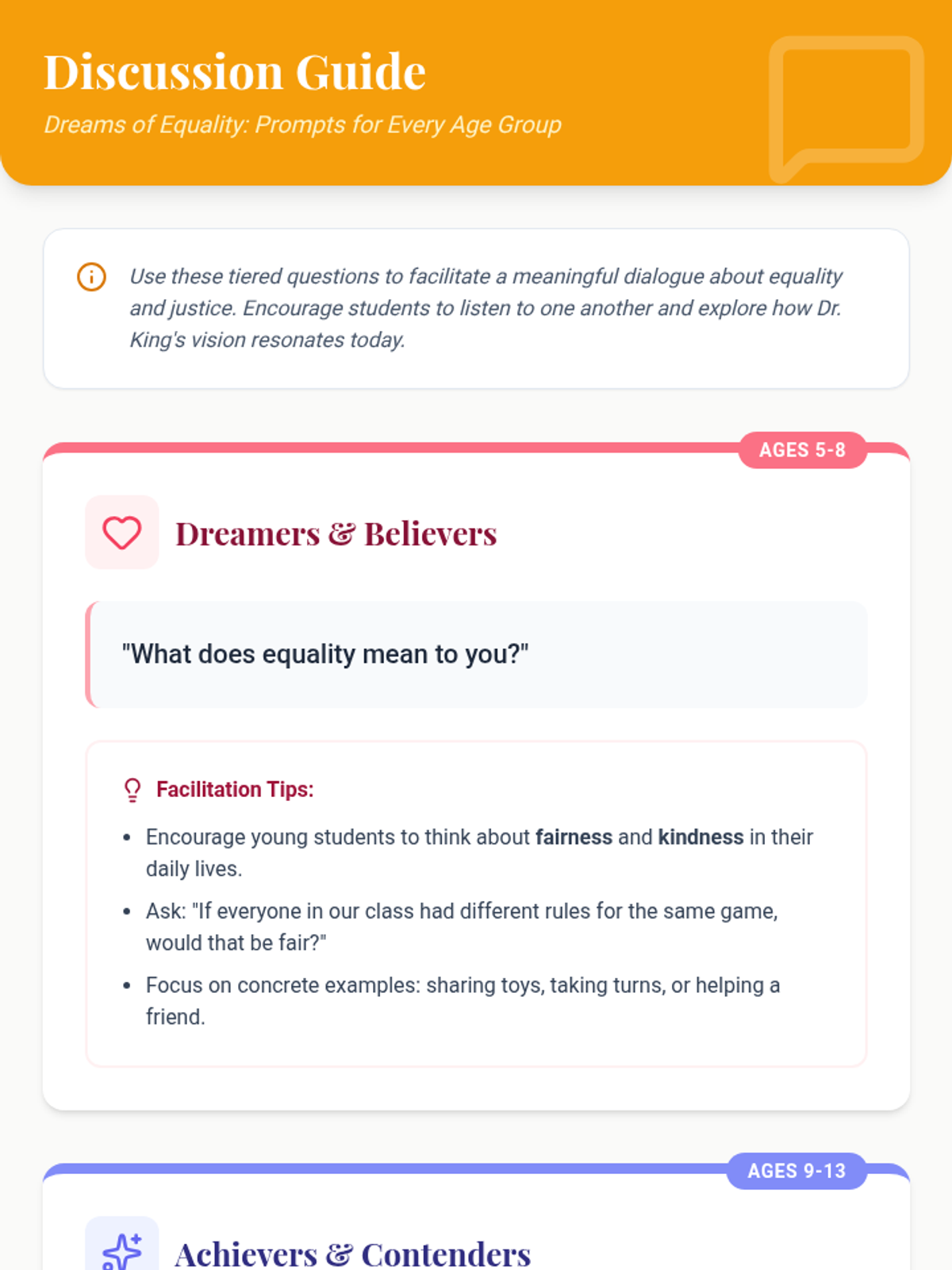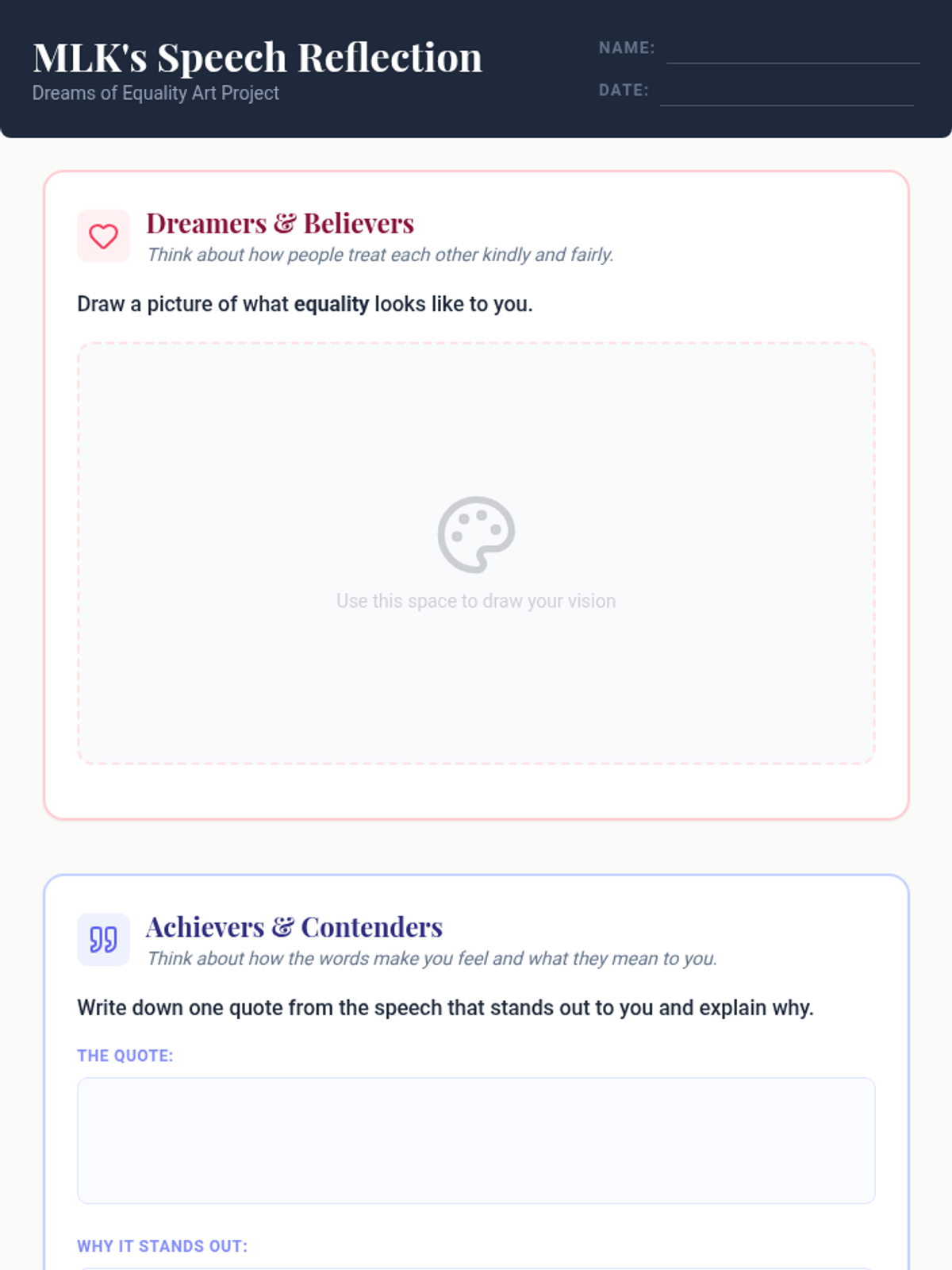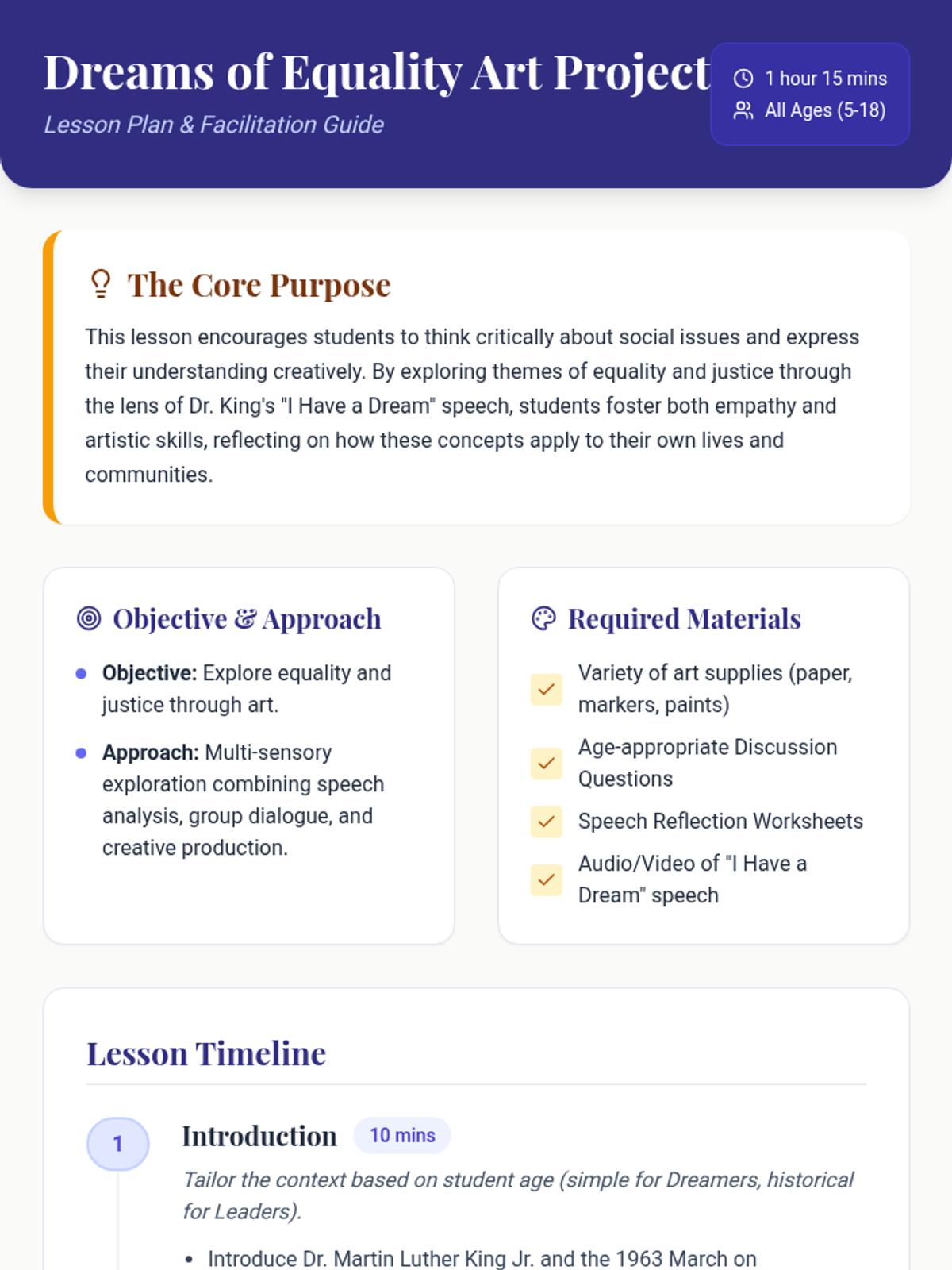 Students of all age groups will create art pieces inspired by Martin Luther King Jr.'s 'I Have a Dream' speech, exploring themes of equality and justice through reflection and creative expression.
