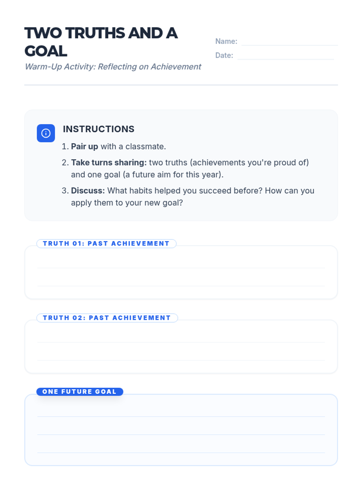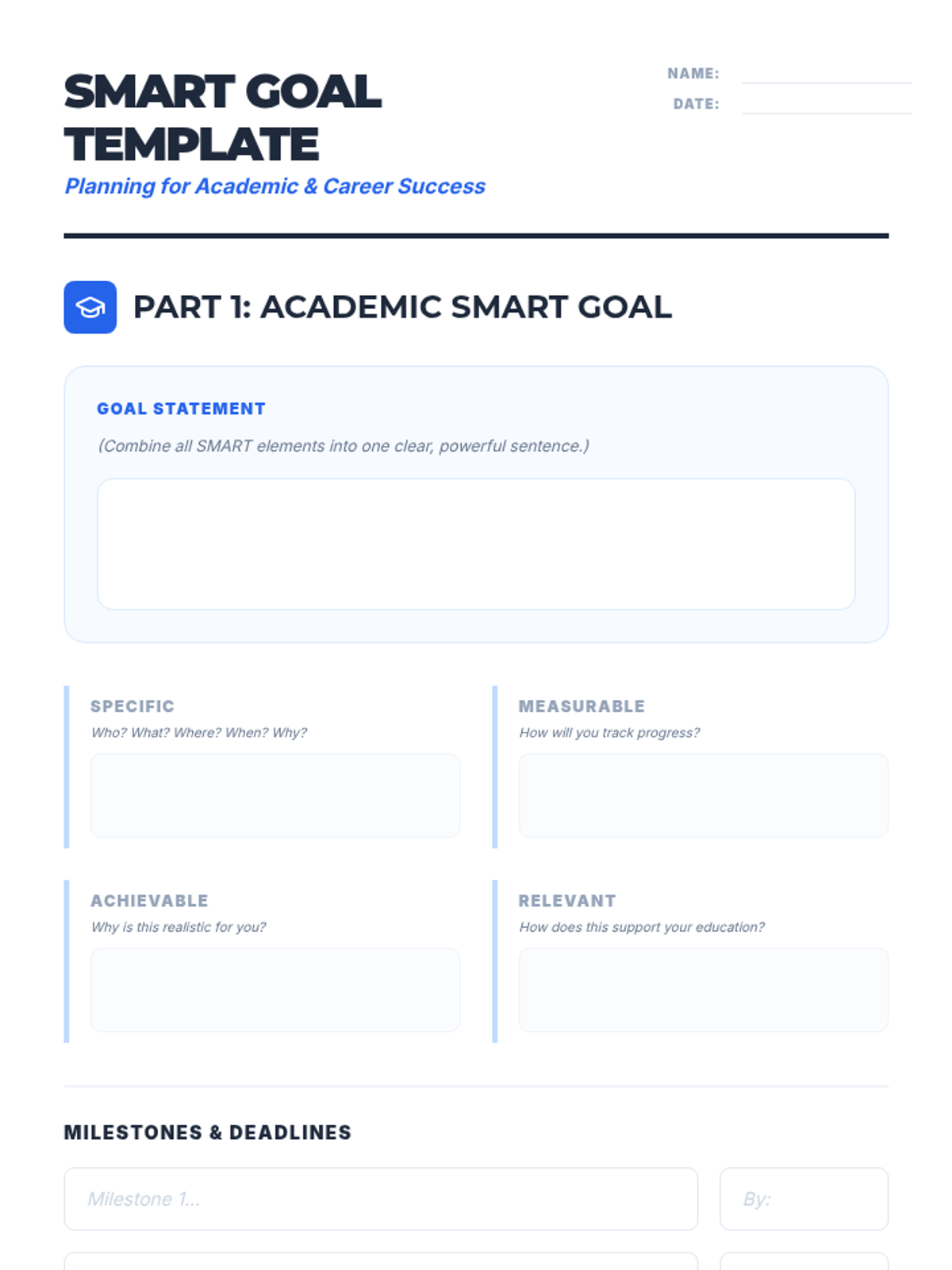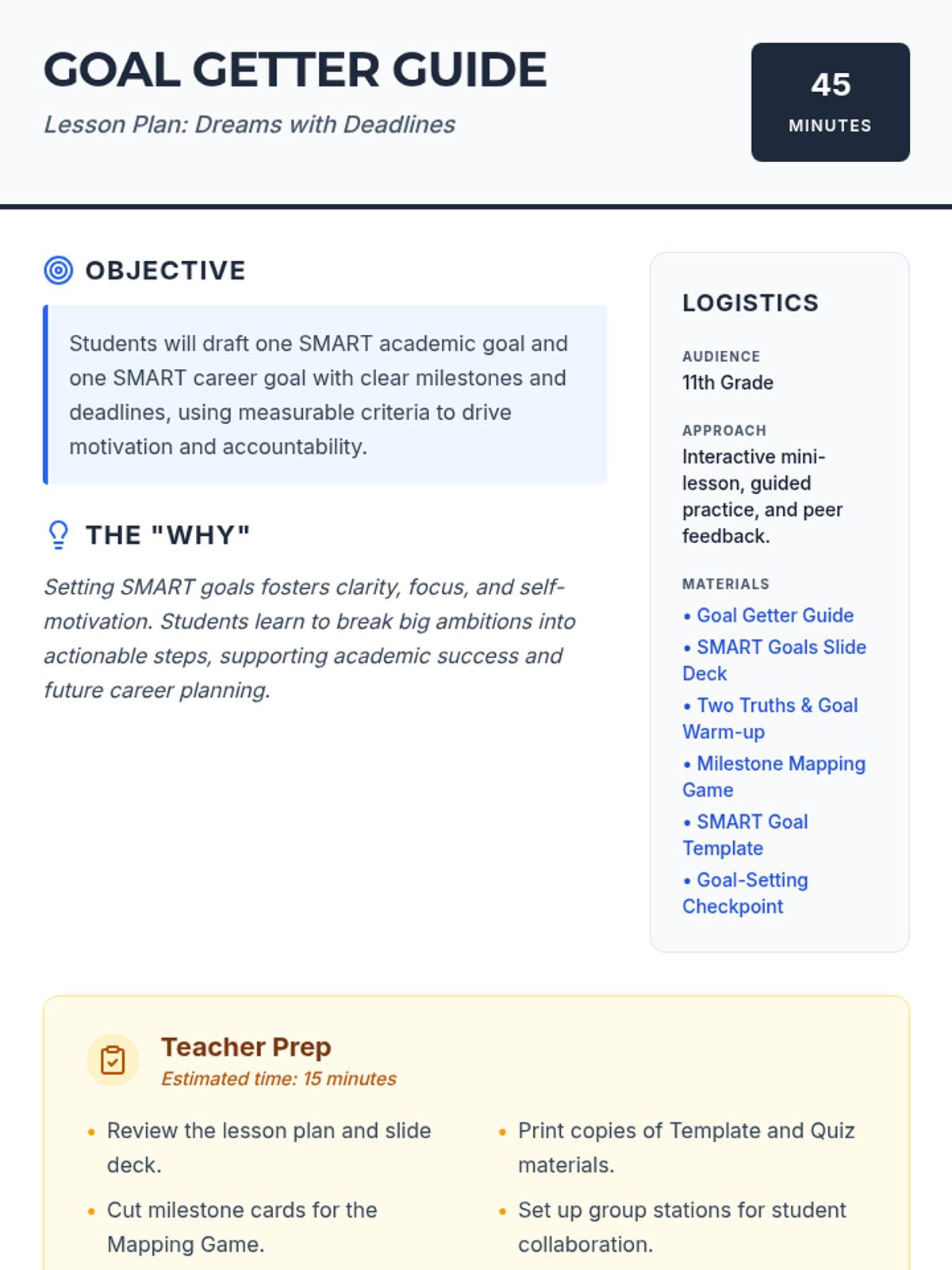 A 45-minute 11th grade lesson where students craft one SMART academic goal and one SMART career goal. Students learn to break ambitions into measurable milestones and deadlines, fostering planning and motivation skills.