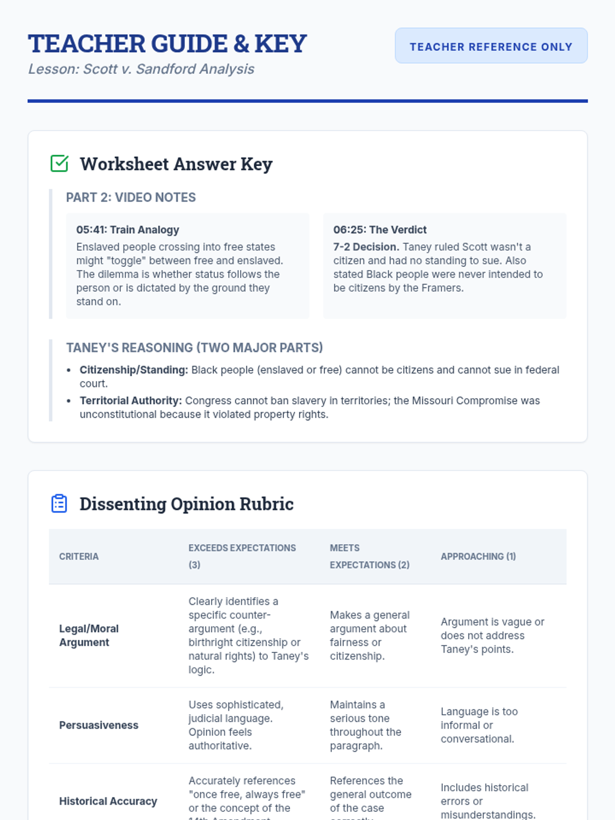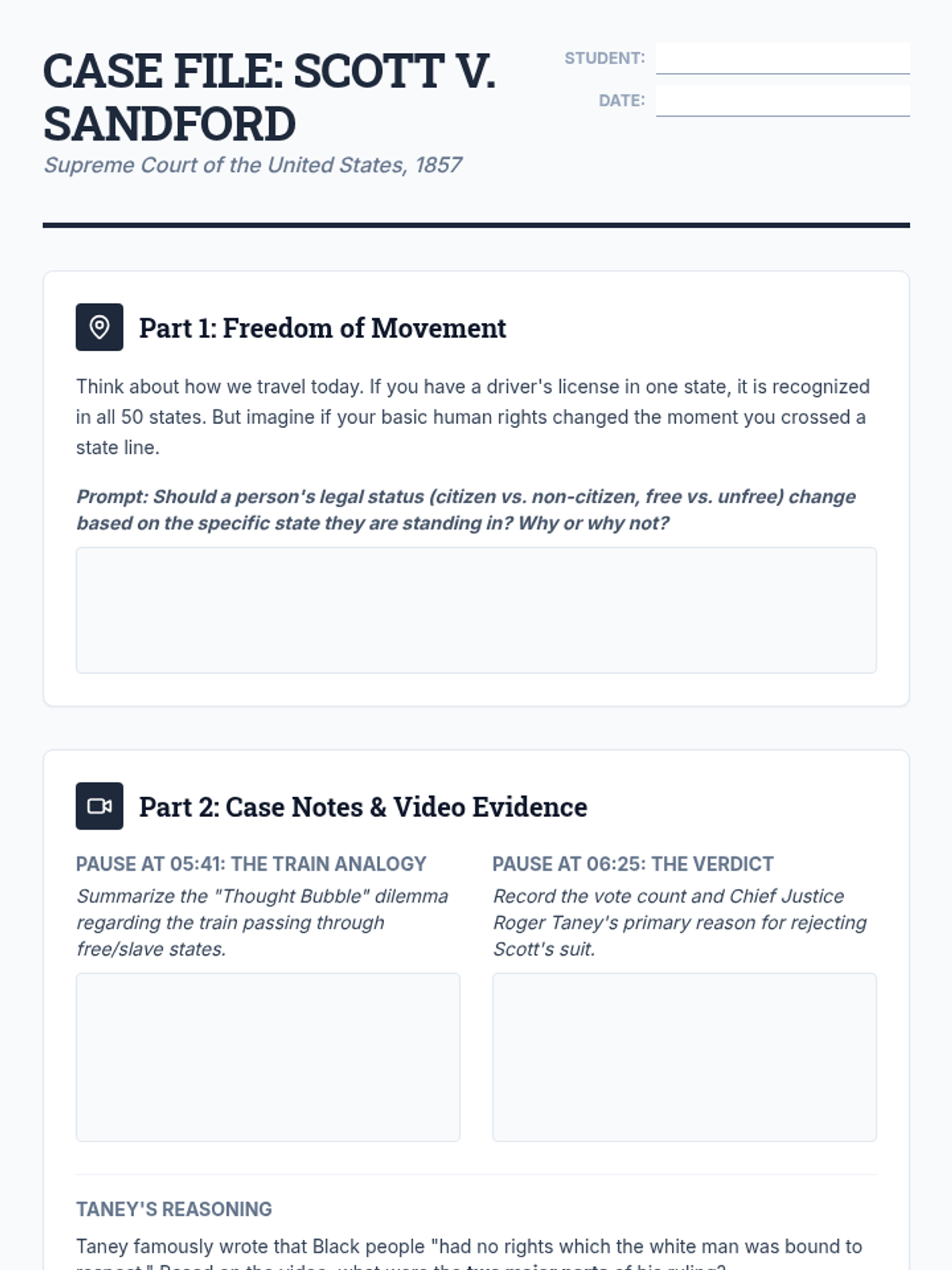 Students analyze the landmark Supreme Court case *Dred Scott v. Sandford*, evaluating Chief Justice Taney's logic and drafting their own dissenting opinions based on legal and moral arguments.