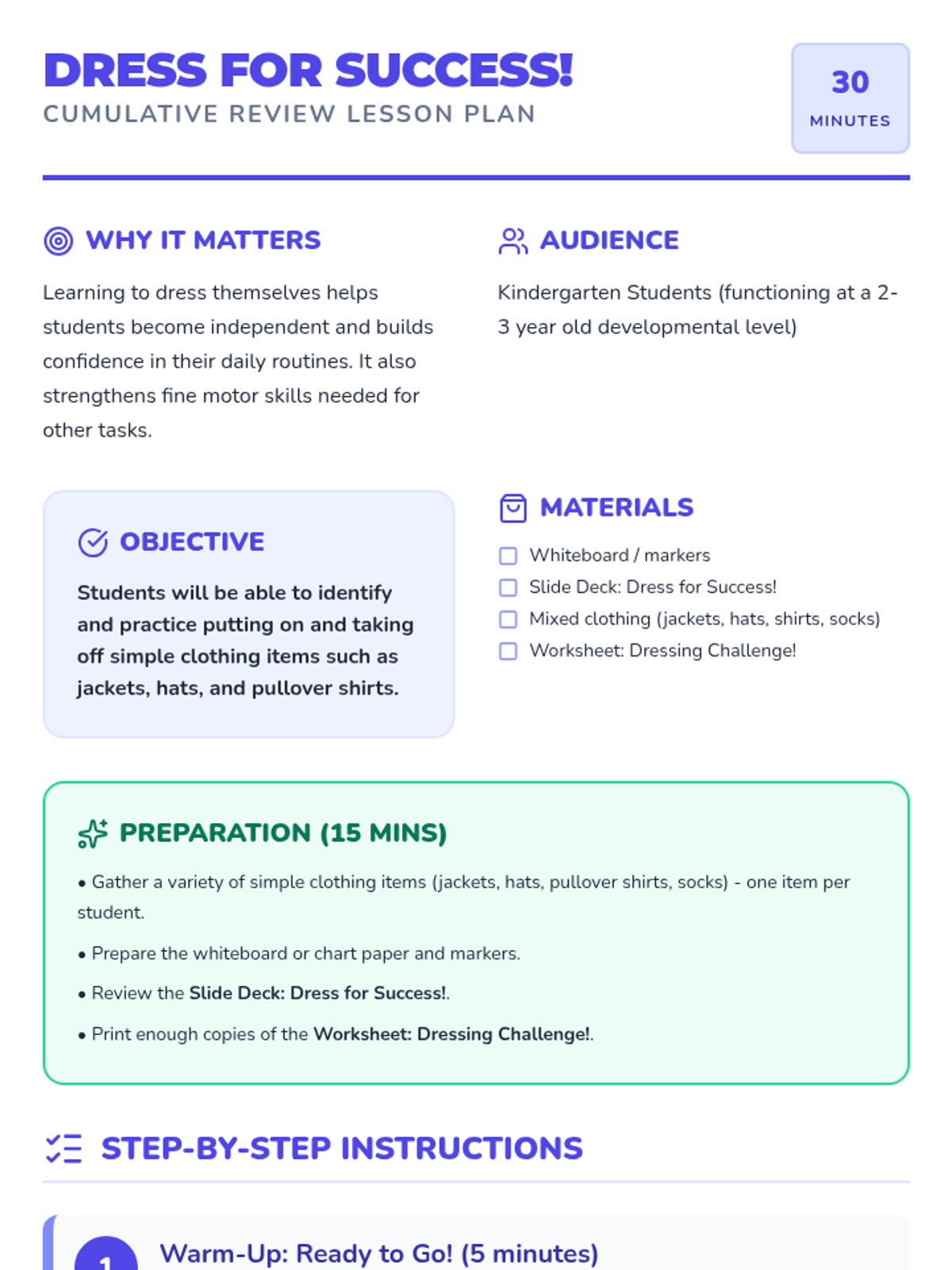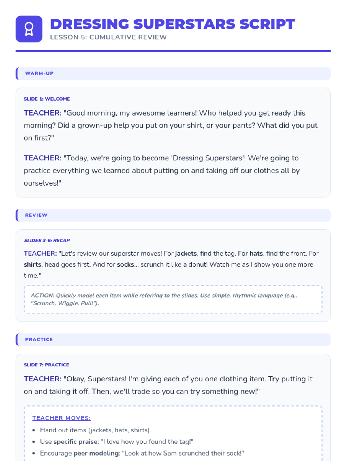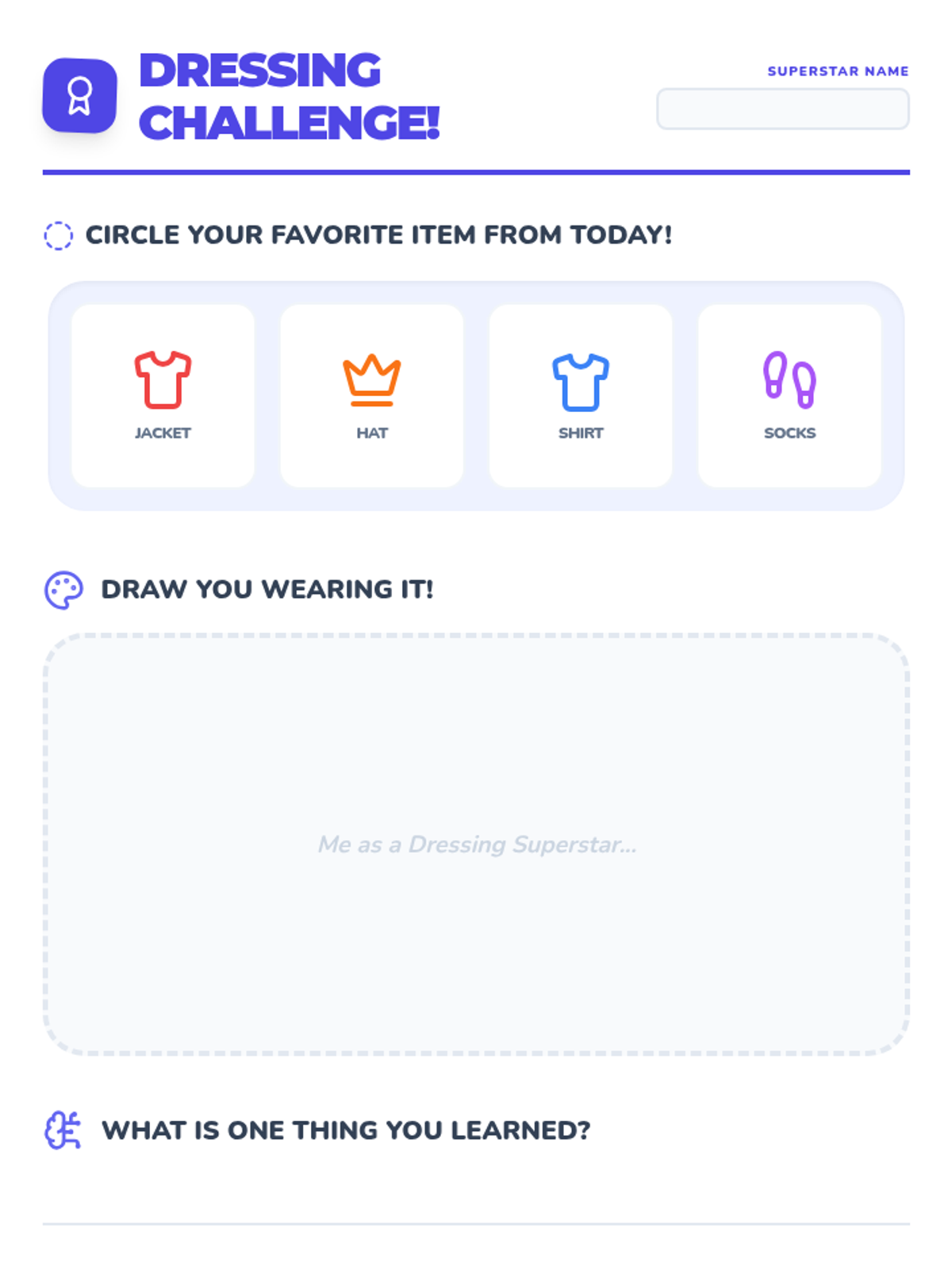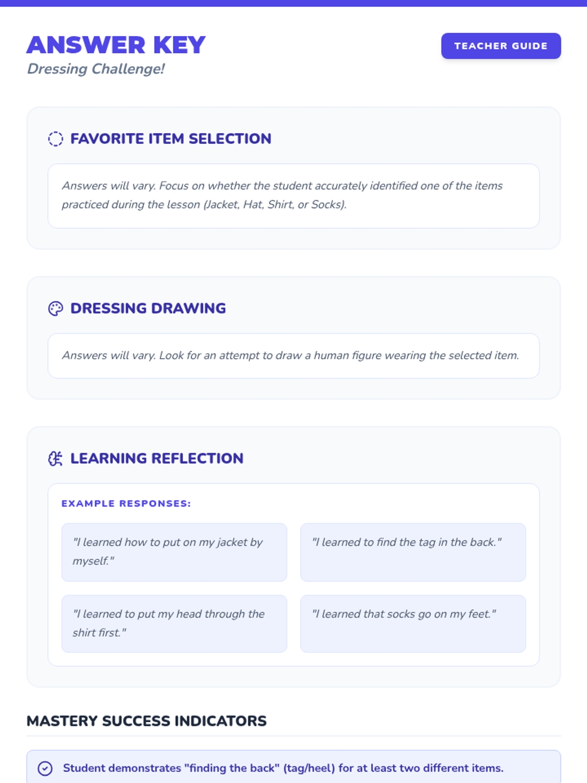 Students practice putting on and taking off multiple clothing items (jackets, hats, shirts, socks) to consolidate their independence skills.