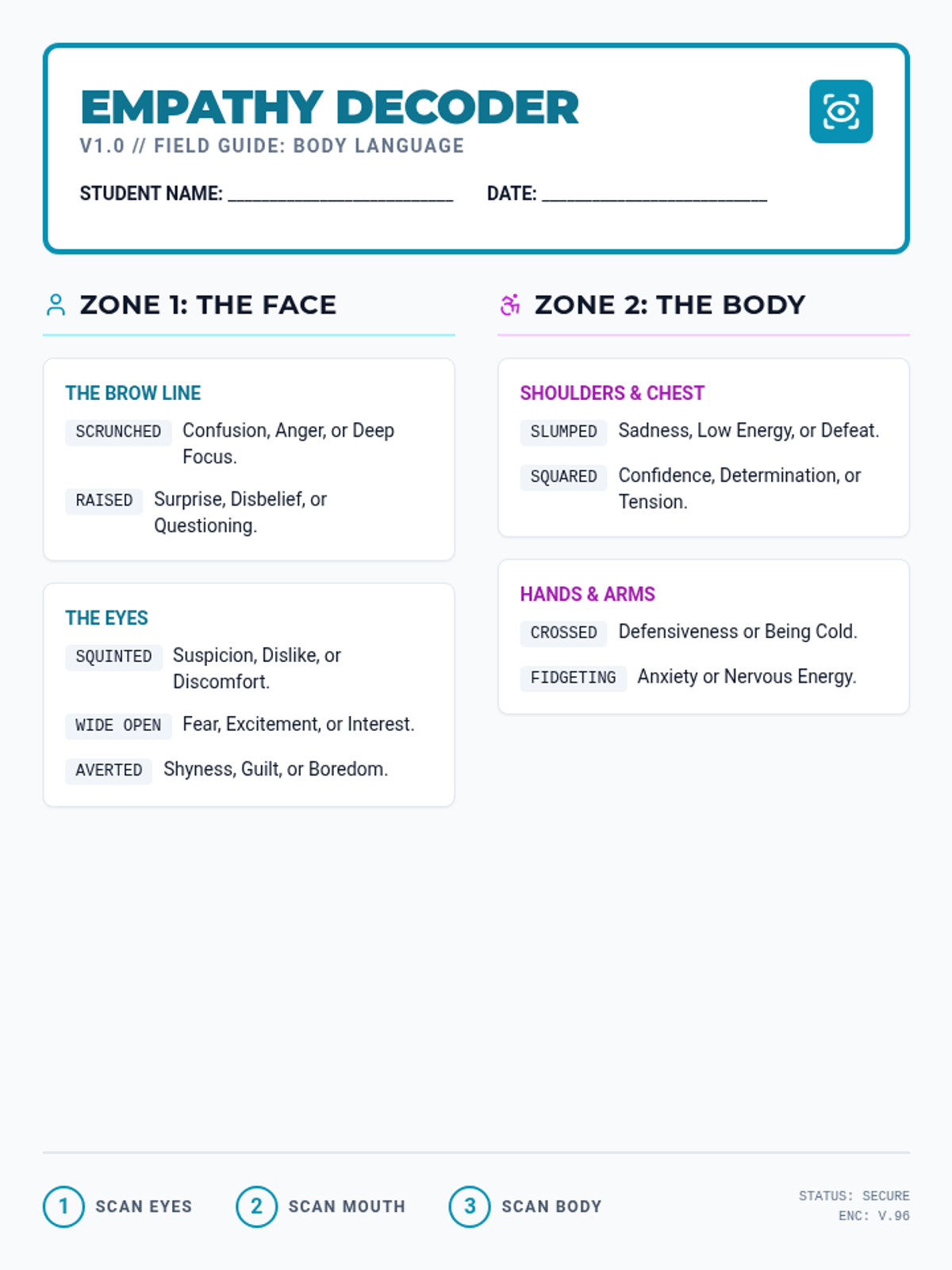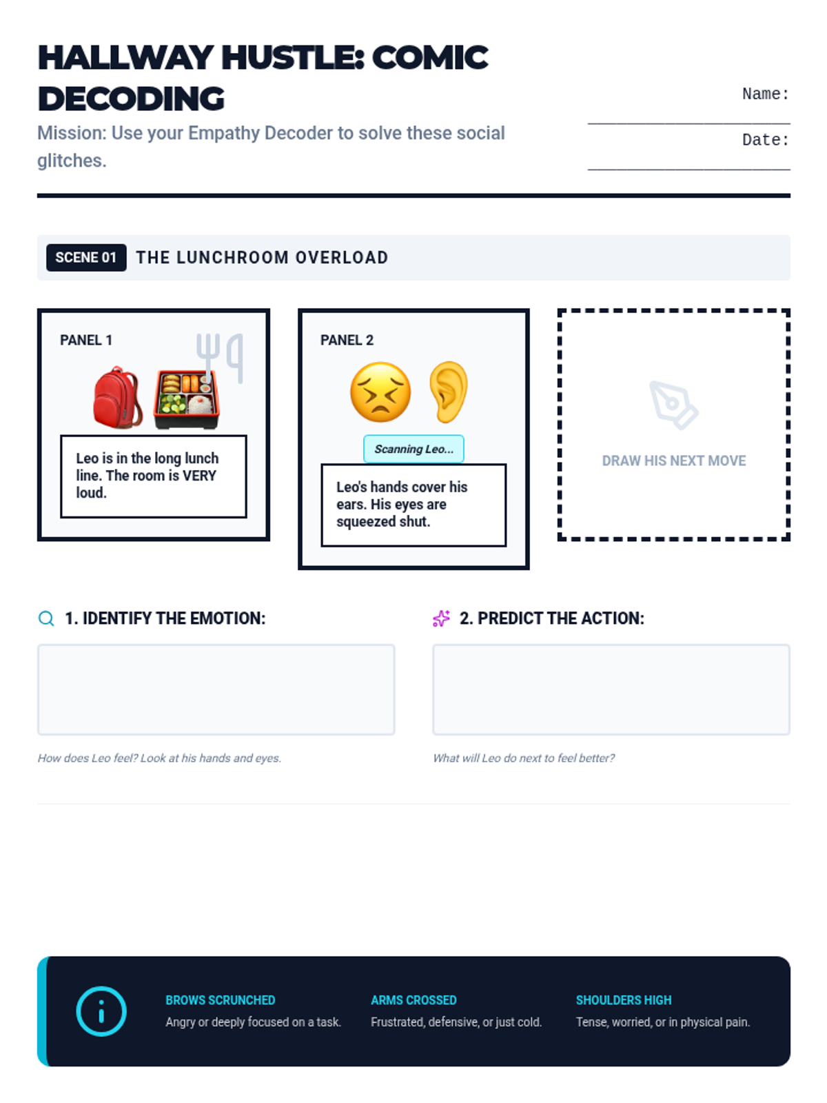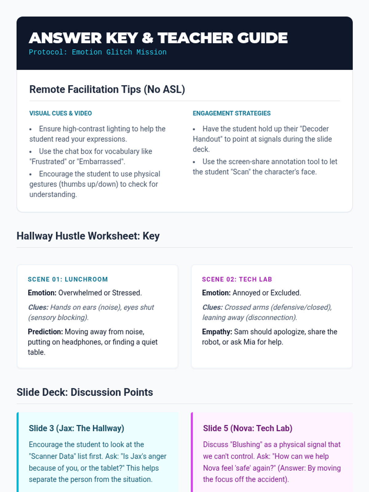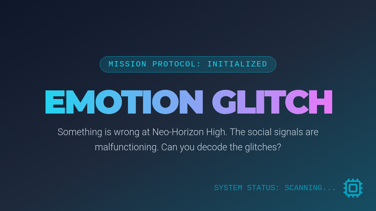 Students explore a futuristic high school hallway and tech lab to identify 'glitches' in social communication. They learn to decode body language and facial expressions in complex social situations.