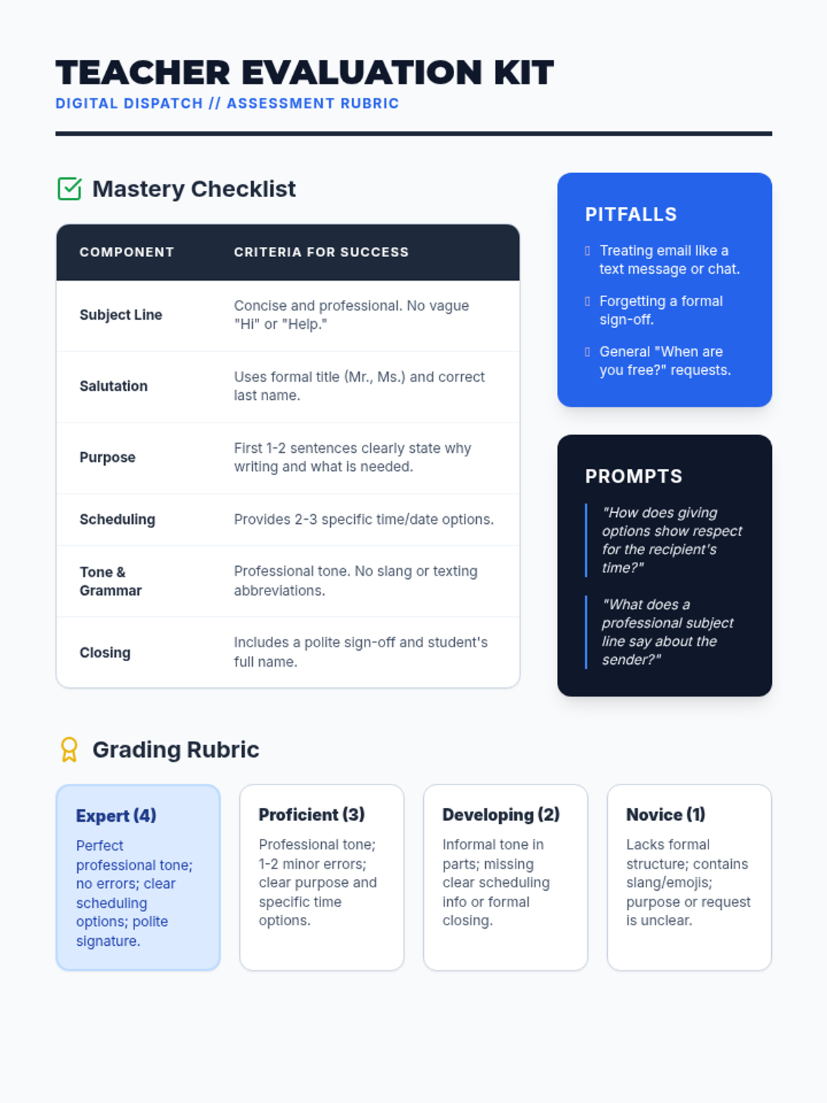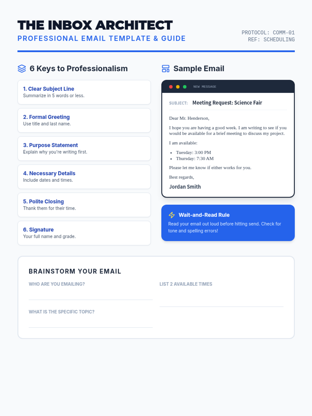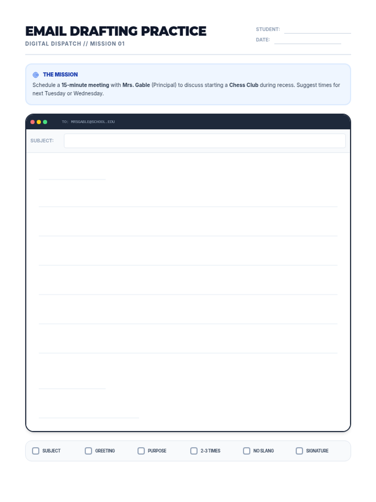 A lesson for middle schoolers on the art of professional email communication, focusing on scheduling meetings with clarity and courtesy.