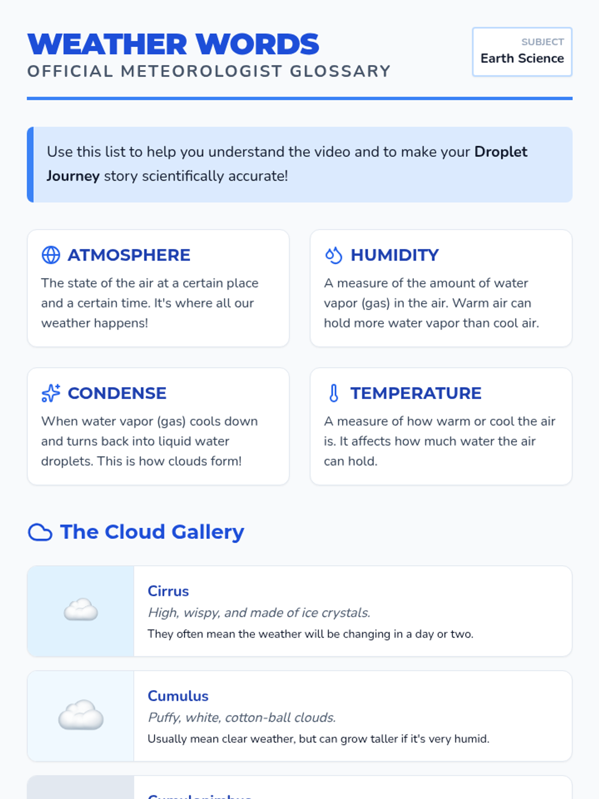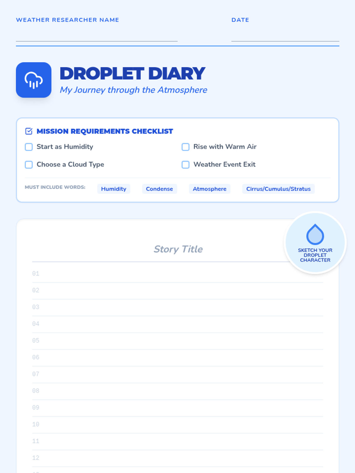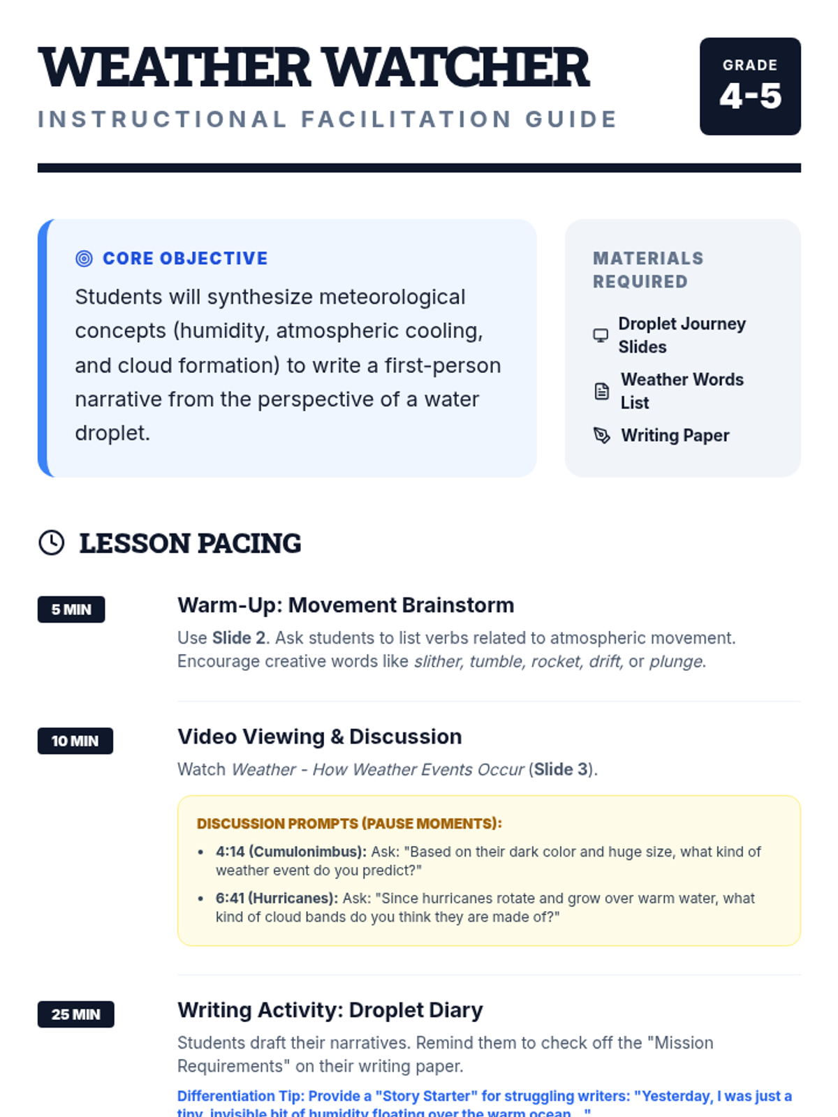 A creative writing lesson where 4th-5th grade students transform into water droplets to explore humidity, cloud formation, and severe weather based on a meteorological video. Students use key vocabulary to narrate their journey through the atmosphere.