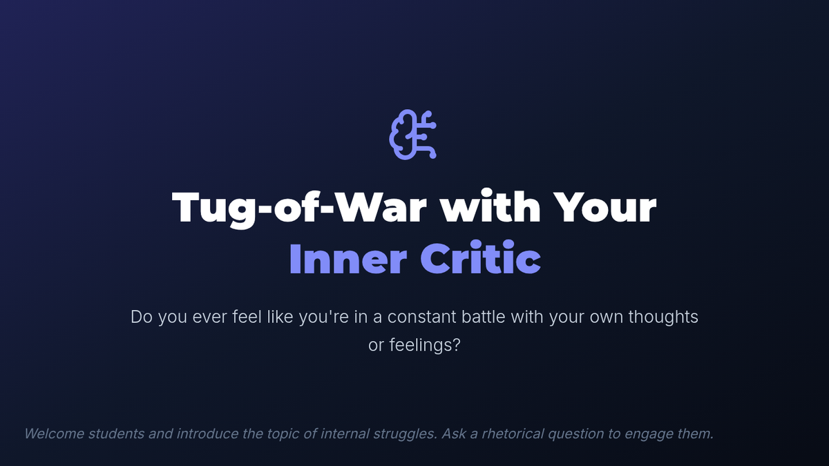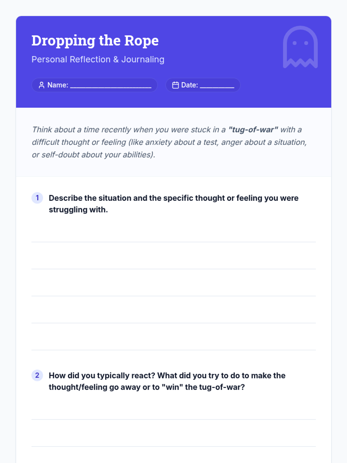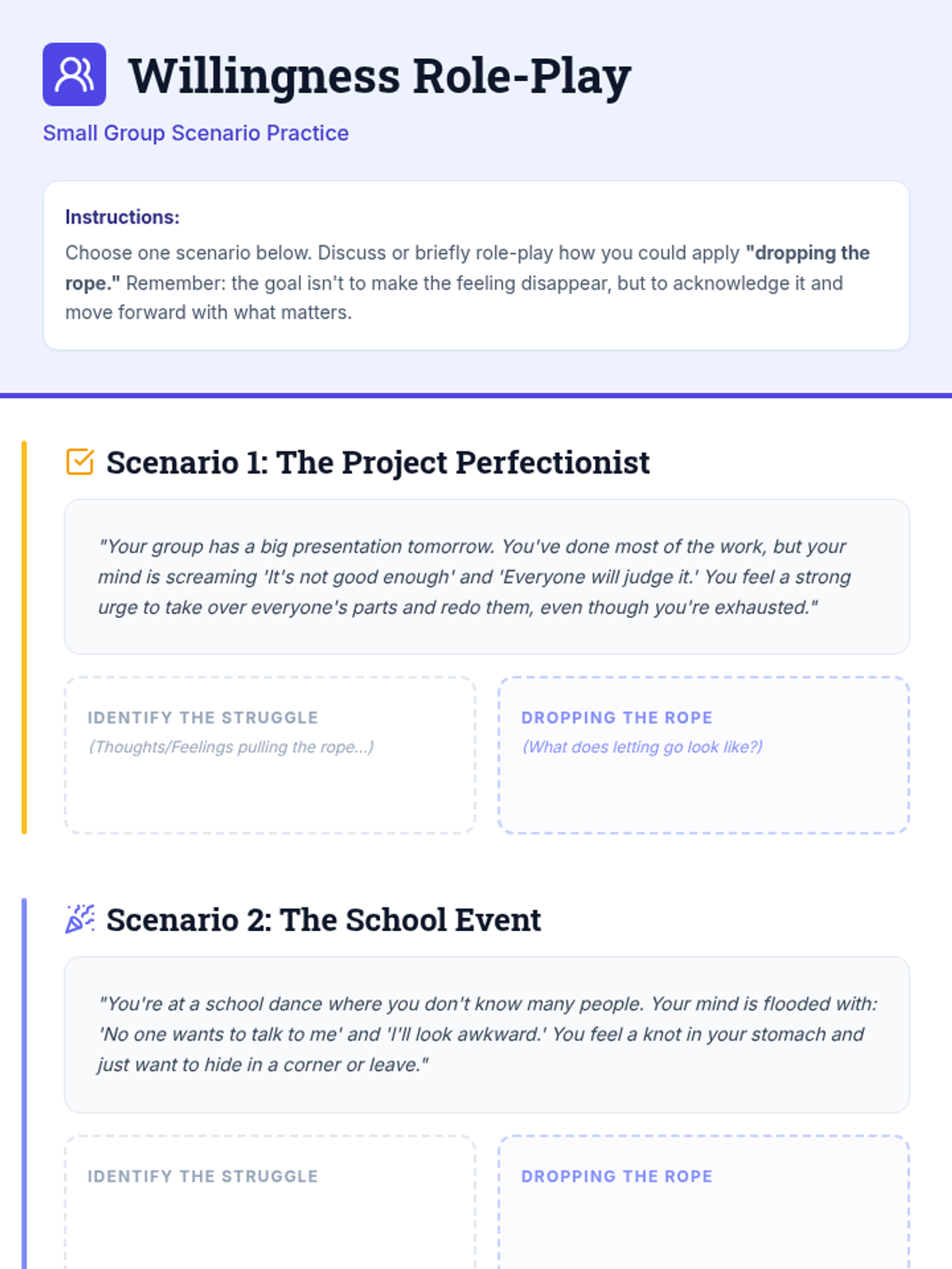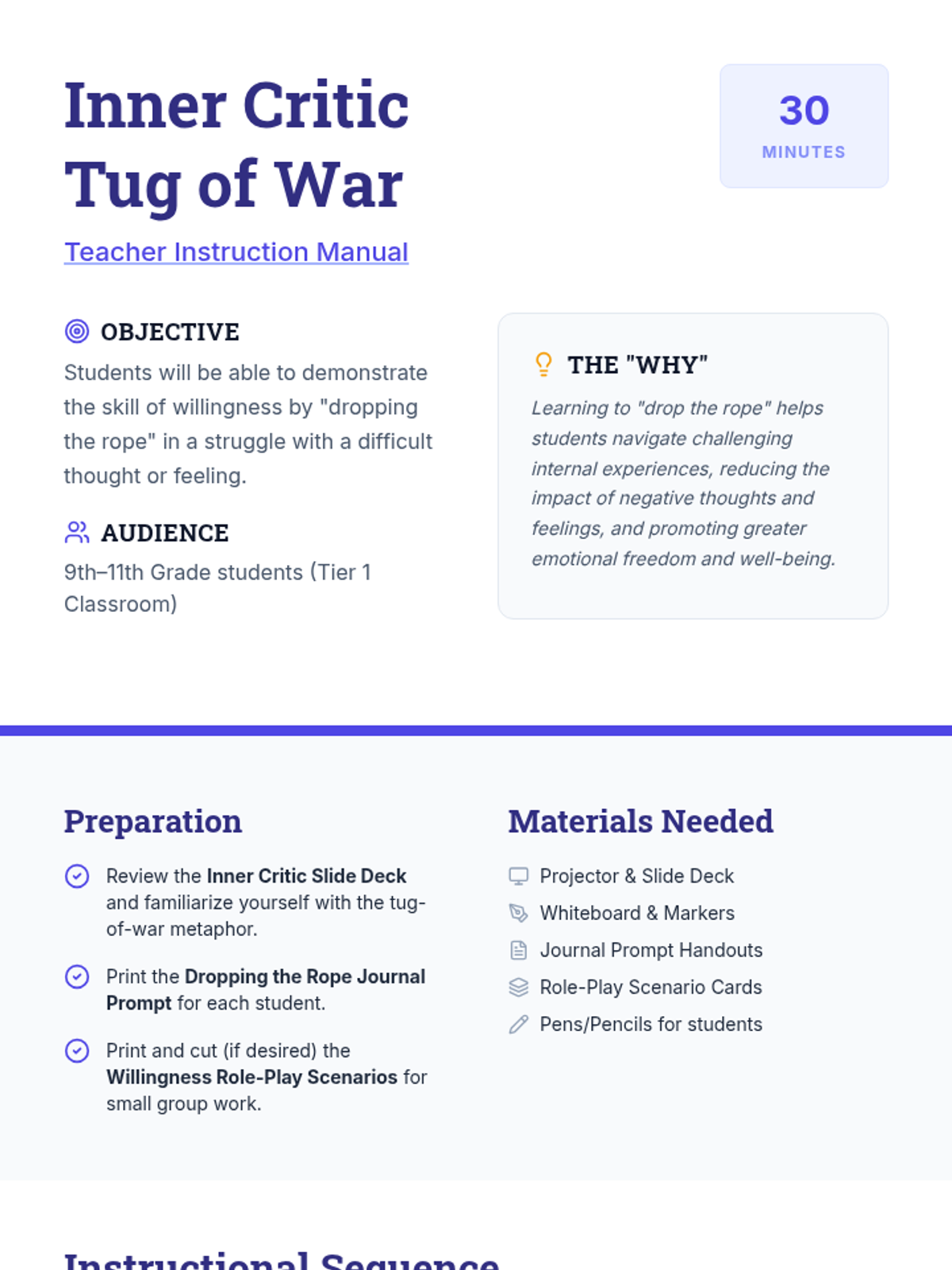 A 30-minute lesson for high schoolers on developing emotional willingness. Students learn the 'Tug-of-War' metaphor to disengage from negative thoughts and focus on what matters.