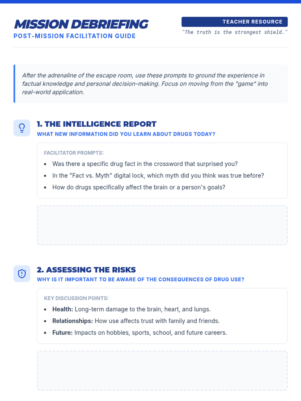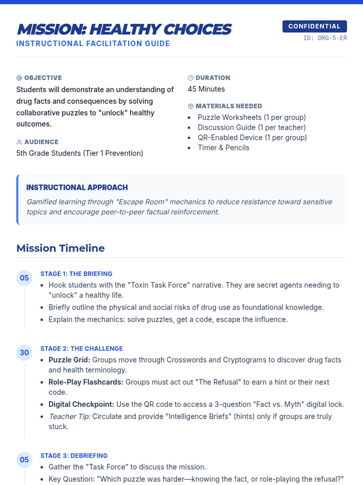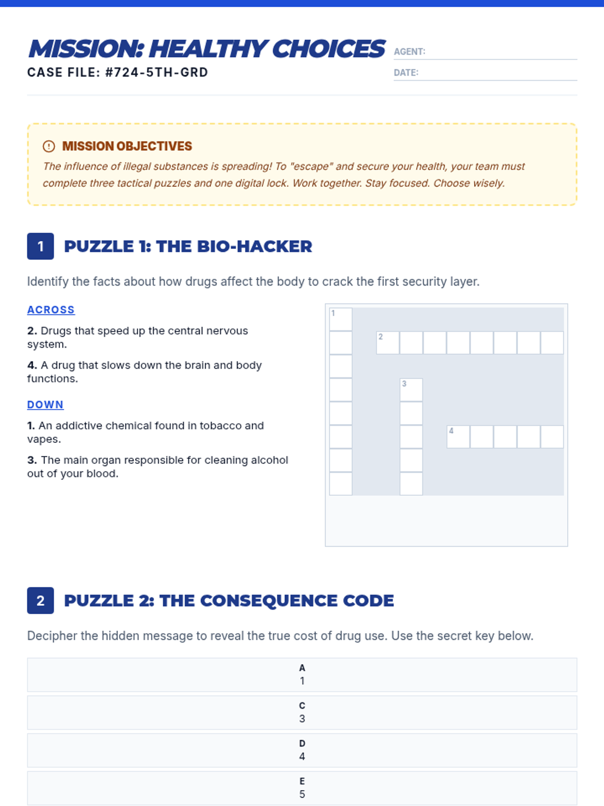Students collaborate in a high-stakes 'escape room' challenge, solving puzzles and role-playing scenarios to learn critical facts about drug consequences and healthy decision-making.