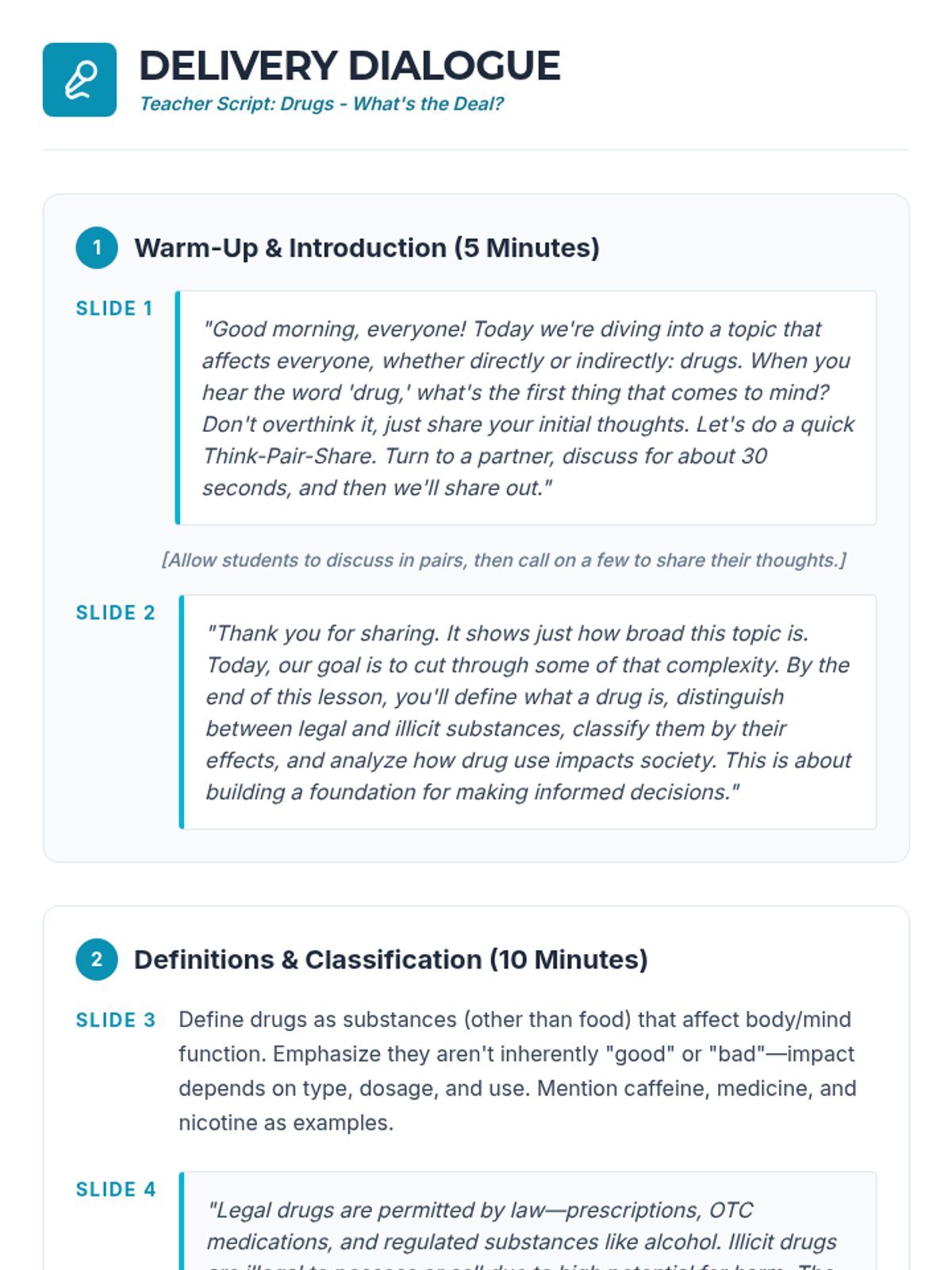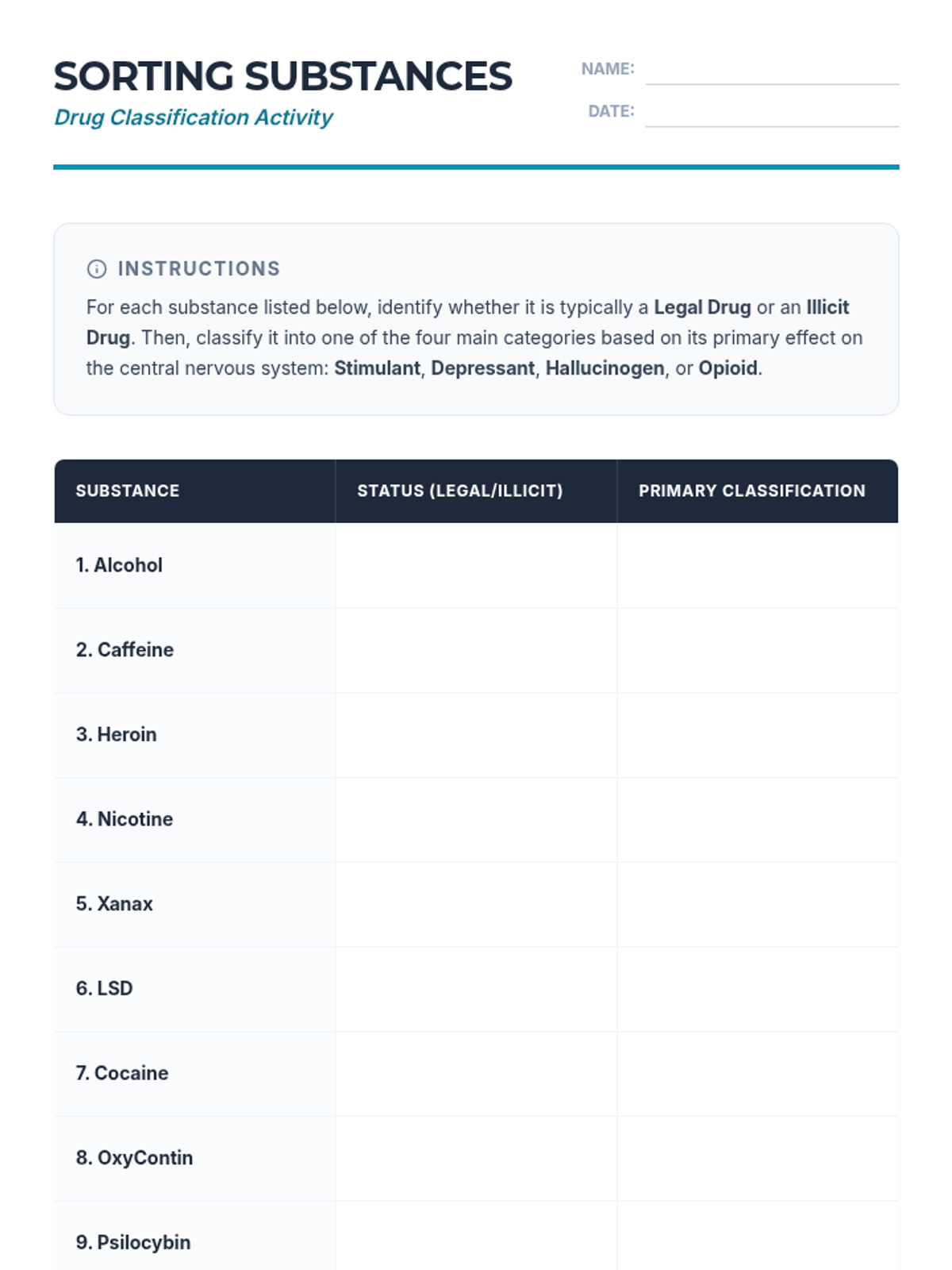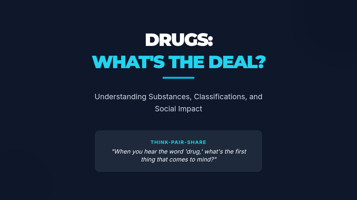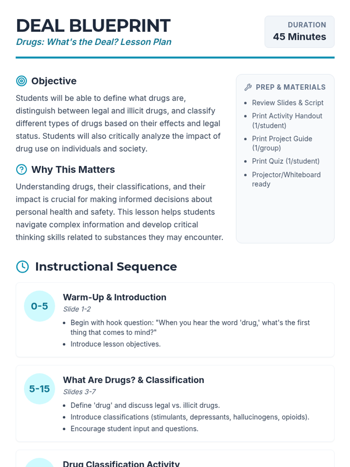 A comprehensive 45-minute lesson for 12th-grade students covering drug definitions, legal vs. illicit substances, classifications (stimulants, depressants, hallucinogens, opioids), and societal impact analysis.