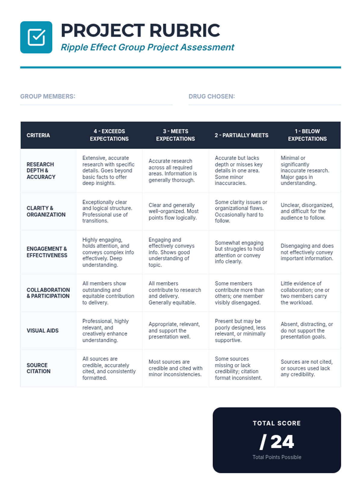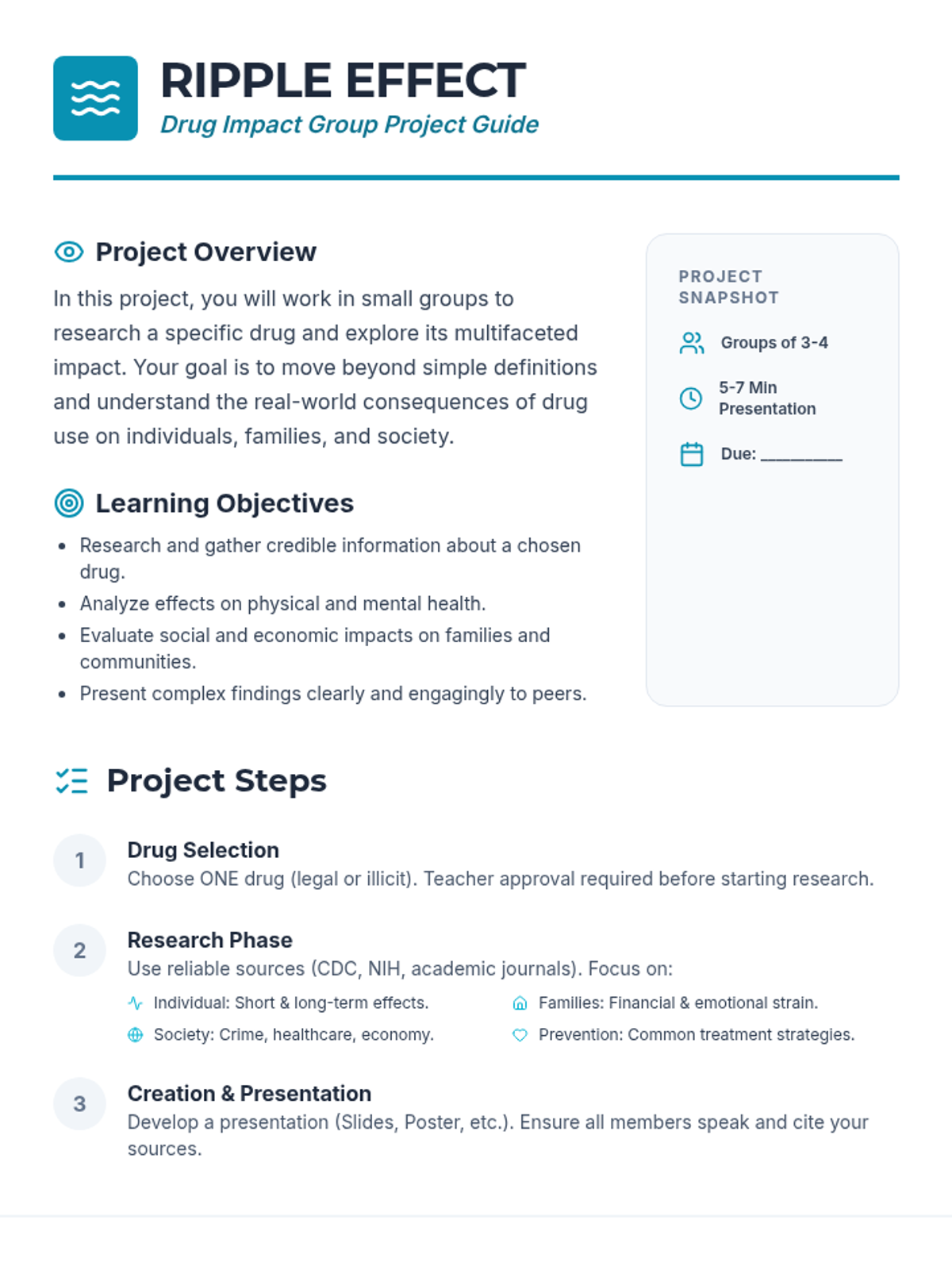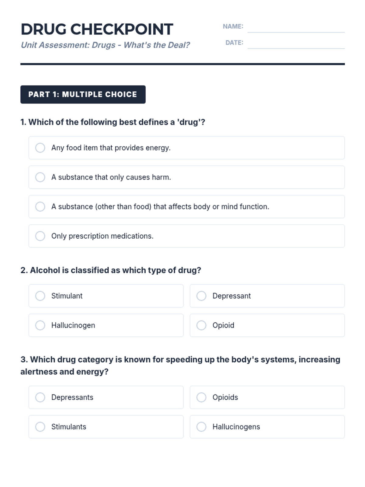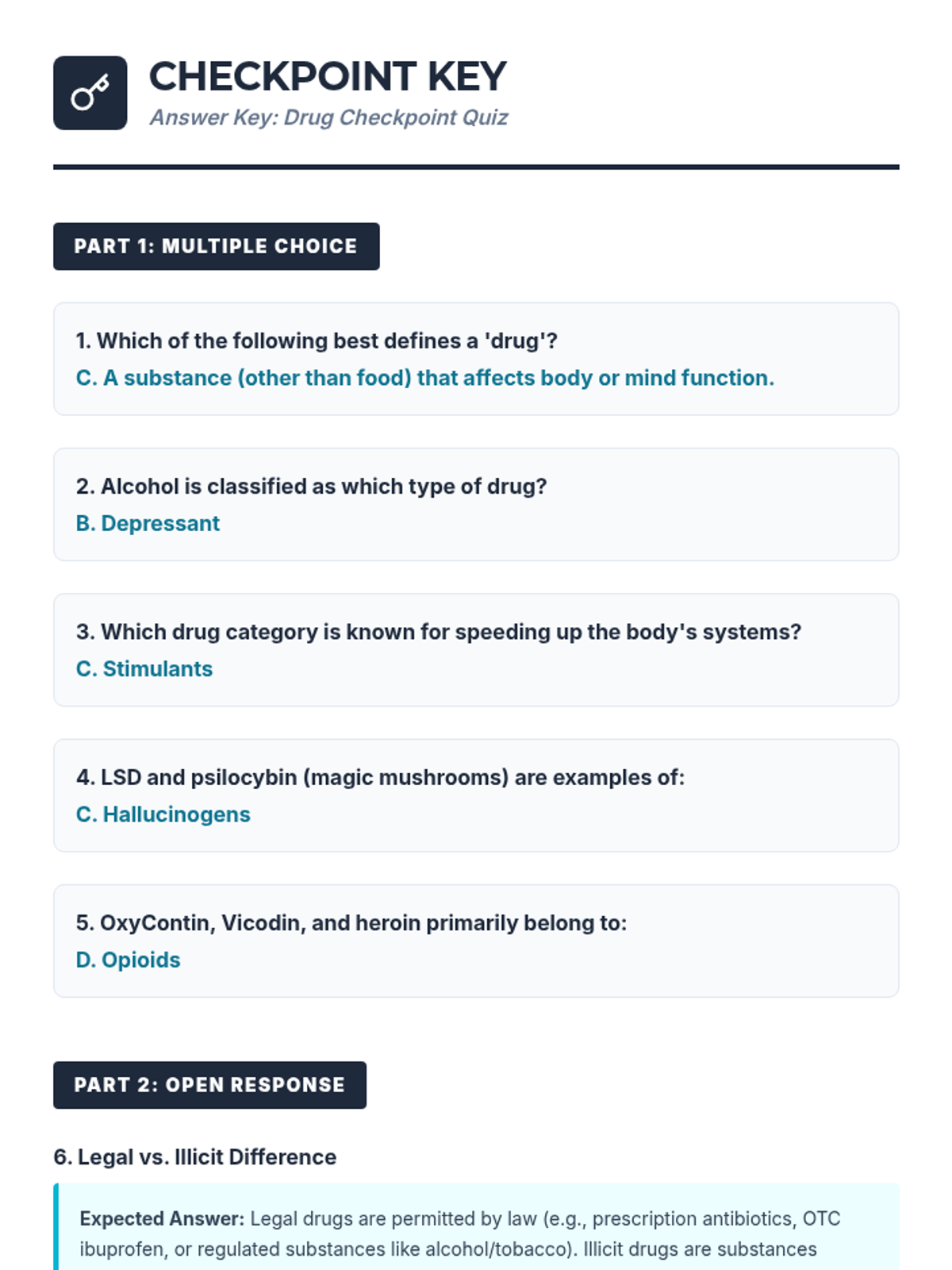 A comprehensive 45-minute lesson for 12th-grade students covering drug definitions, legal vs. illicit substances, classifications (stimulants, depressants, hallucinogens, opioids), and societal impact analysis.