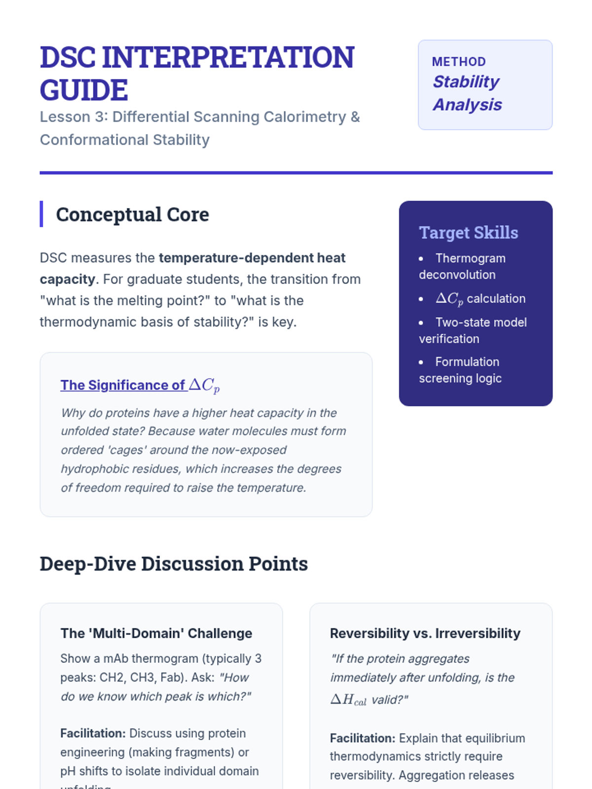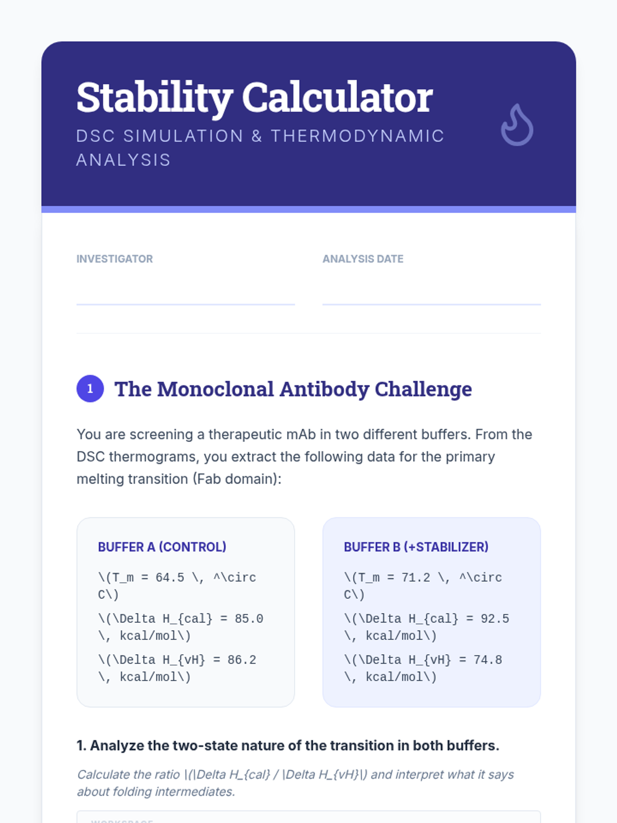 Students examine DSC thermograms to study protein unfolding and phase transitions, calculating heat capacity changes and melting temperatures.