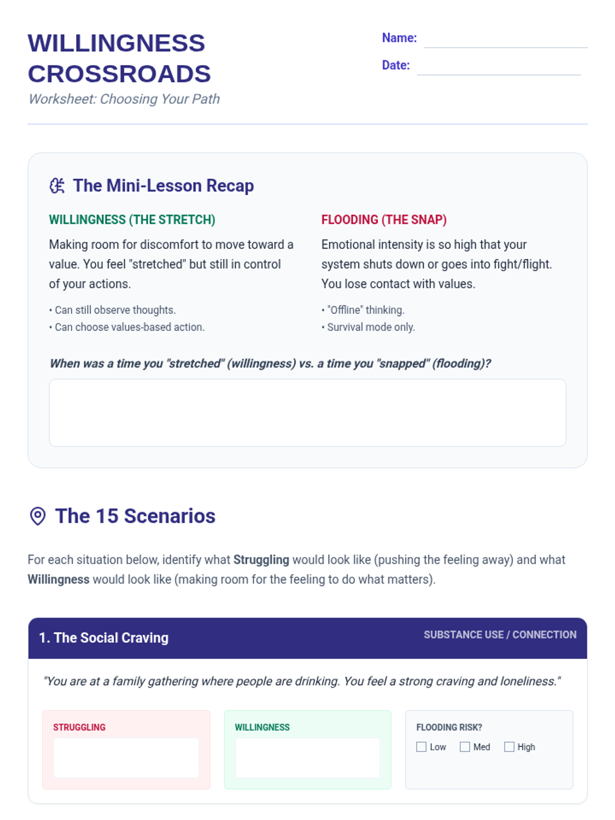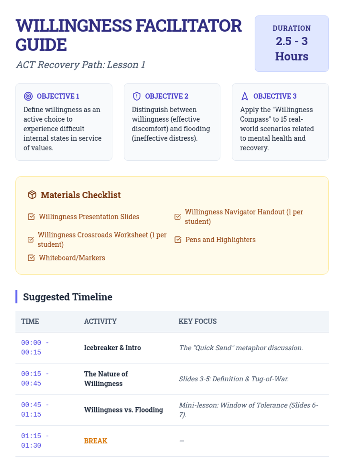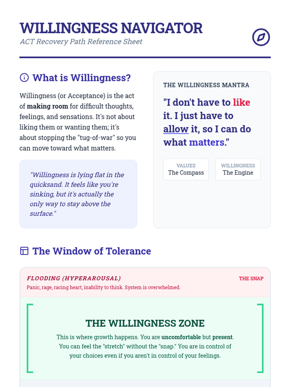 This lesson covers the ACT core process of Willingness (Acceptance), providing a mini-lesson on the 'Window of Tolerance' to distinguish between helpful stretching (willingness) and overwhelming distress (flooding).