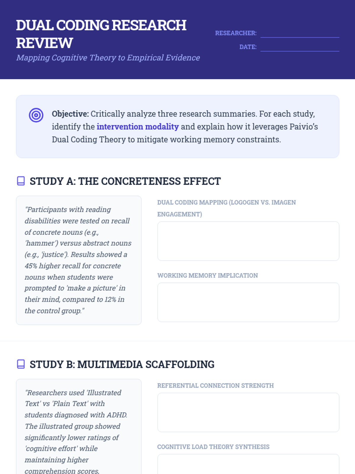 This lesson deepens understanding of Paivio’s Dual Coding Theory, examining how verbal and non-verbal processing systems interact. Students review literature on working memory constraints and how imagery acts as a scaffold.