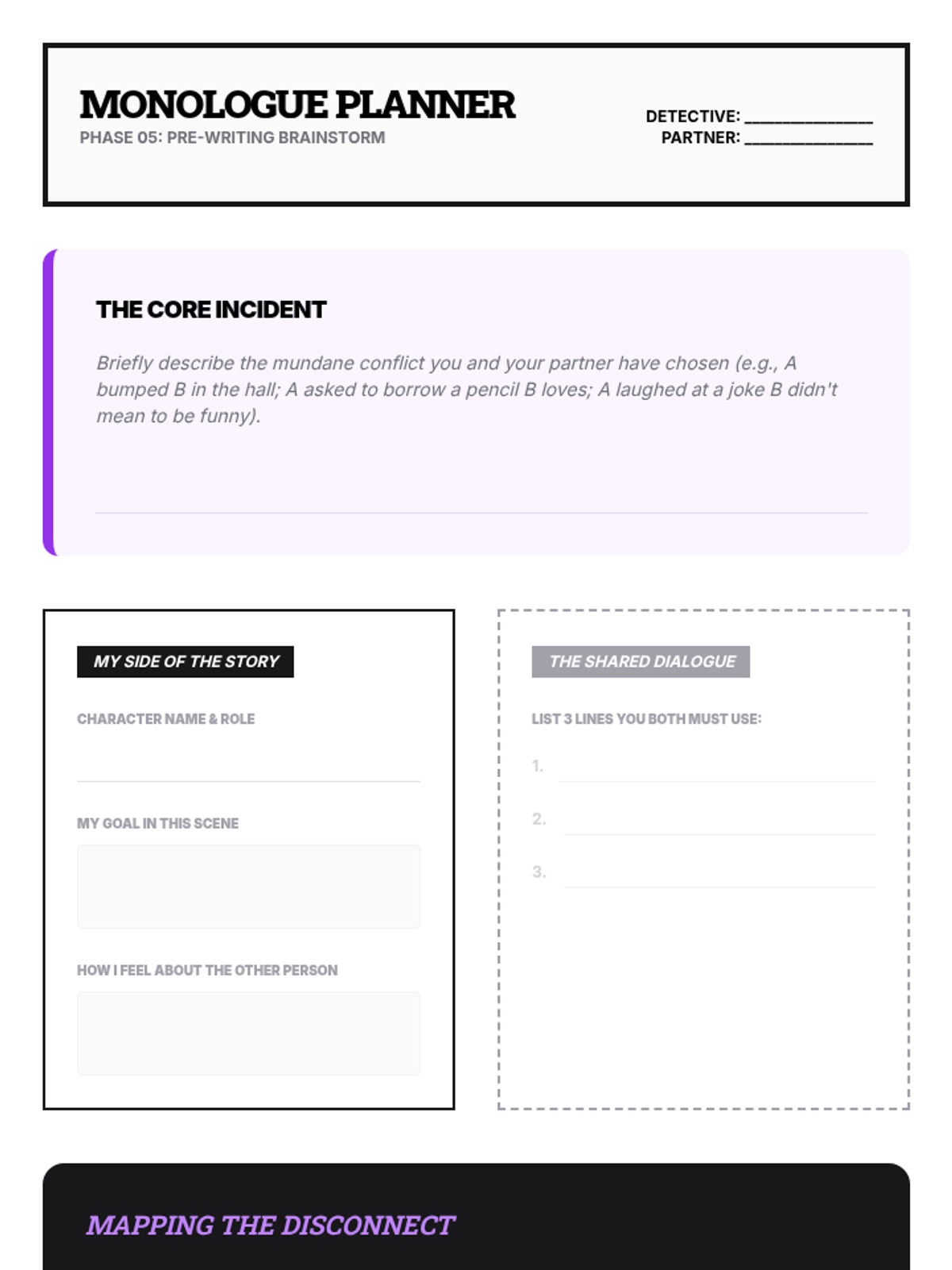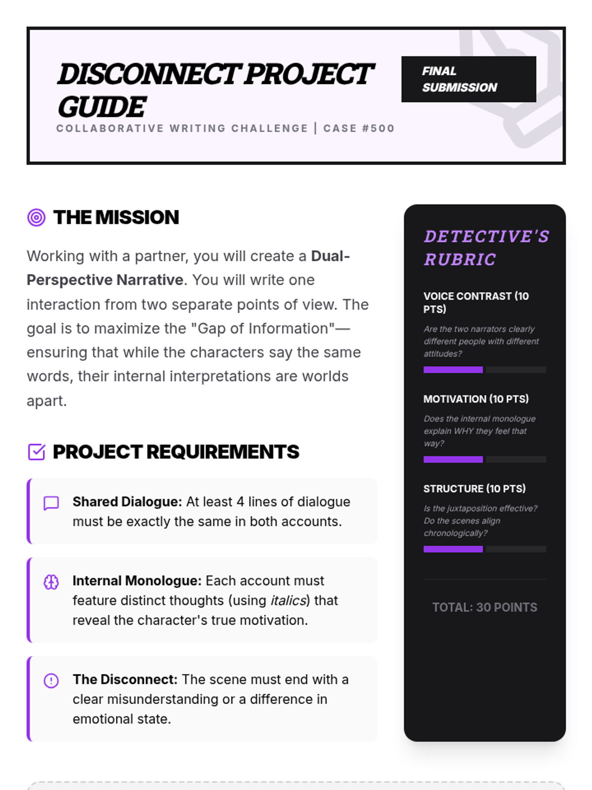 Students collaborate to write a single scene from dual perspectives, juxtaposing internal monologues to highlight character disconnect.