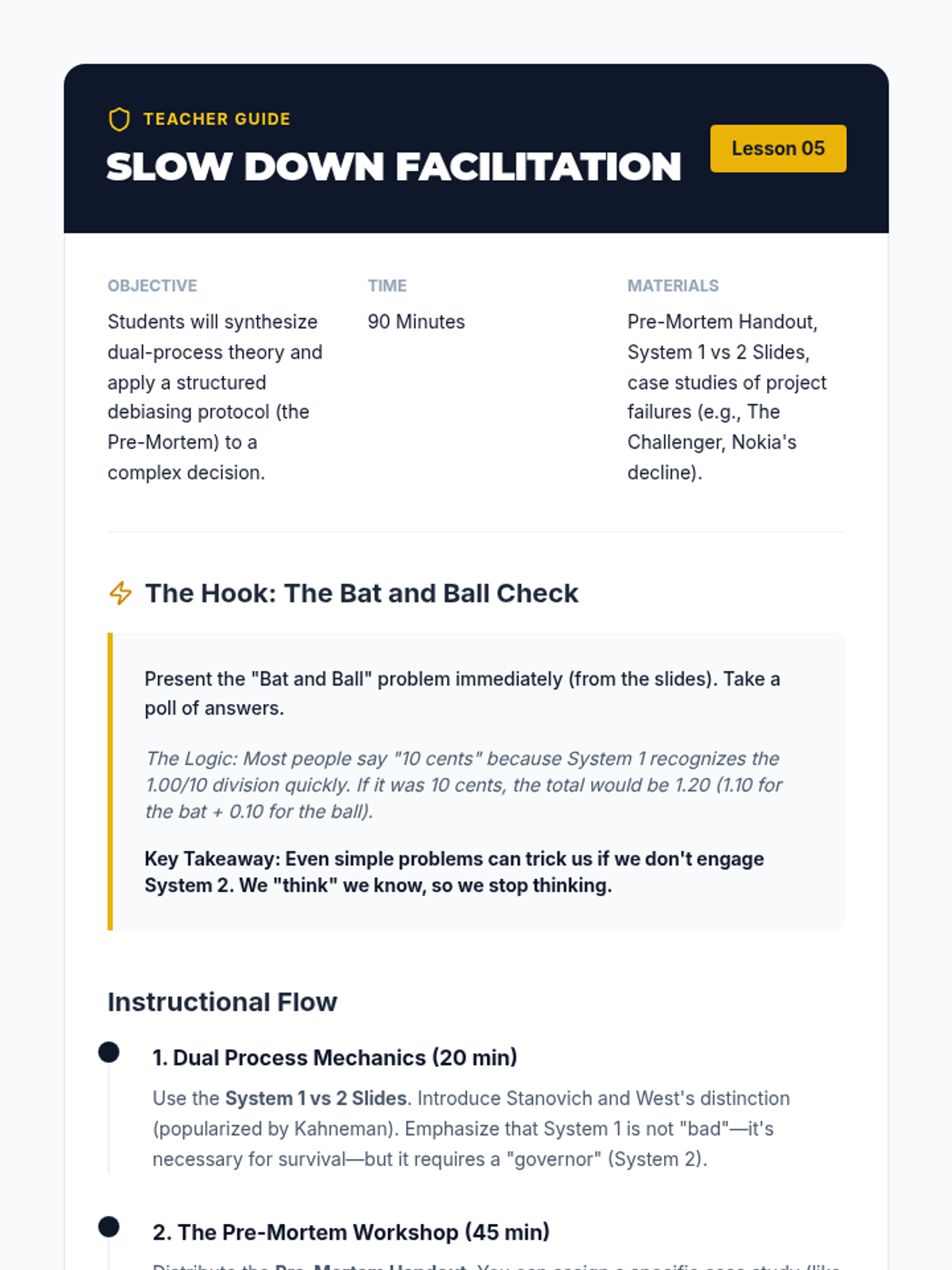 The sequence culminates with an examination of System 1 (fast/intuitive) vs. System 2 (slow/deliberate) thinking. Students develop checklists and protocols designed to force System 2 processing.
