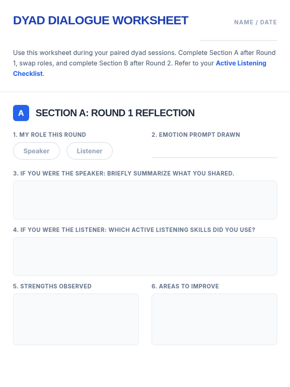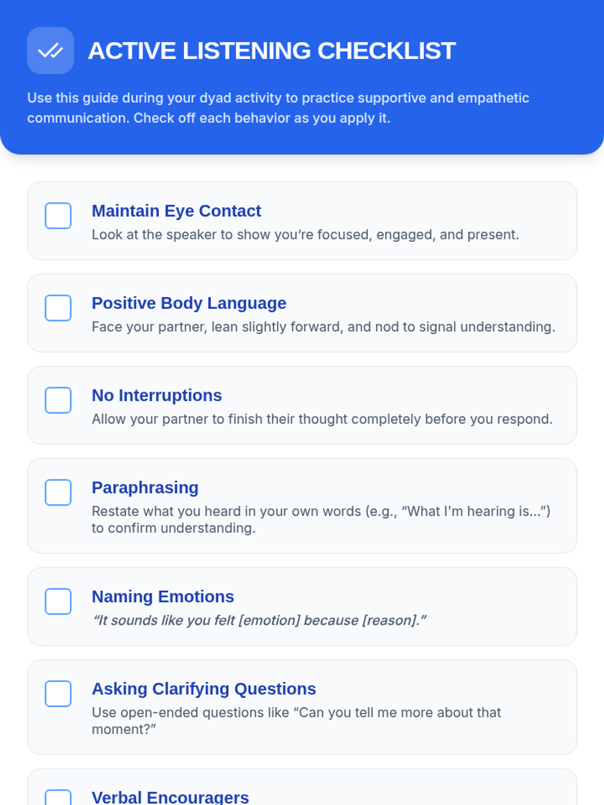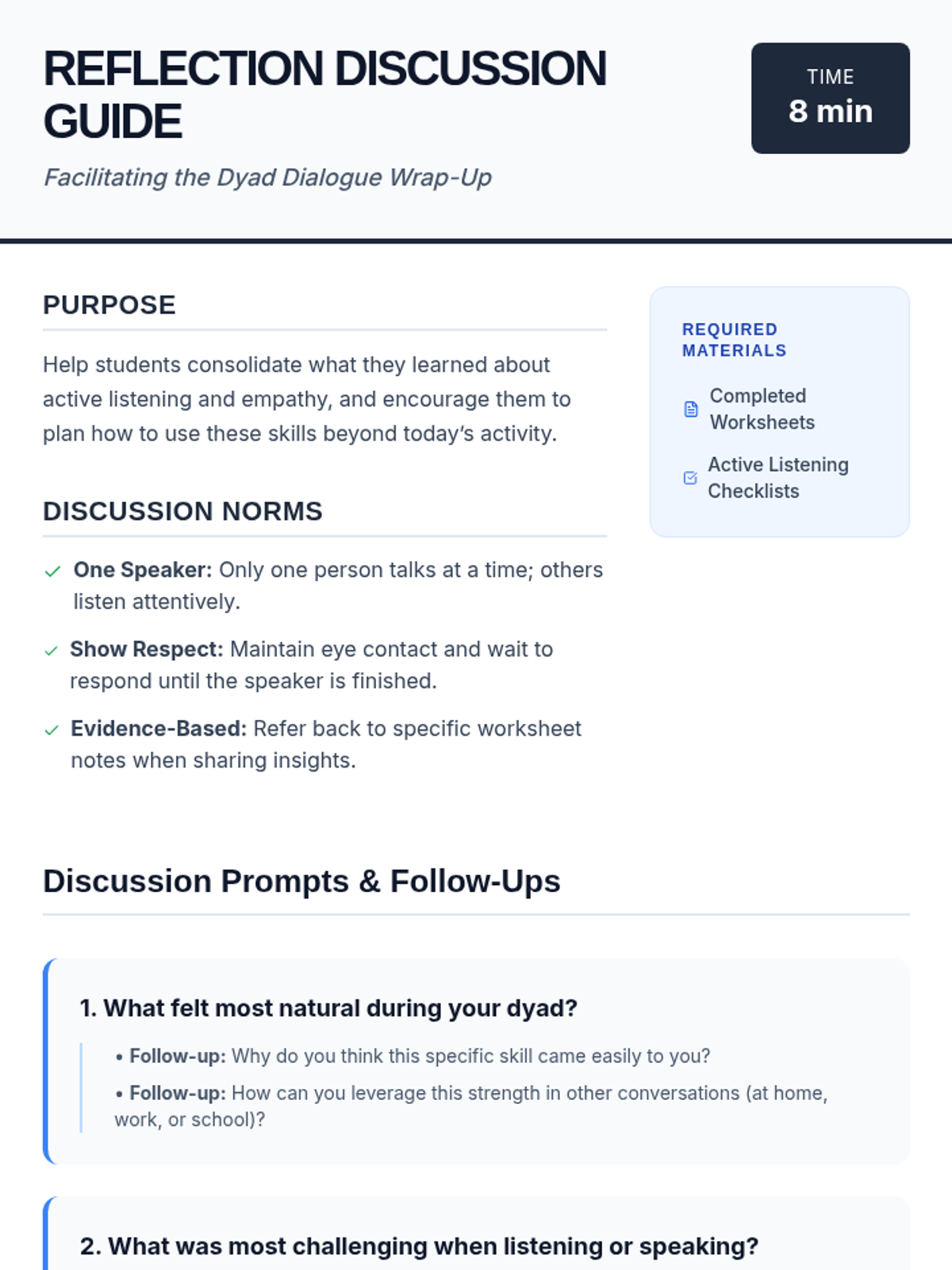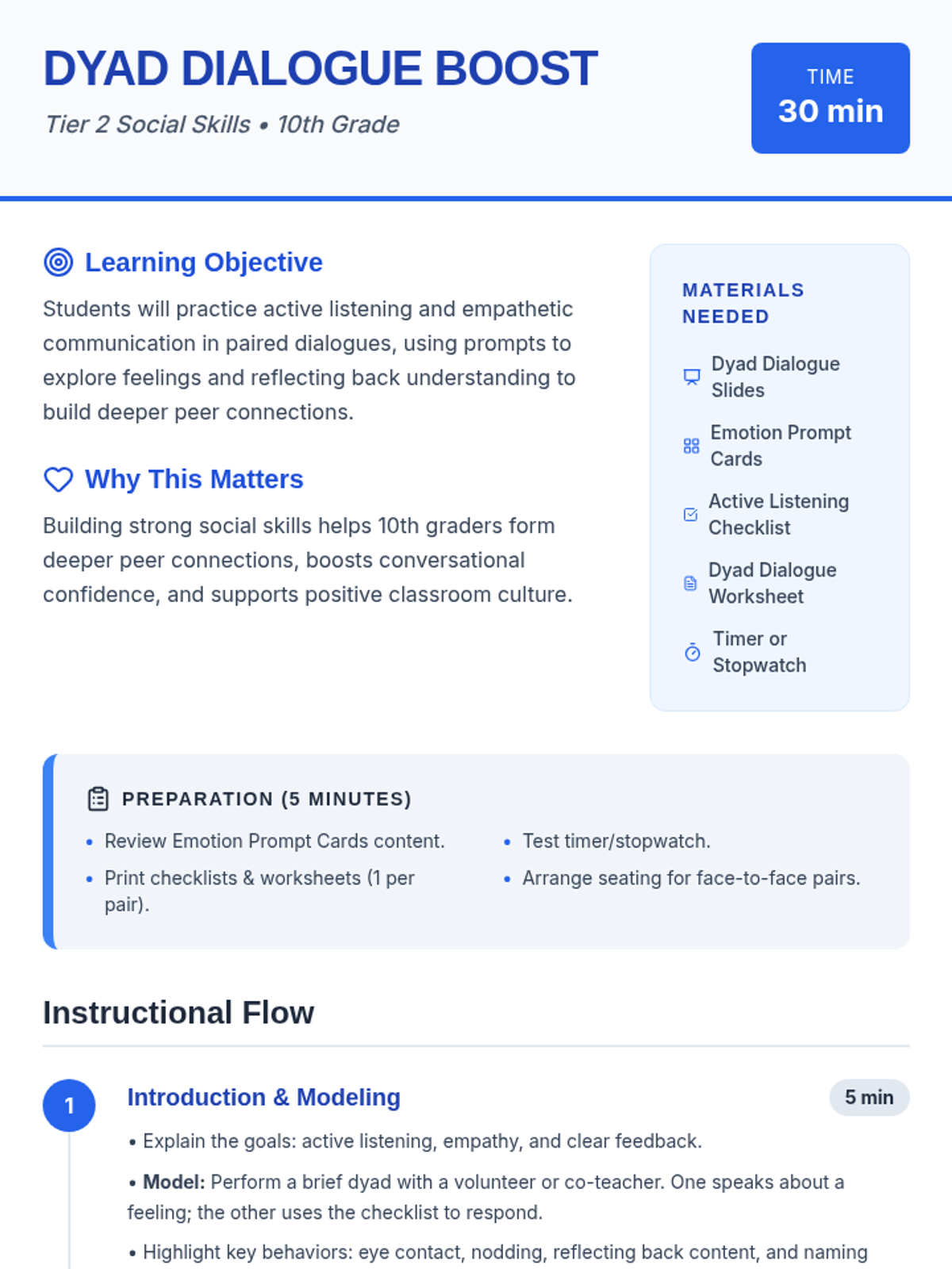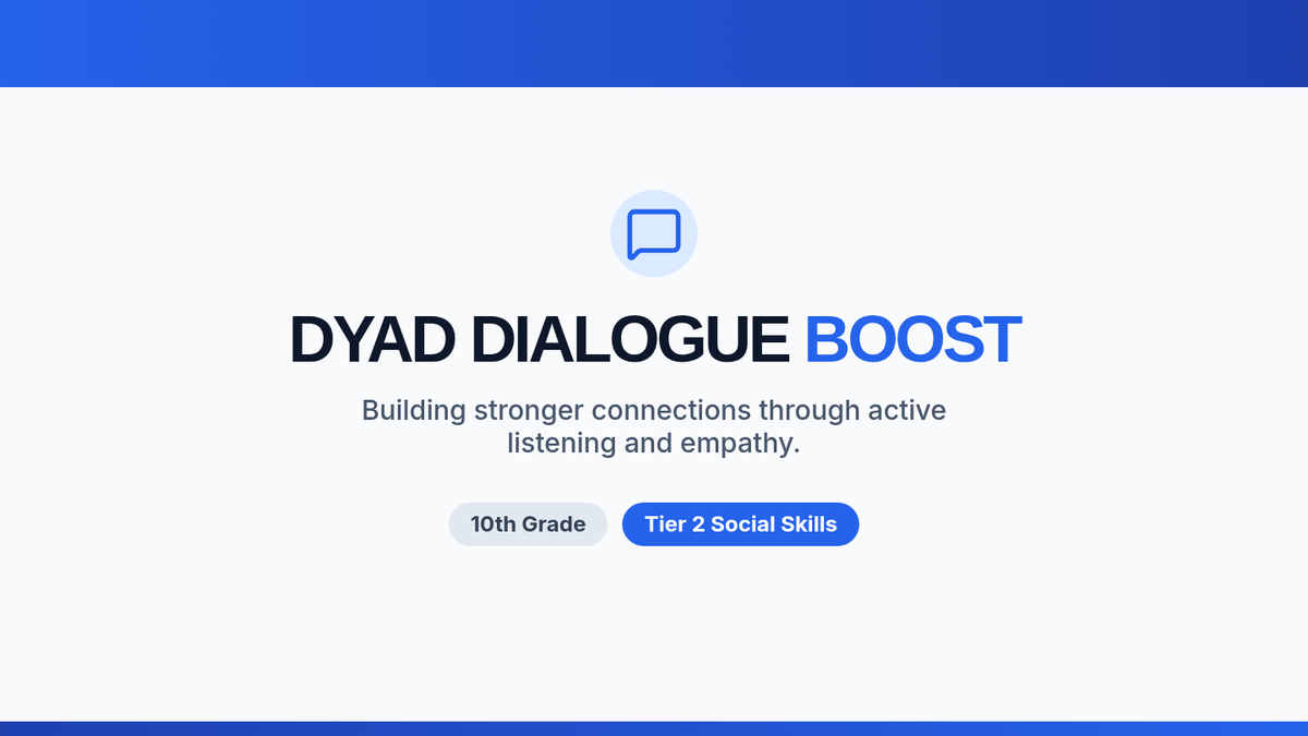 A 30-minute Tier 2 social skills lesson for 10th graders focused on active listening and empathetic communication through structured paired dialogues. Students practice paraphrasing, naming emotions, and providing feedback to strengthen peer connections.