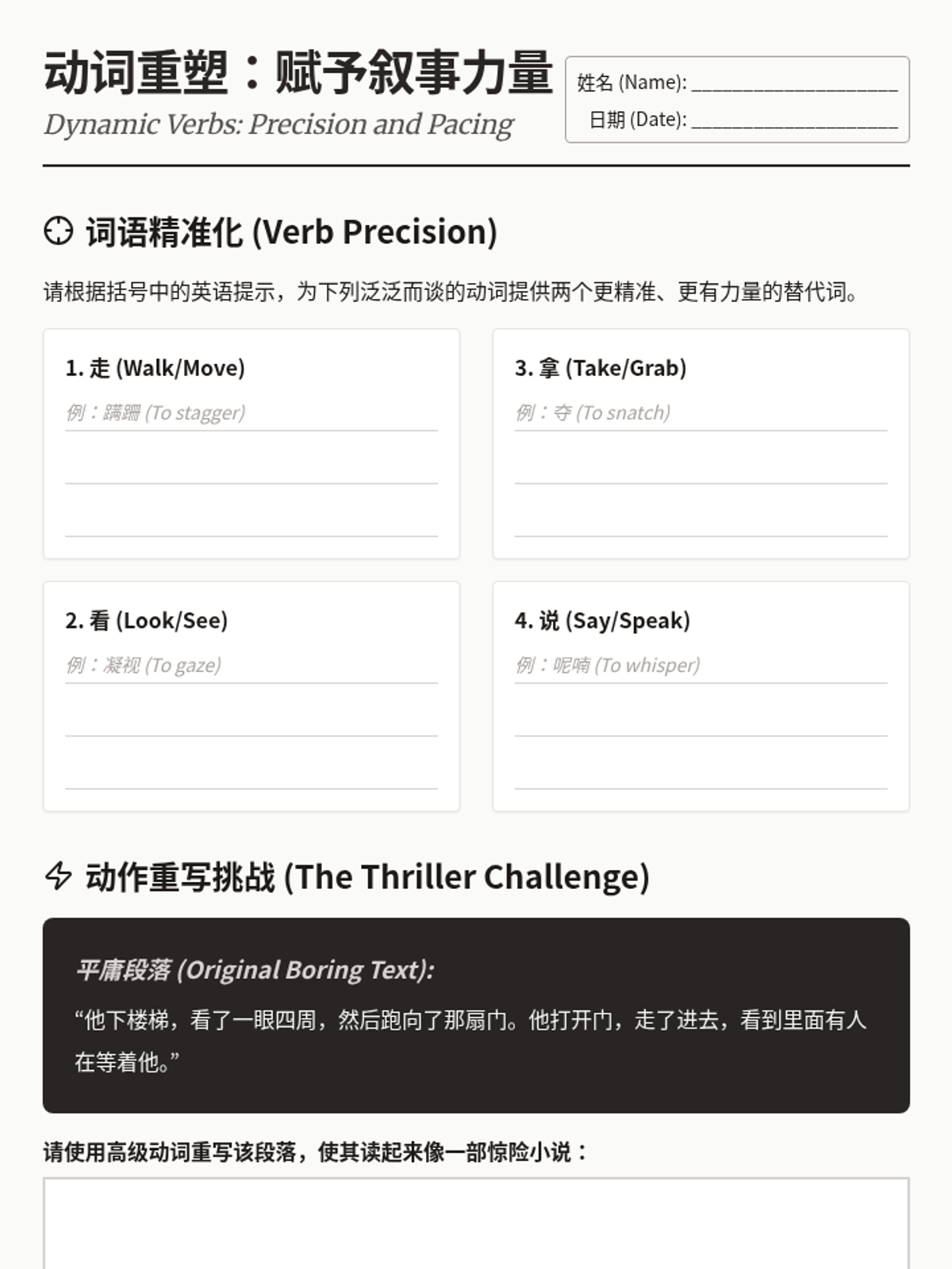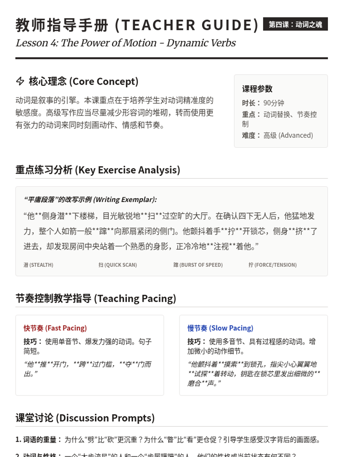 Students refine their prose by replacing generic Mandarin verbs with specific, dynamic ones to control pacing and intensity.
